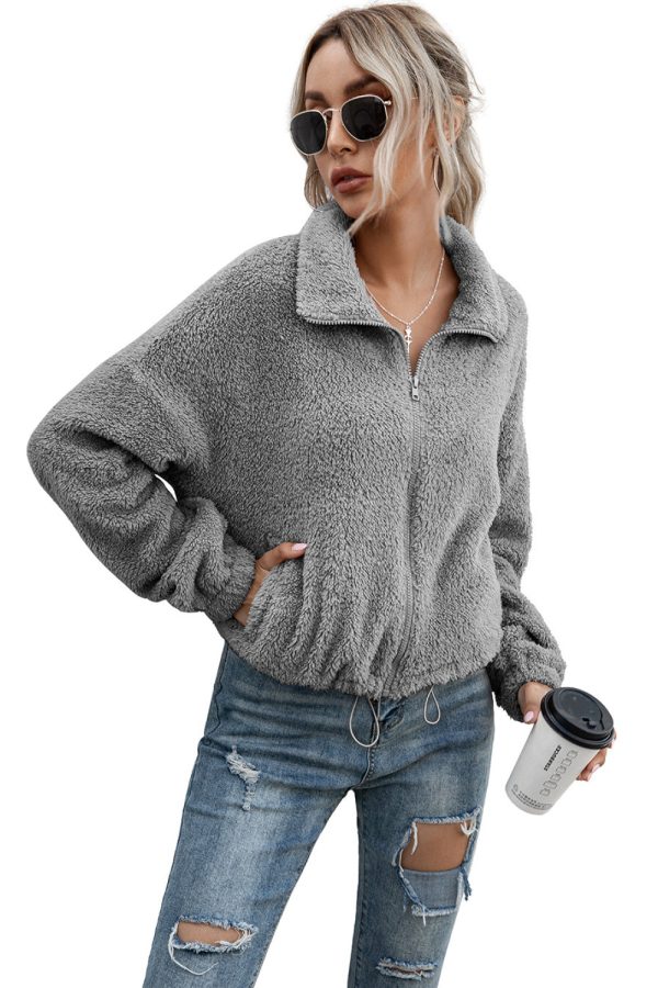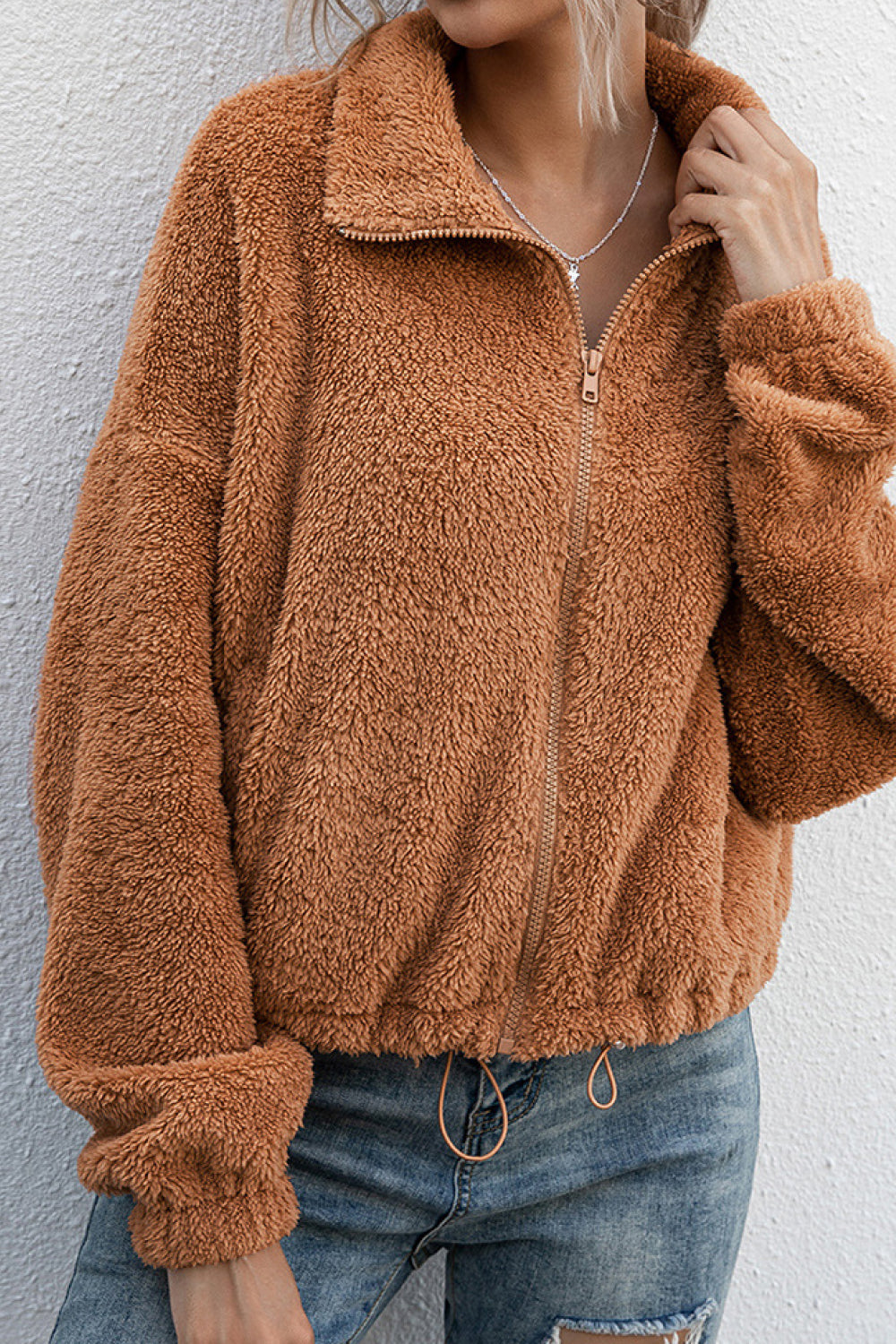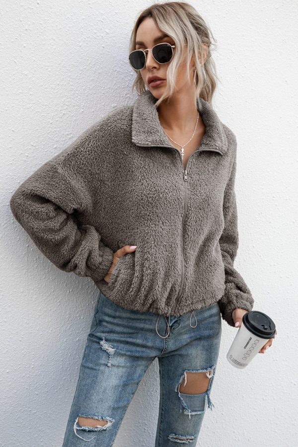 Drawstring Hem Zip Up Teddy Jacket