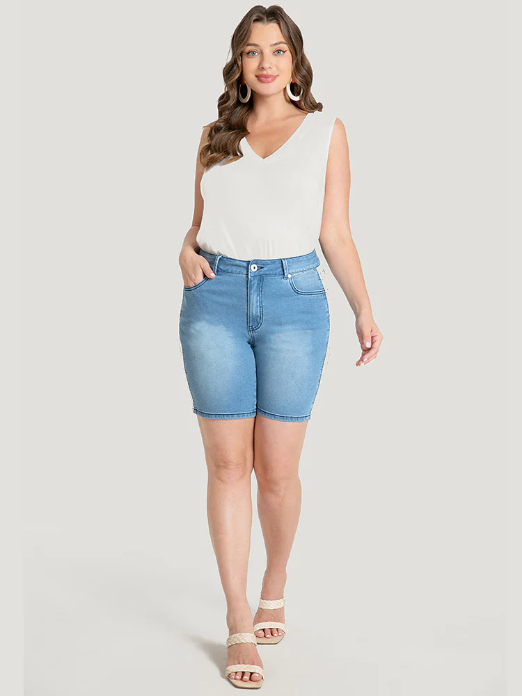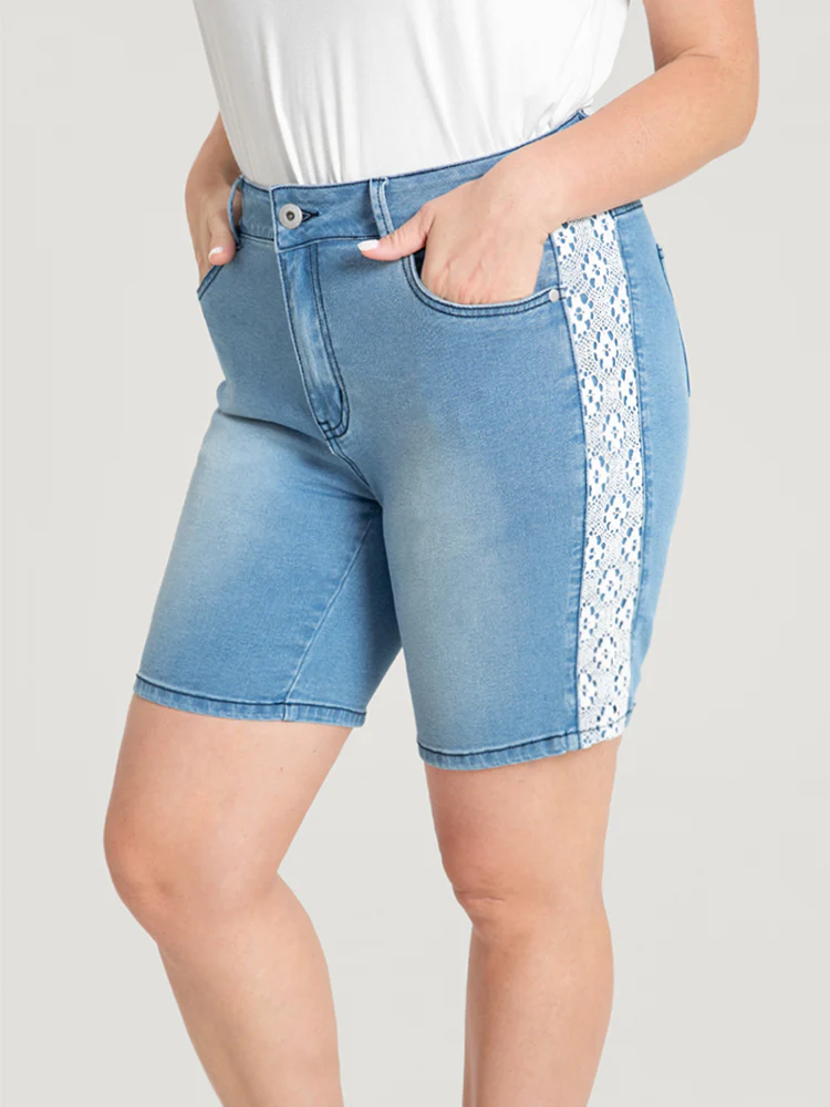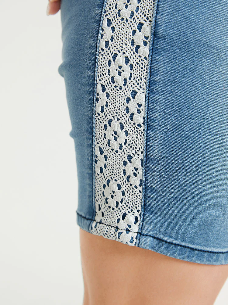 Very Stretchy High Rise Light Wash Contrast Lace Denim Shorts