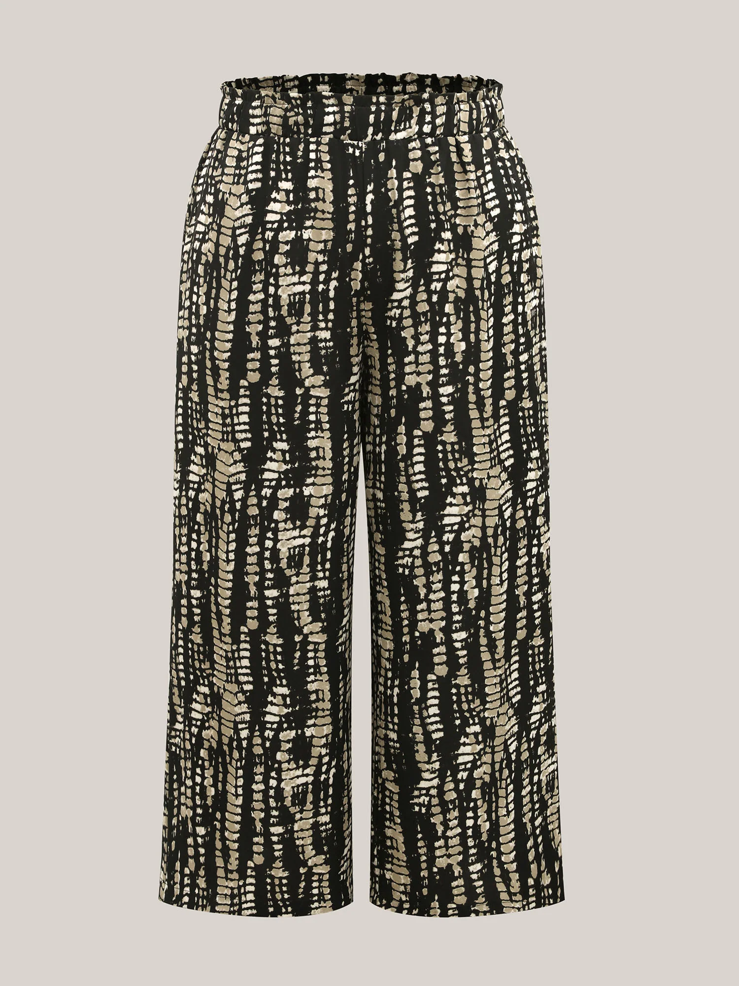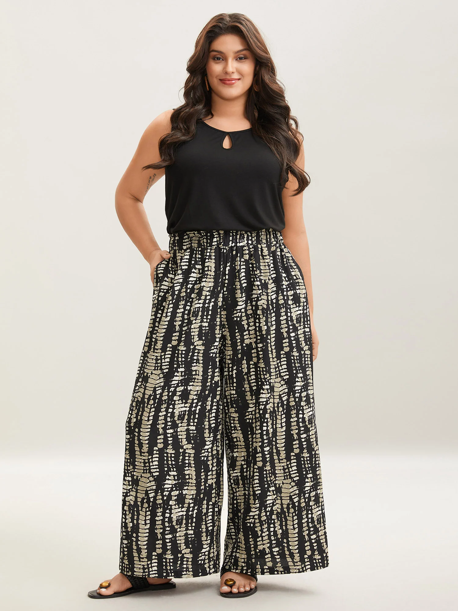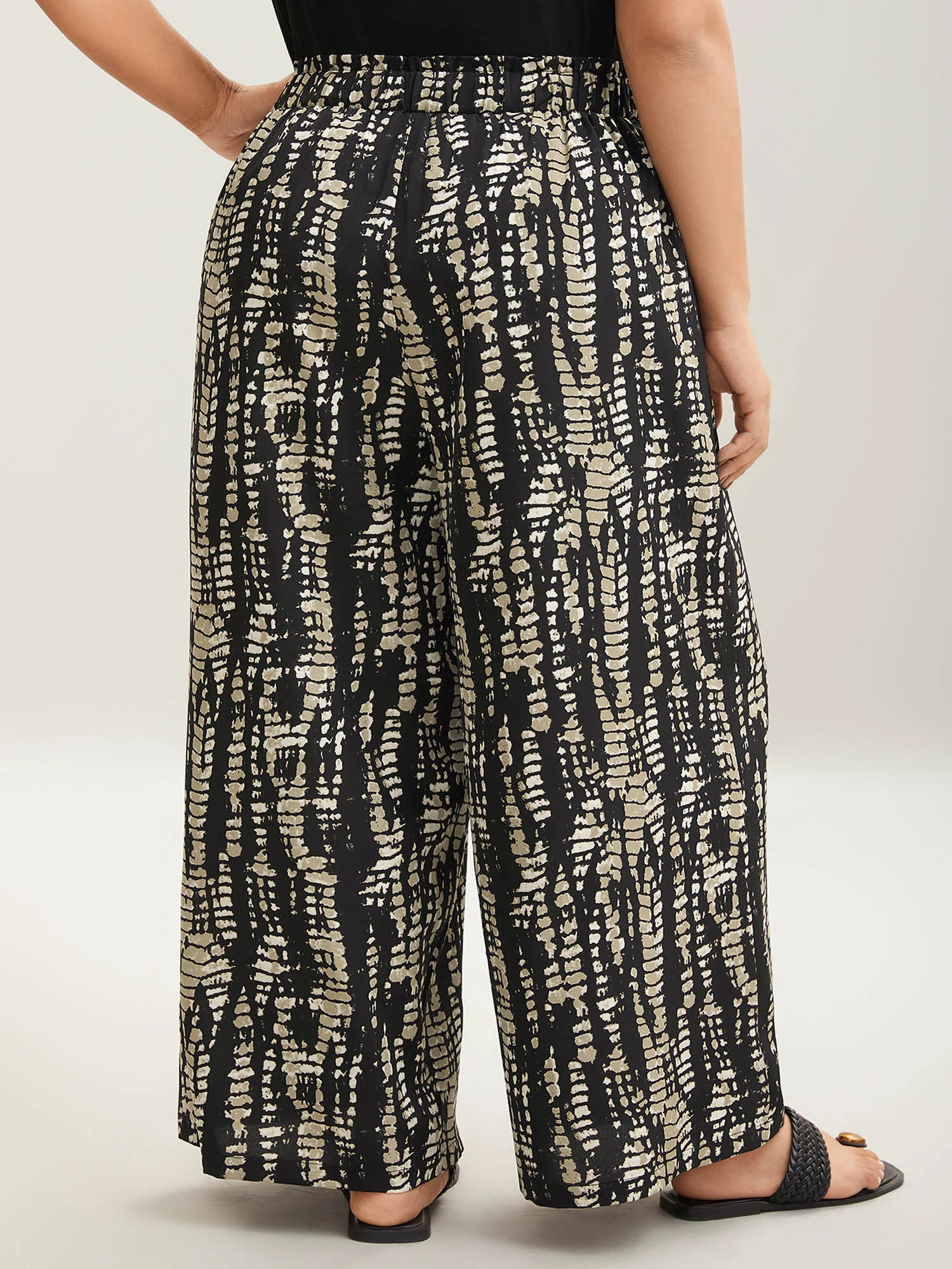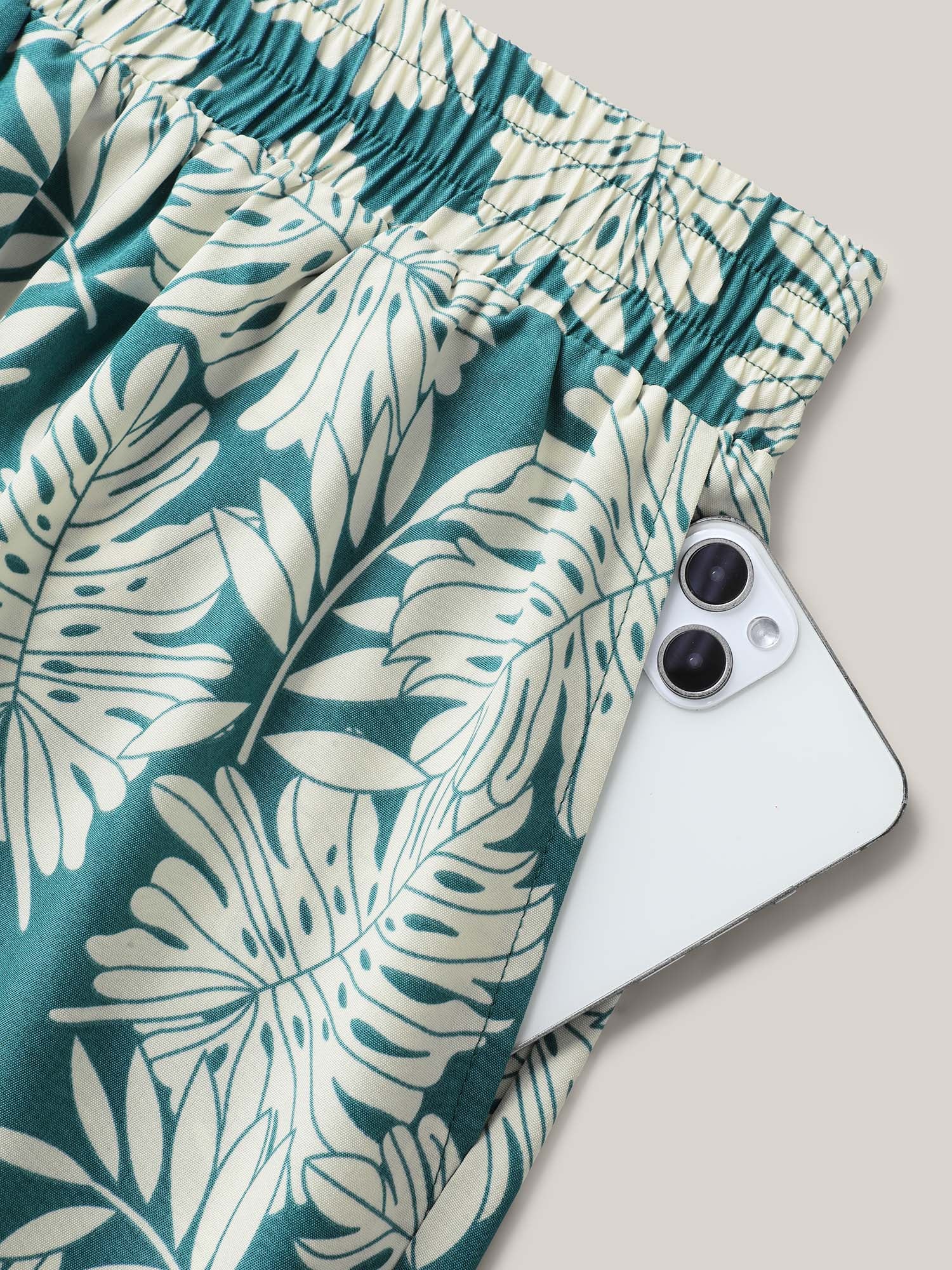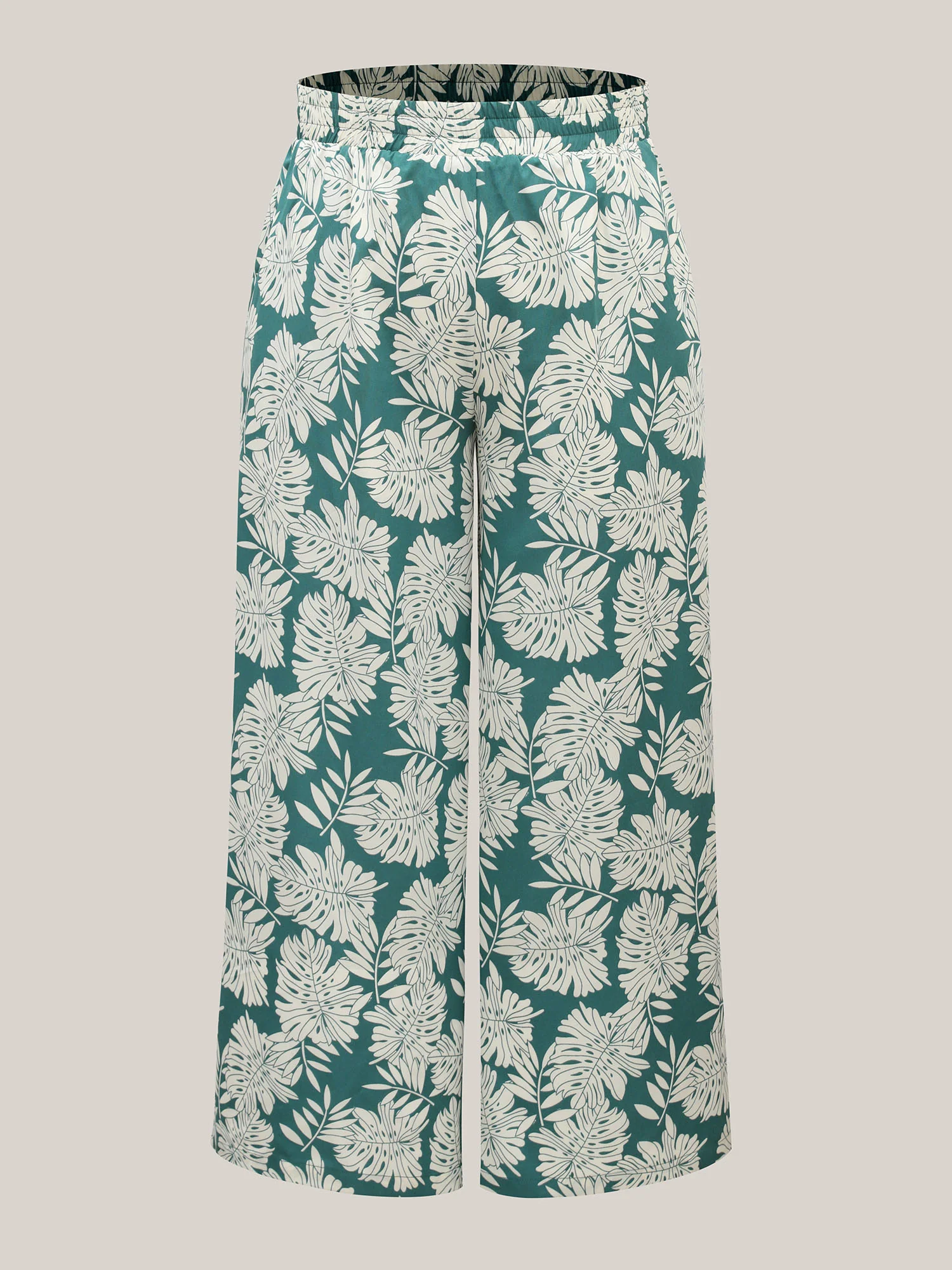 Tropical Leaf Pattern Shirred Wide-Leg Pants