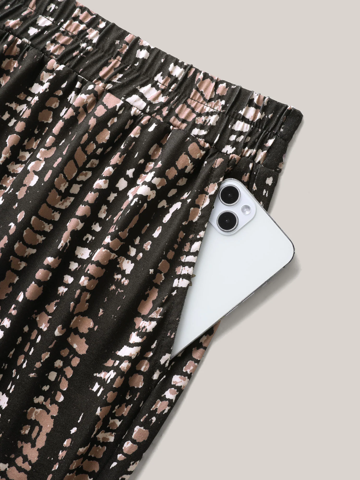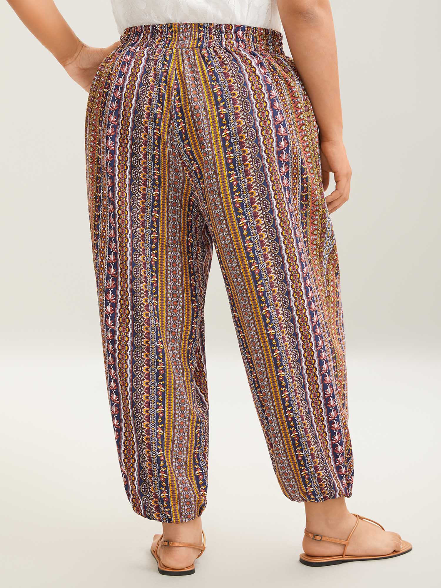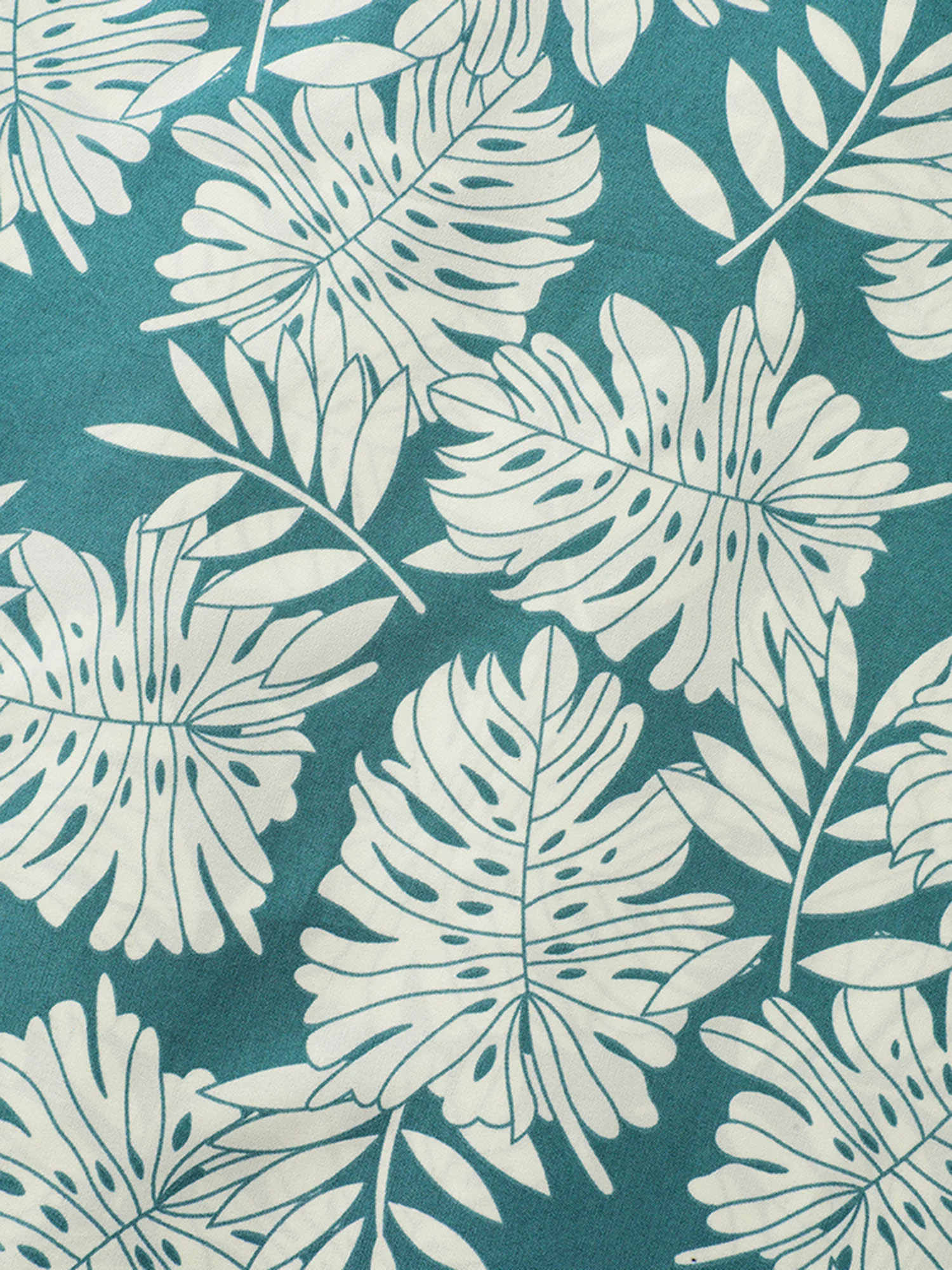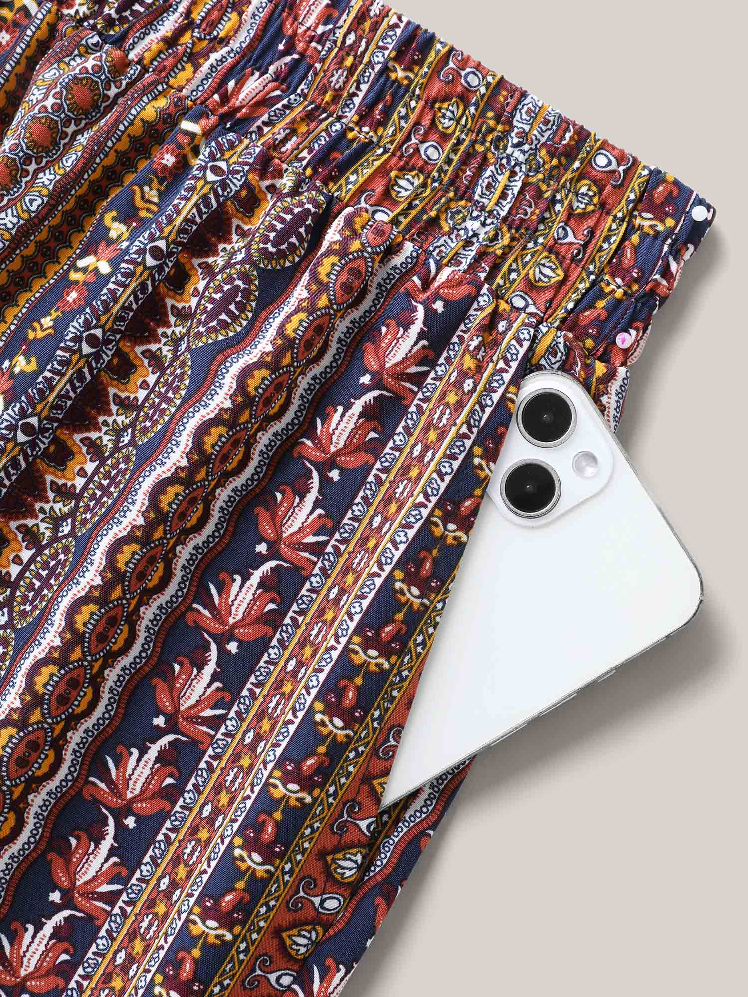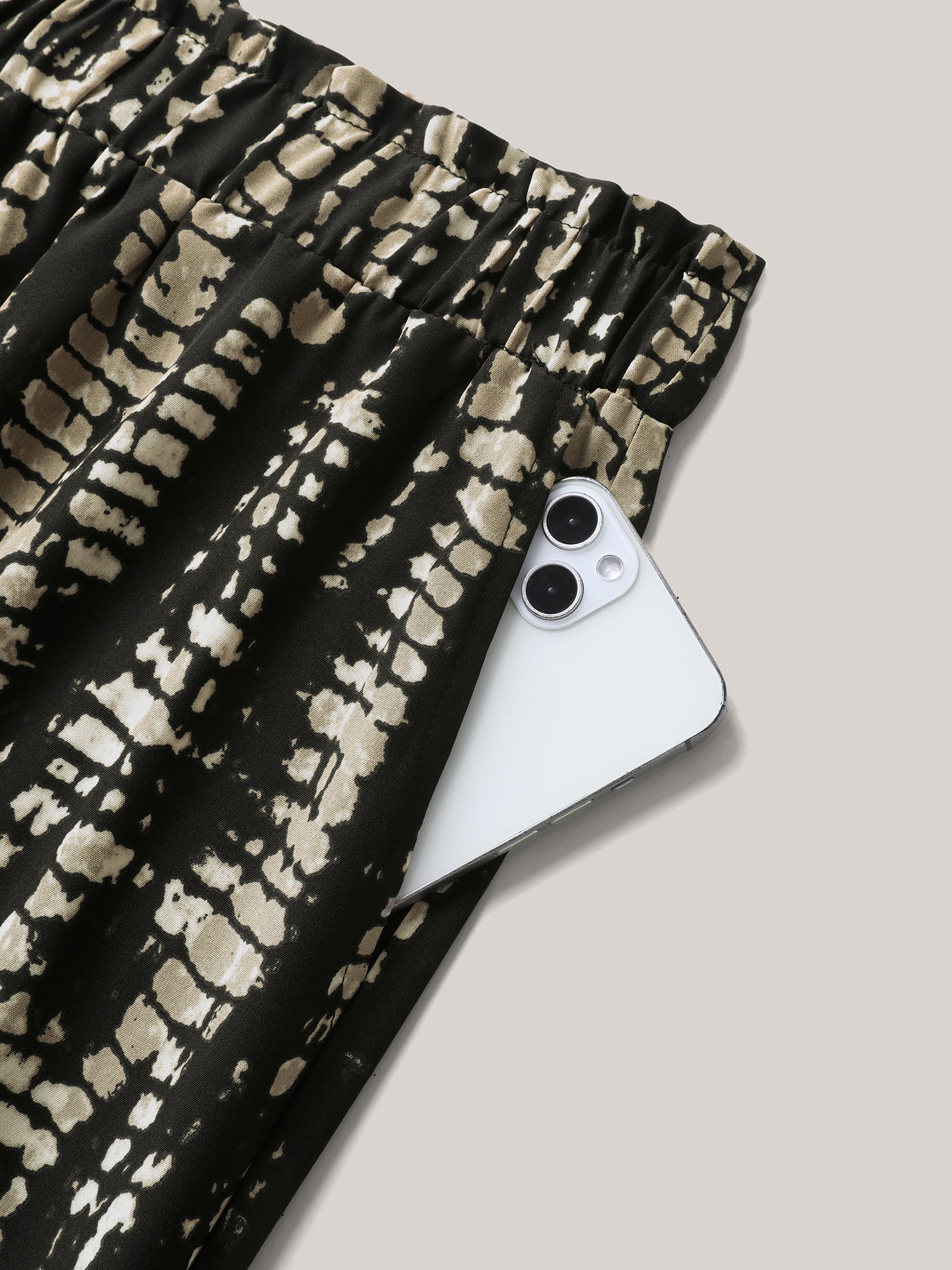 Tropical Leaf Pattern Shirred Wide-Leg Pants