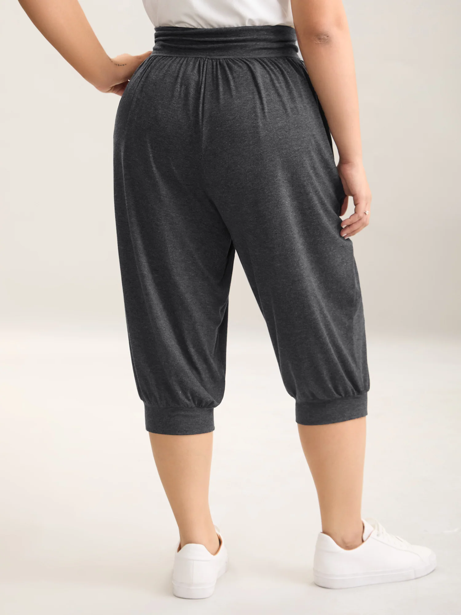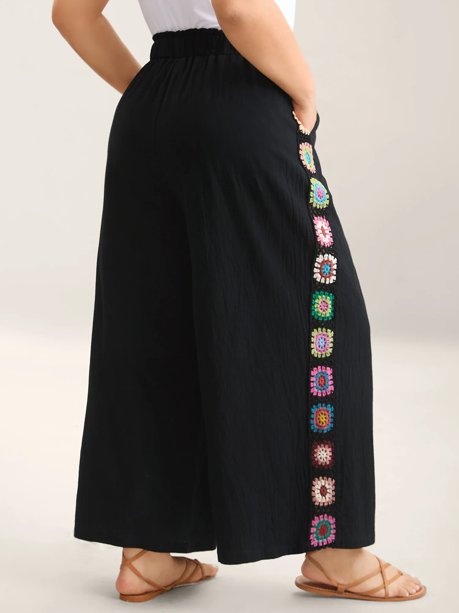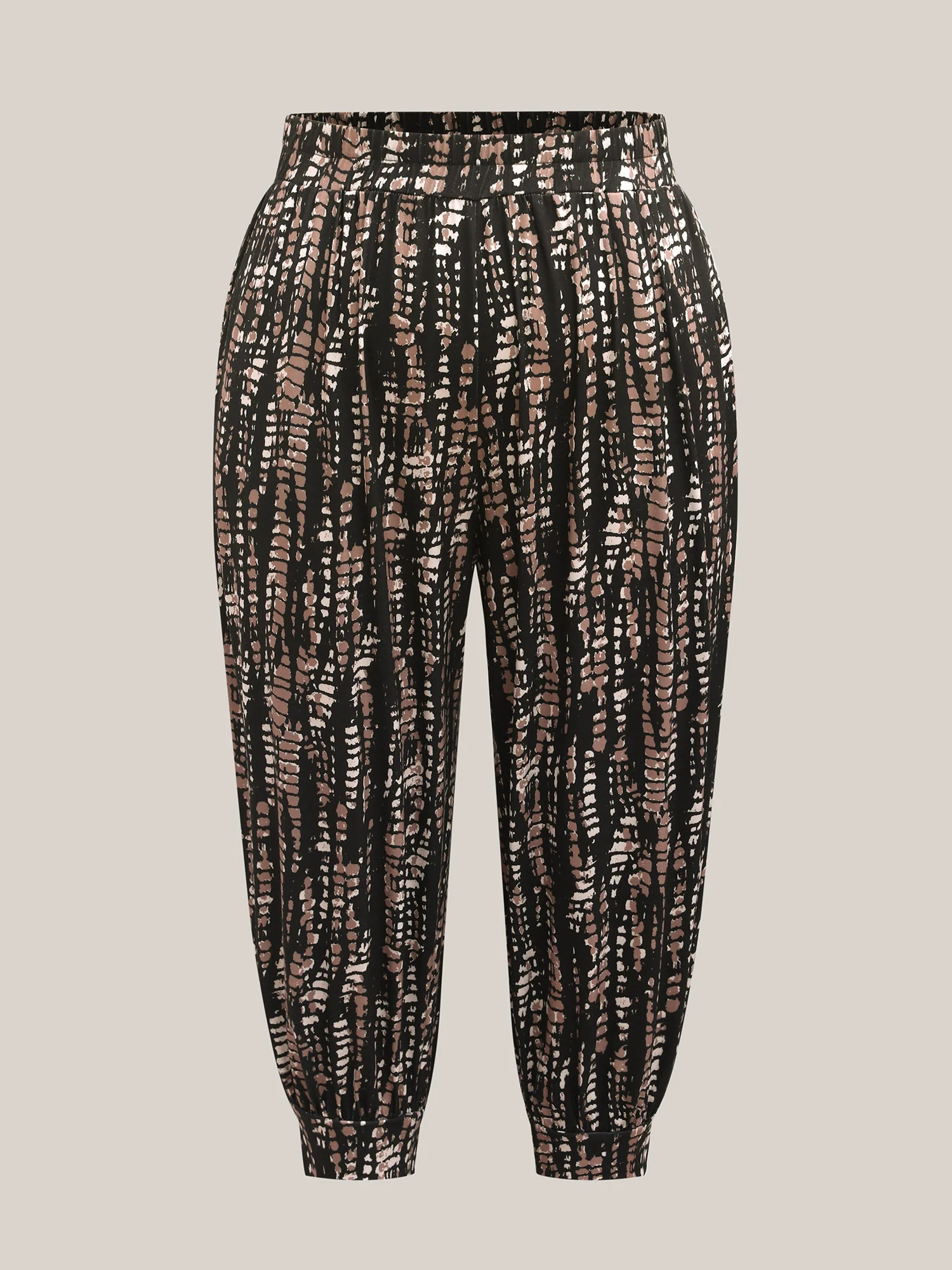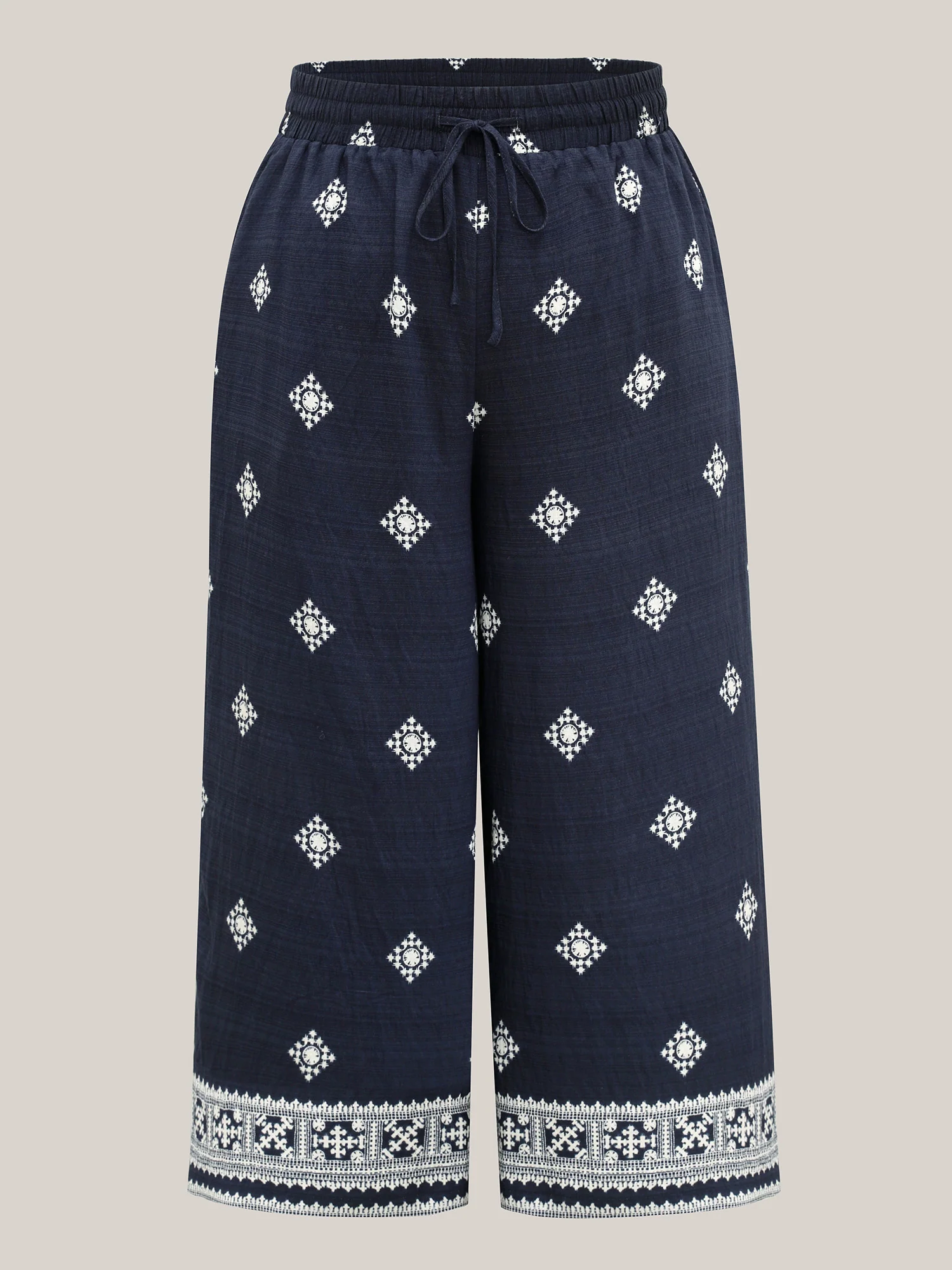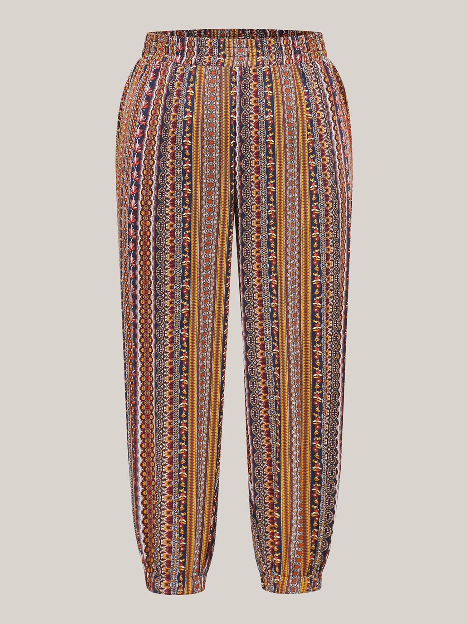 Tropical Leaf Pattern Shirred Wide-Leg Pants