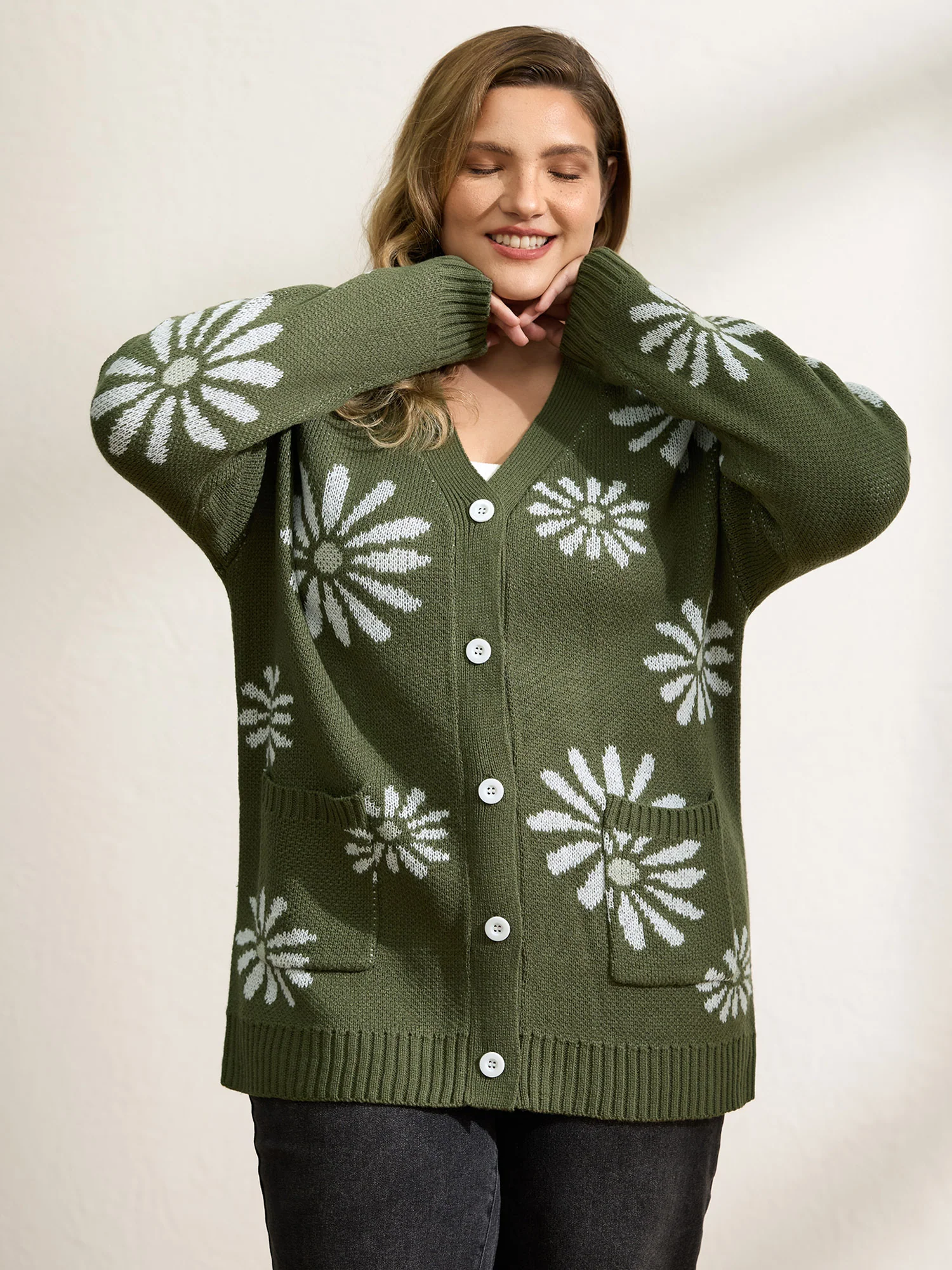 Floral Jacquard Button Pockets Knit Cardigan