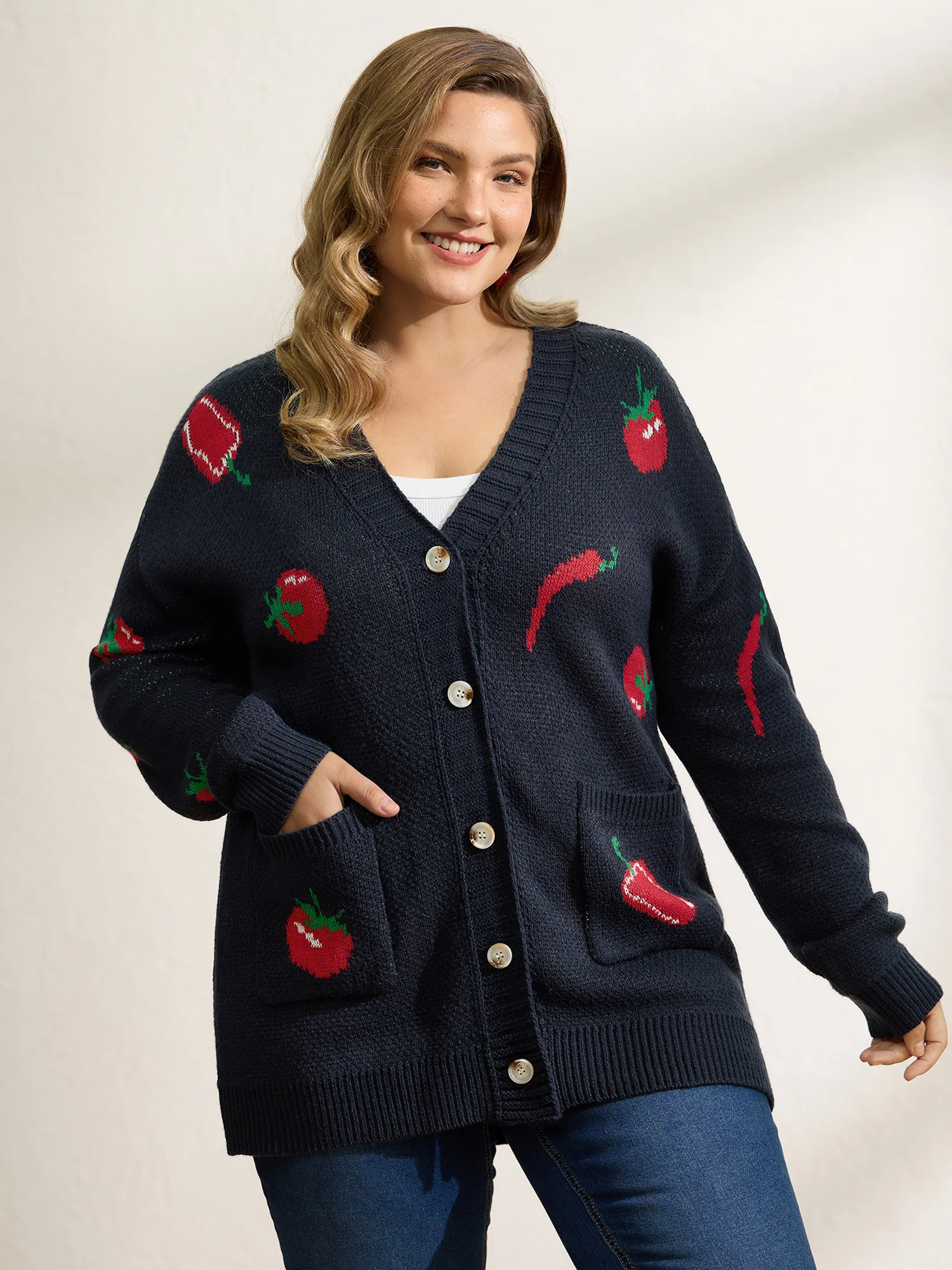 Tomato Chili Print Button Knit Cardigan