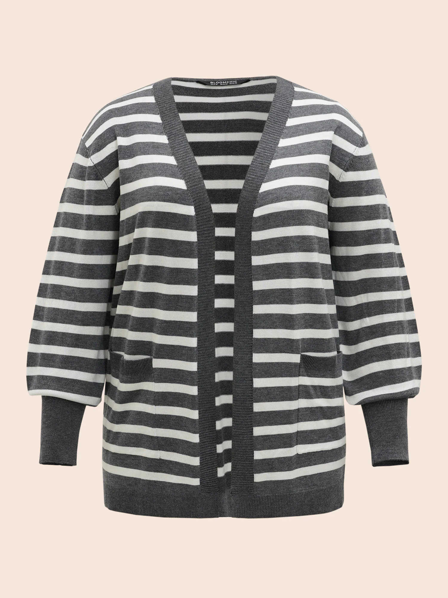 Striped Lantern Sleeve Patched Pocket Cardigan
