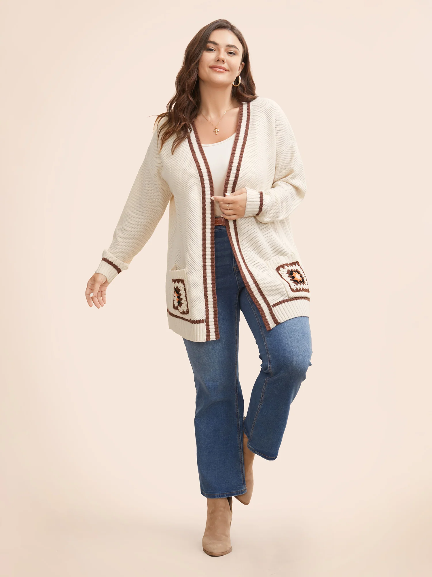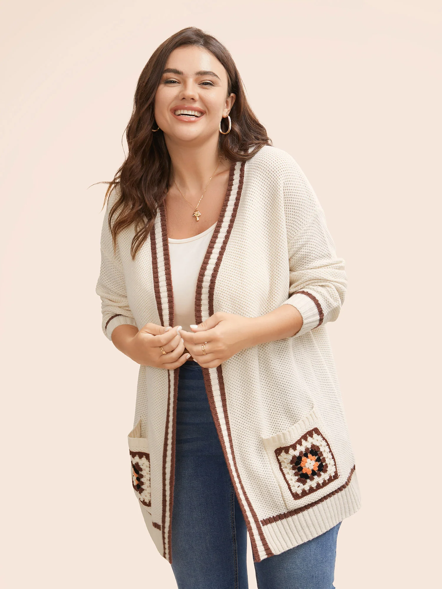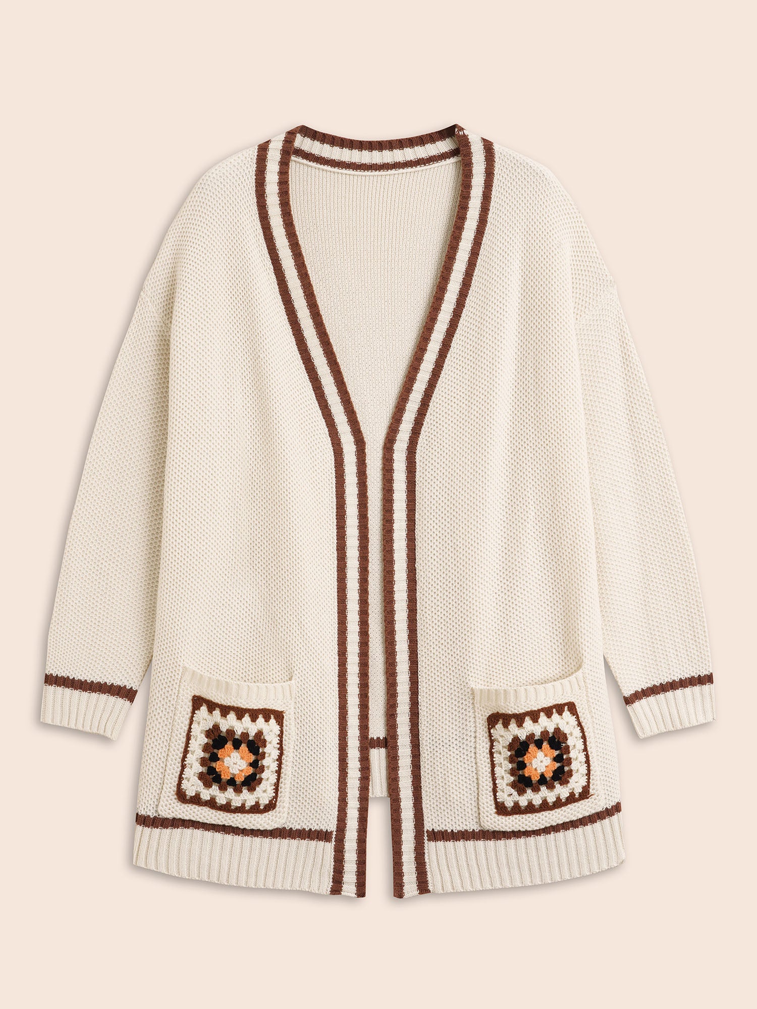 Crochet Floral Patch Pocket Drop Shoulder Cardigan