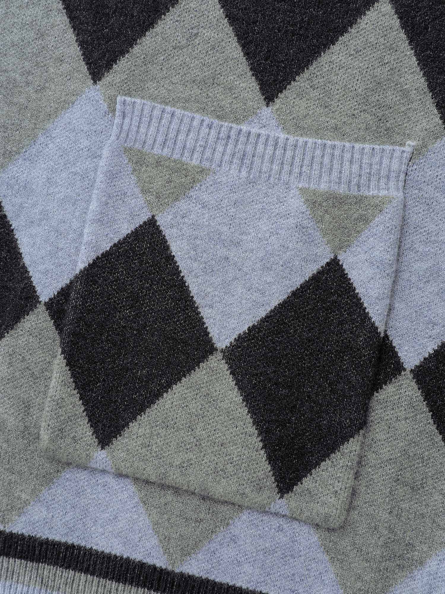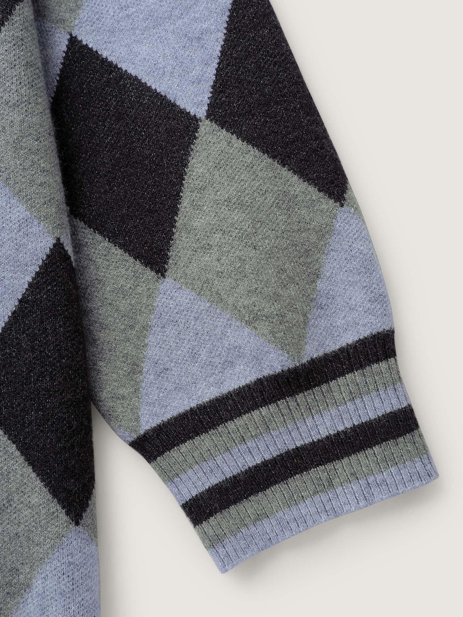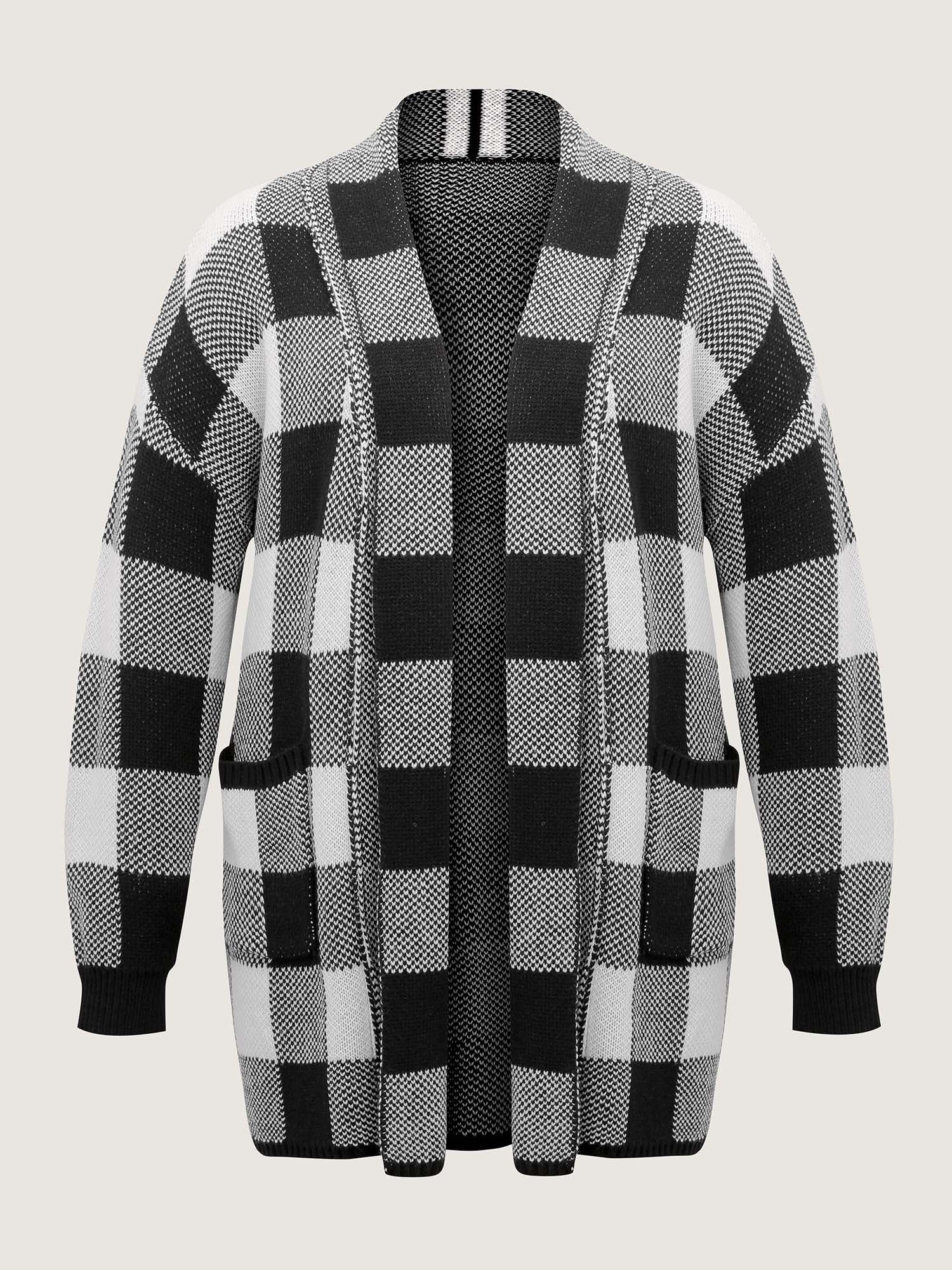 Checkered Jacquard Folded Collar Knit Cardigan