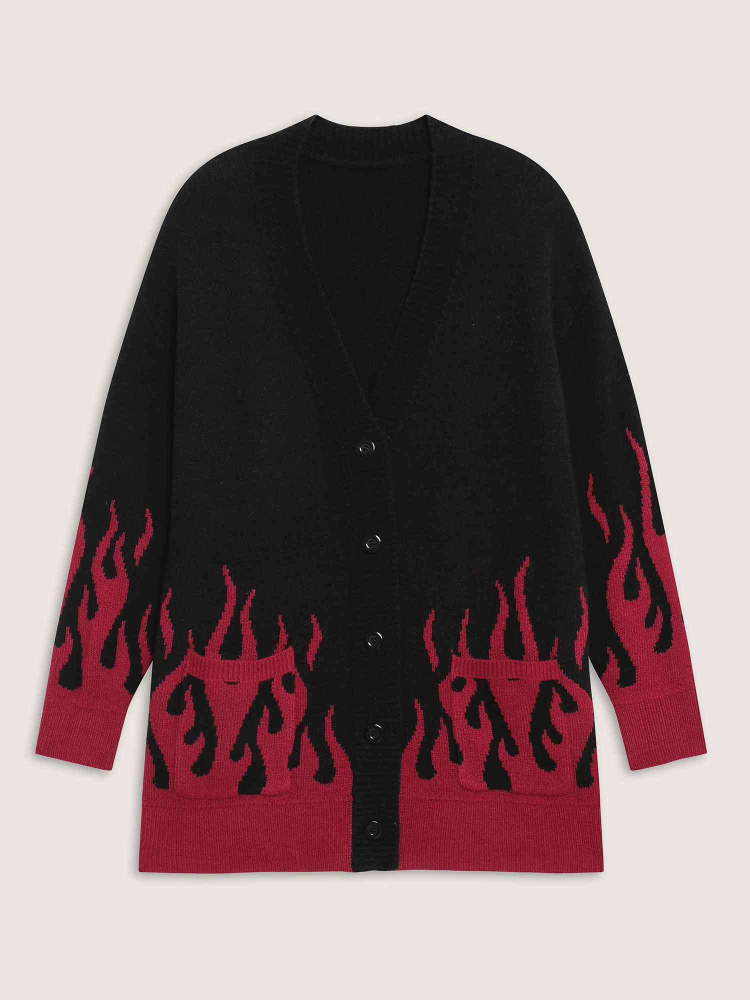 Flame Pattern Ribbed Hem Pockets Knit Cardigan