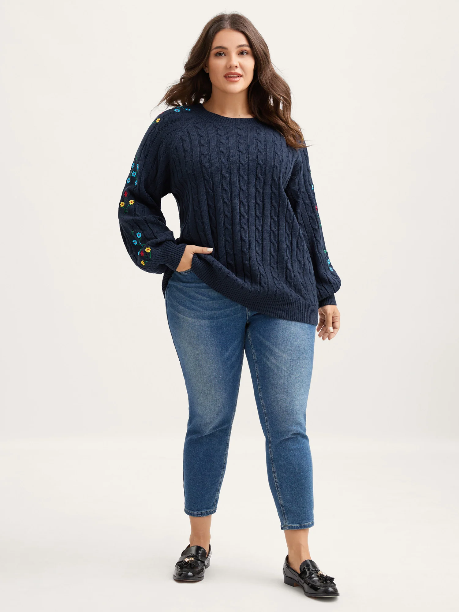 Cable Knit Embroidered Raglan Sleeve Pullover