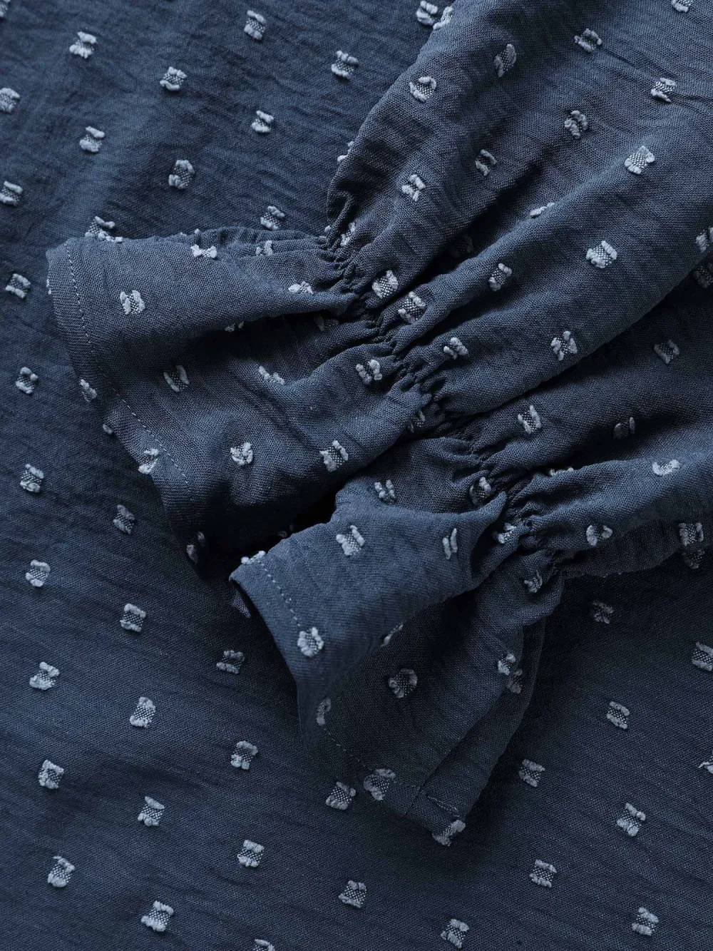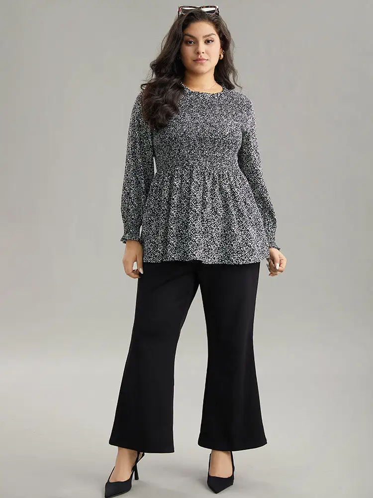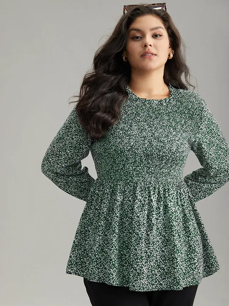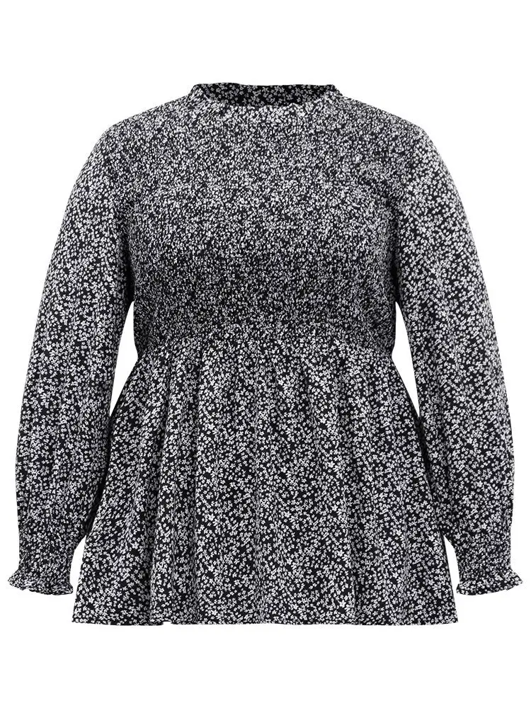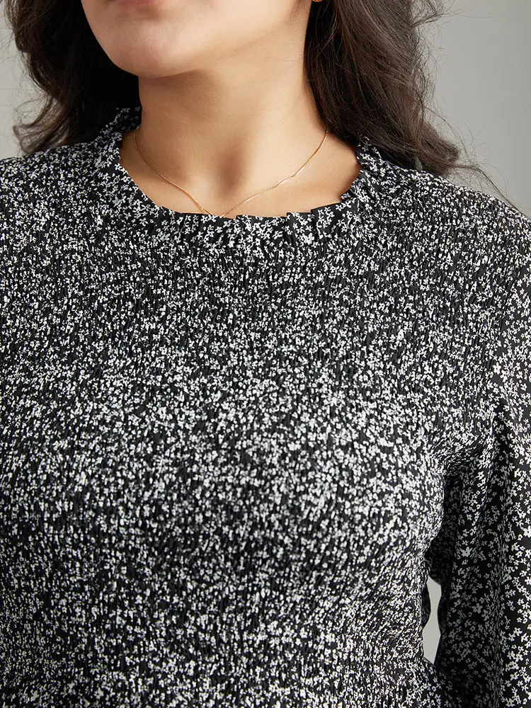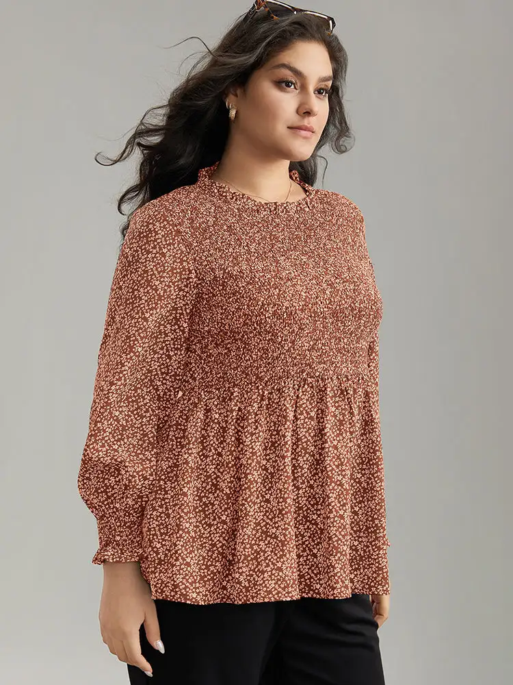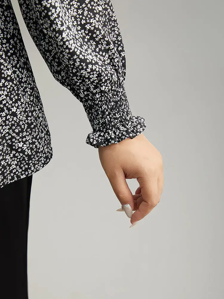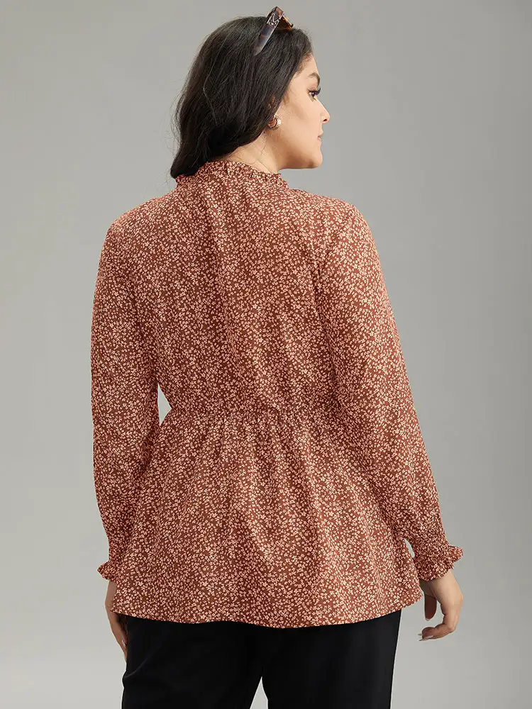 Ditsy Floral Stand Collar Shirred Frill Trim Blouse