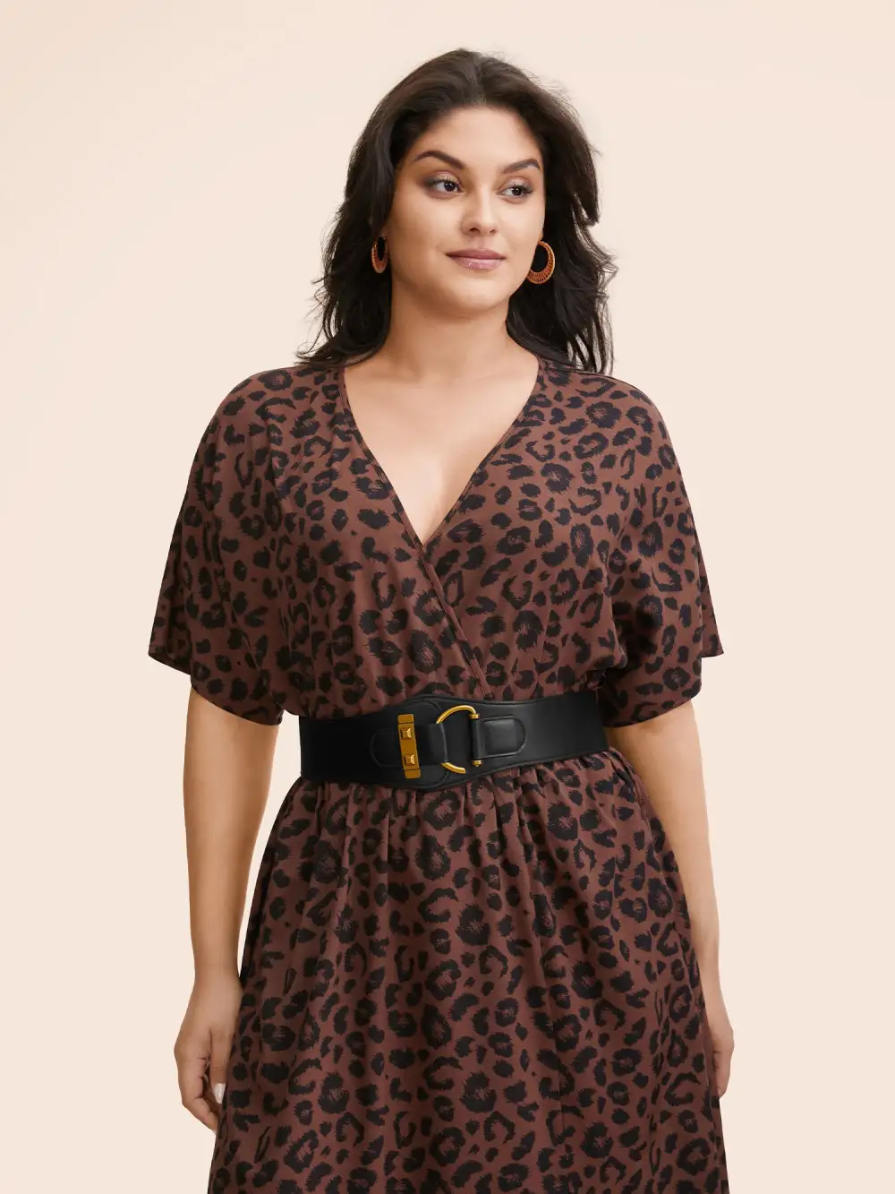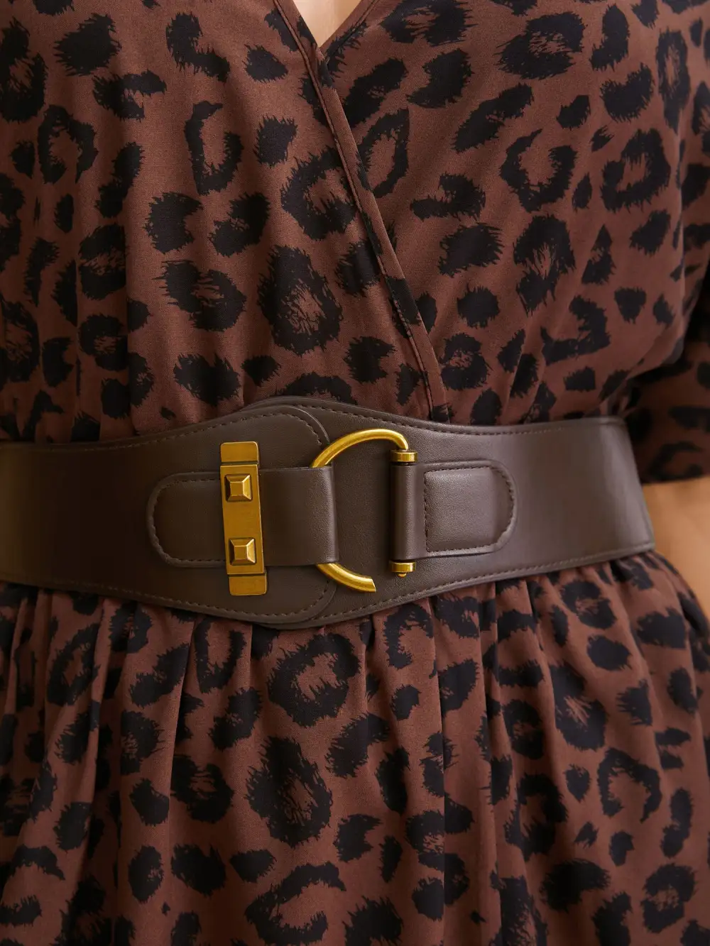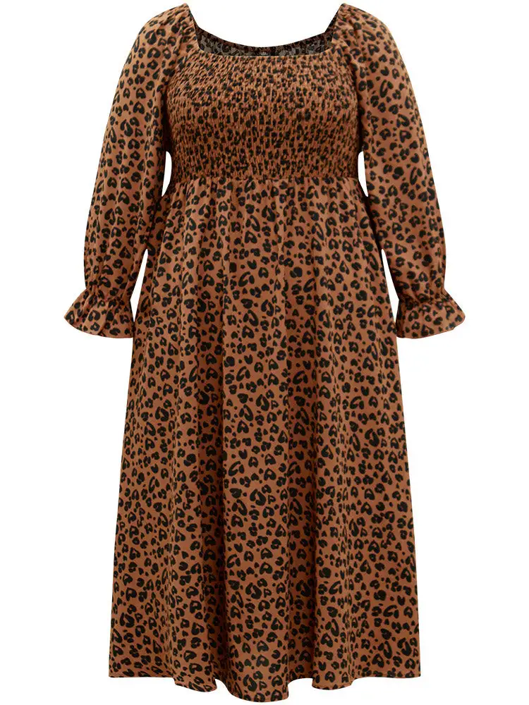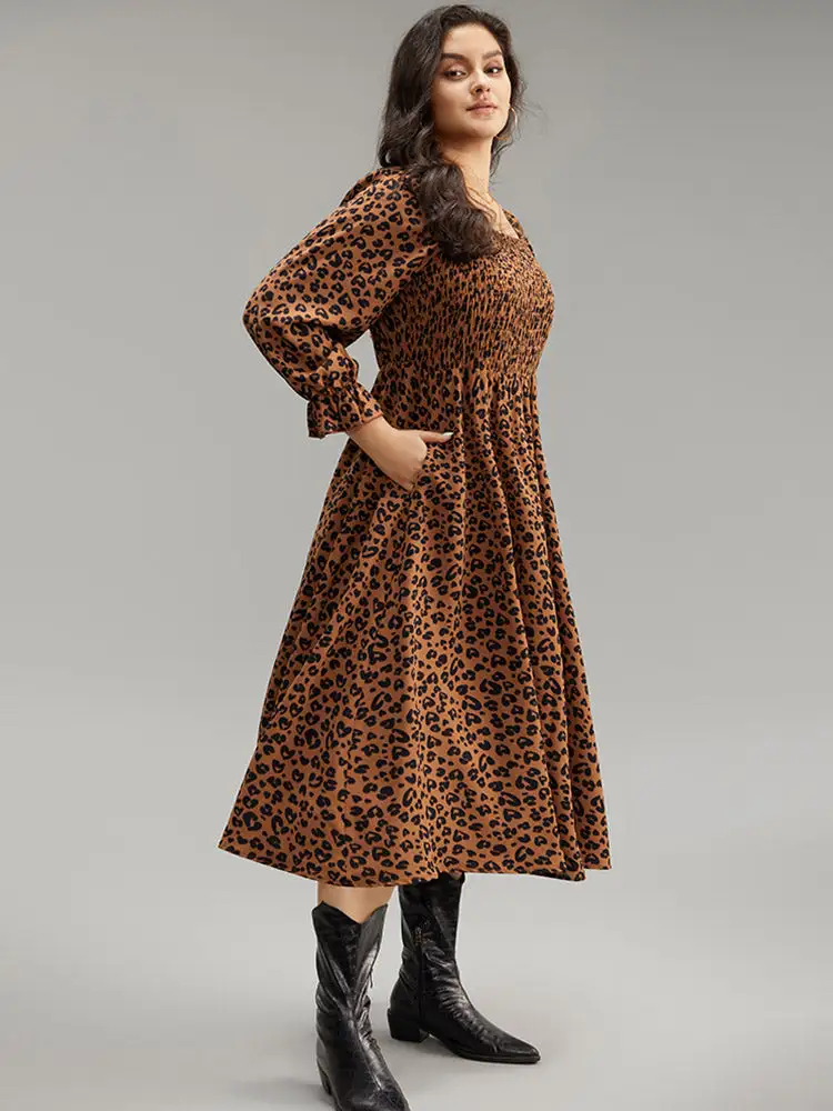 Leopard Print Shirred Square Neck Pocket Dress