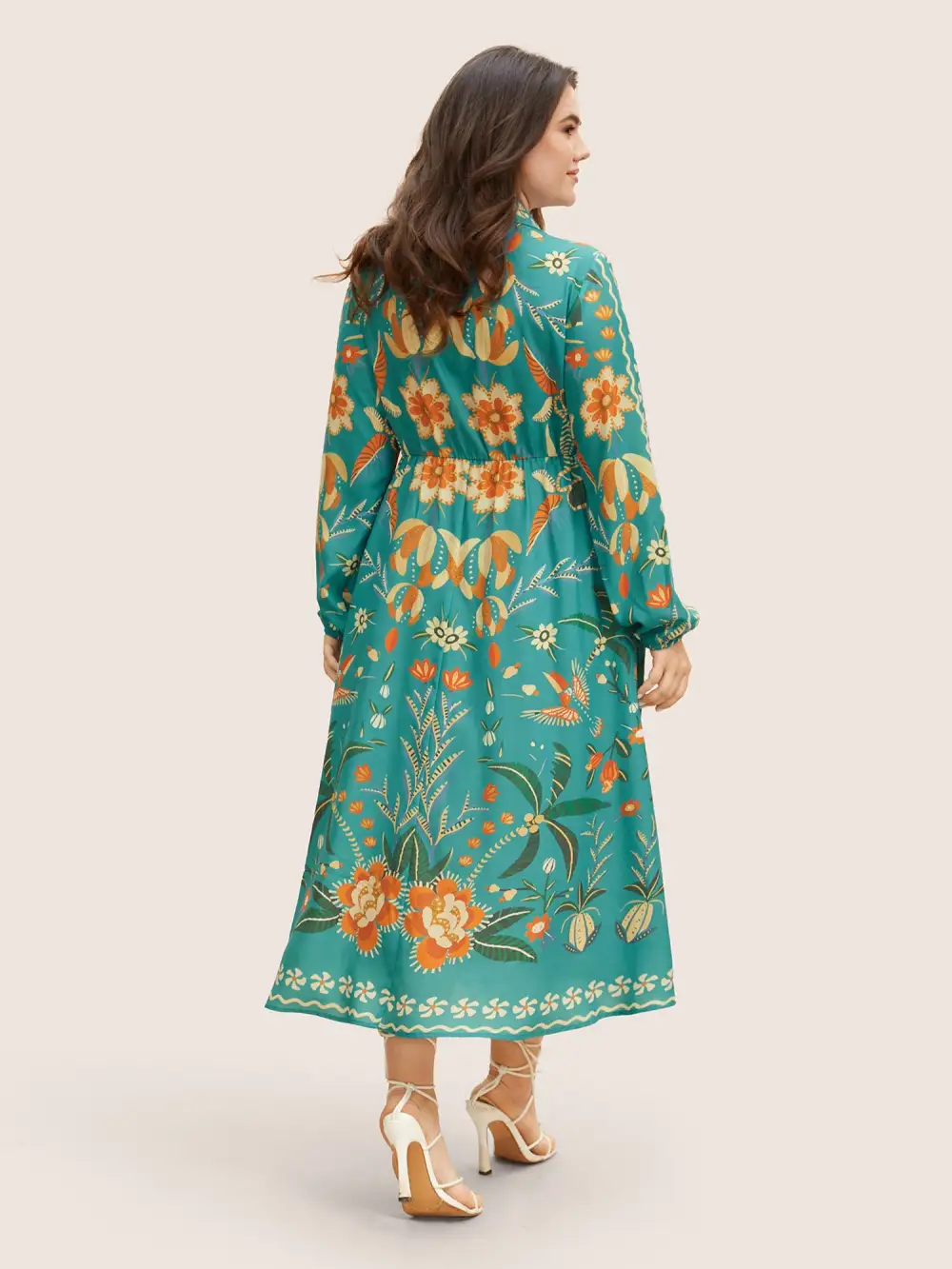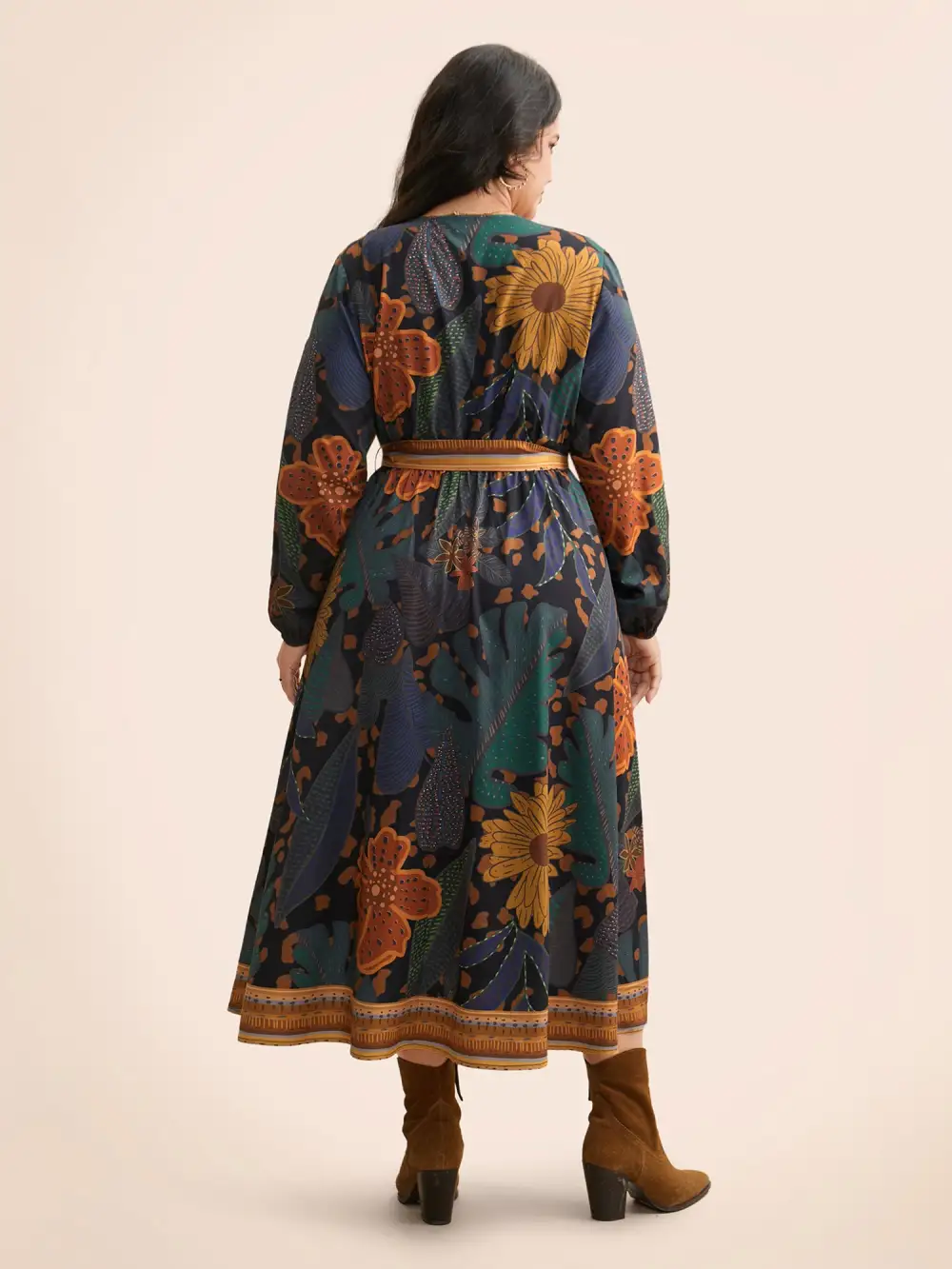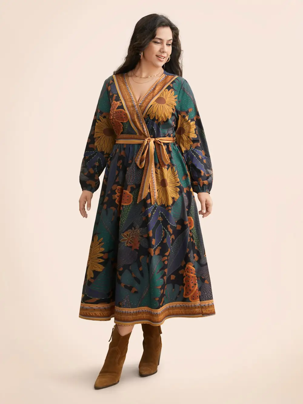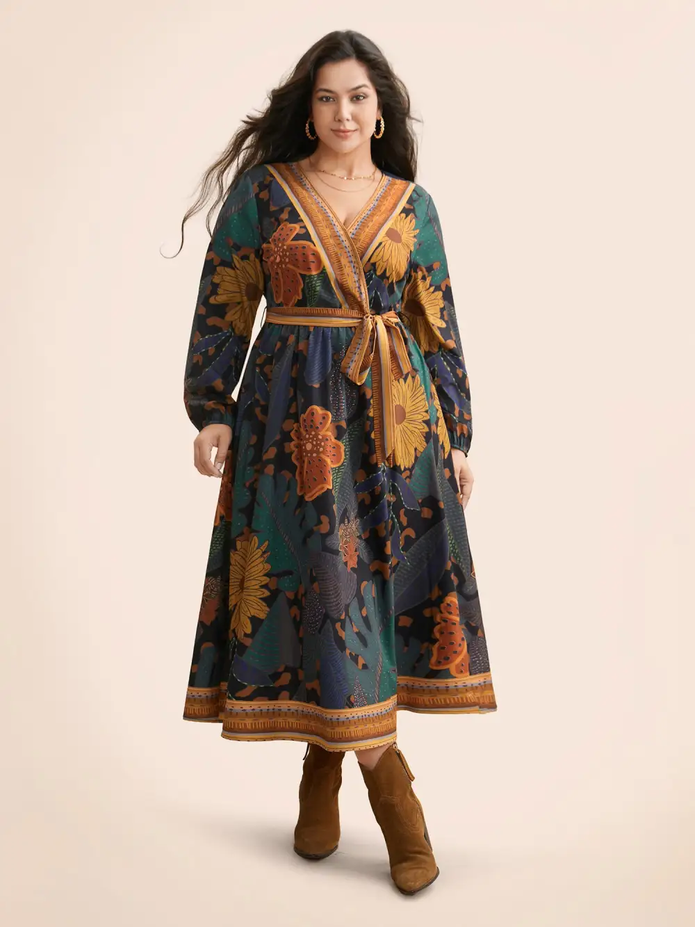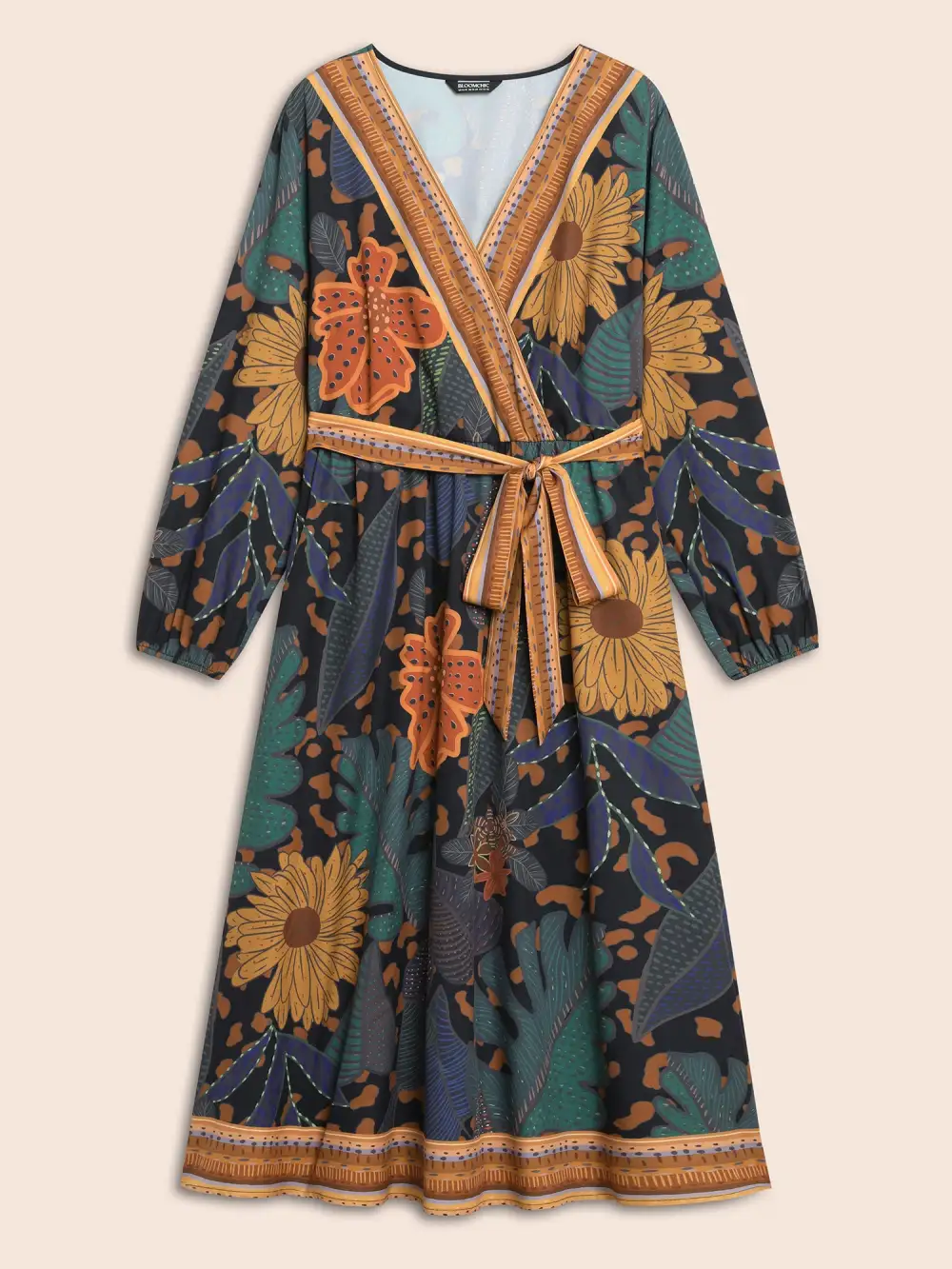 Boho Print Belted Lantern Sleeve Dress