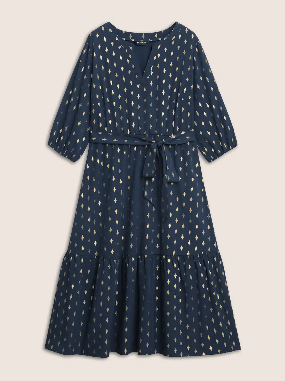 Glitter Notched Lantern Sleeve Midi Dress