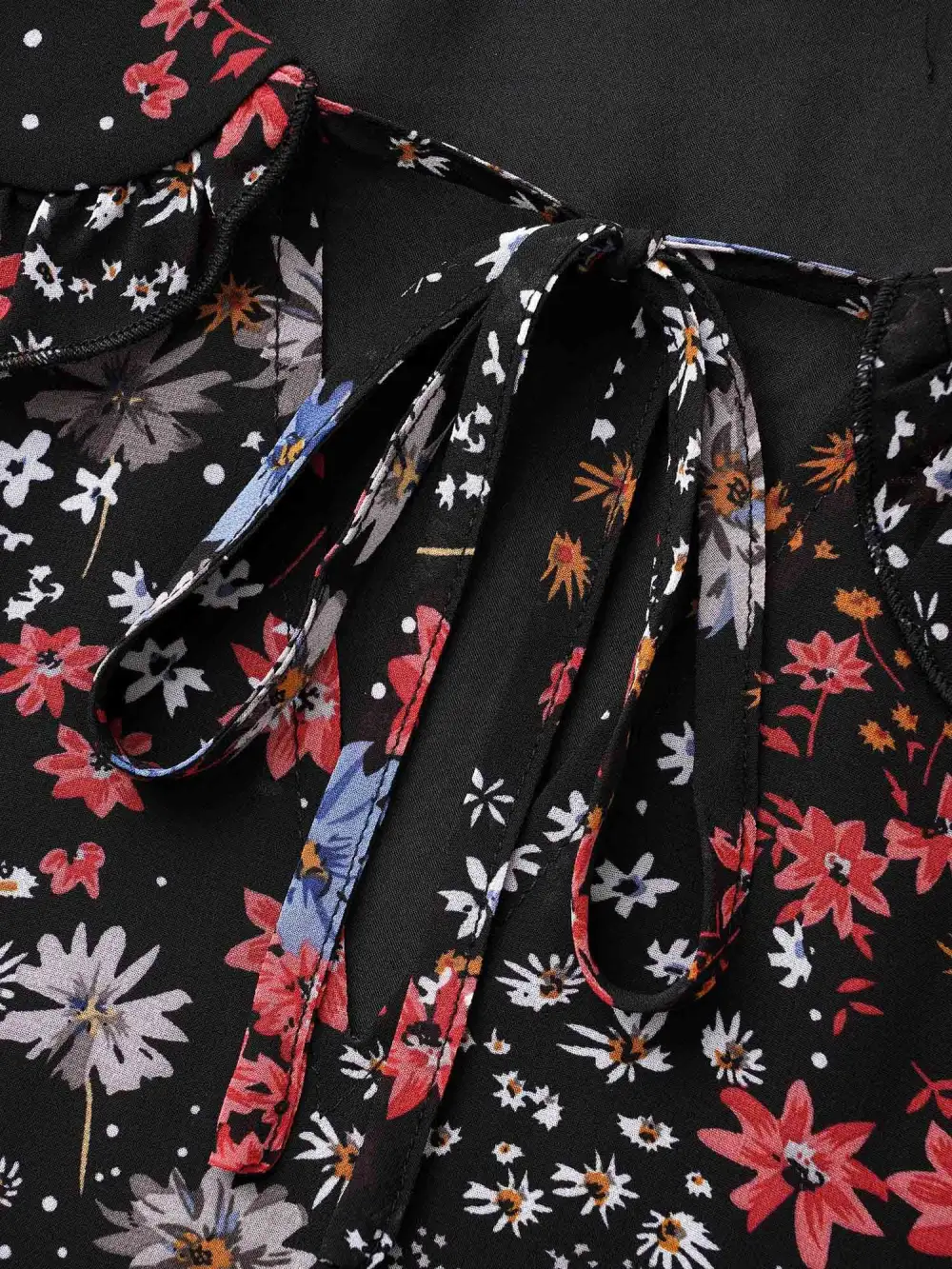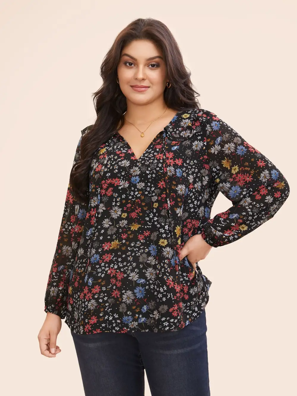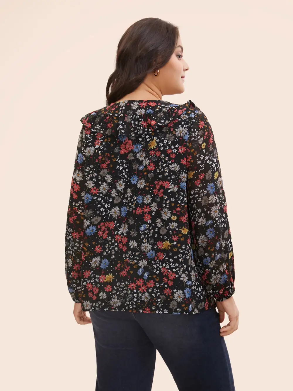 Chiffon Floral Tie Knot Ruffle Trim Blouse