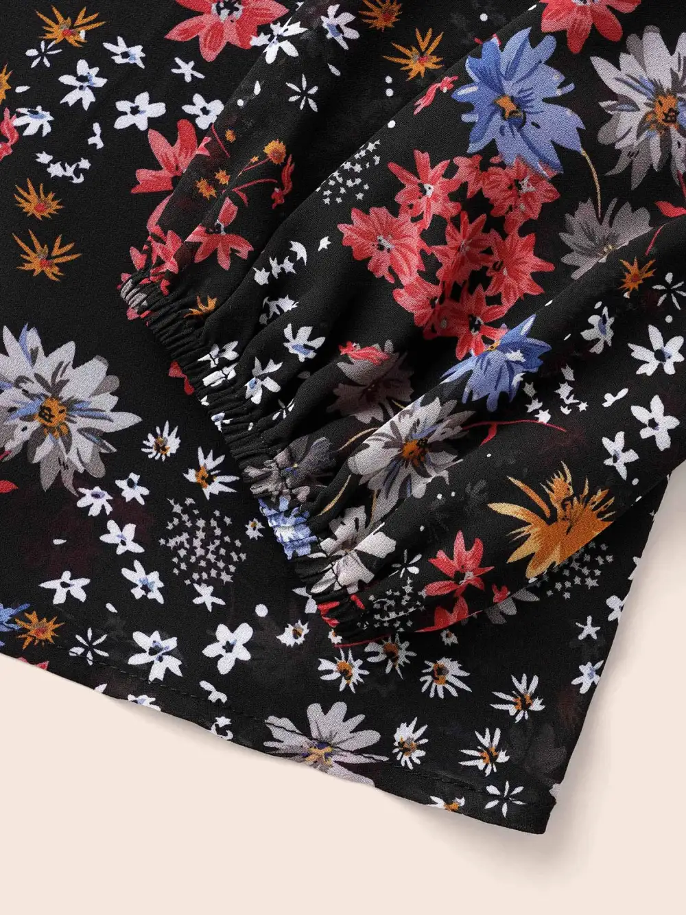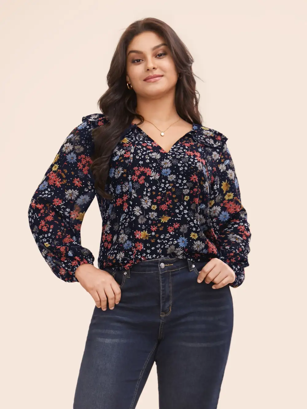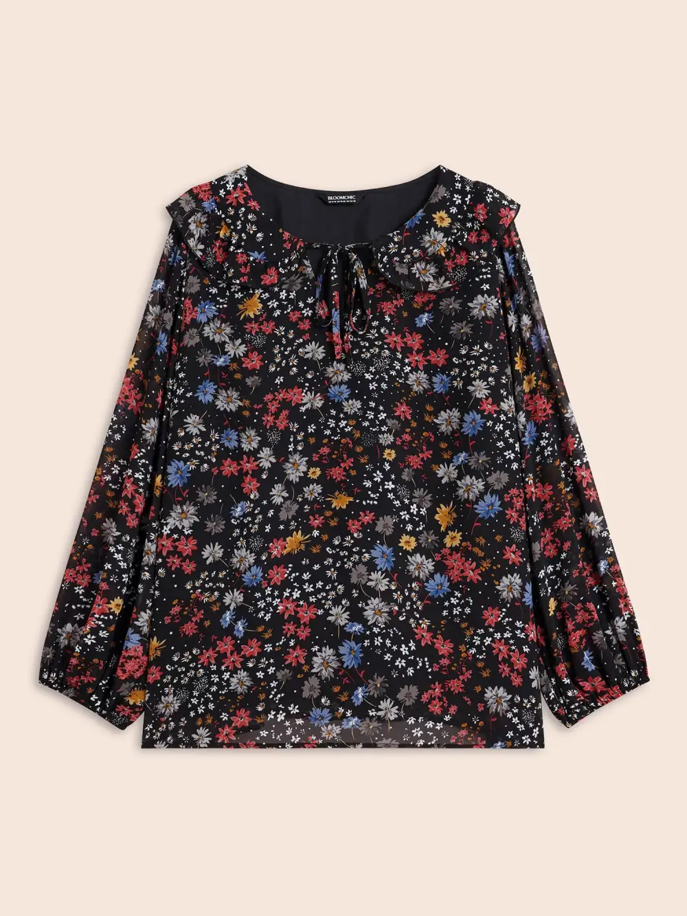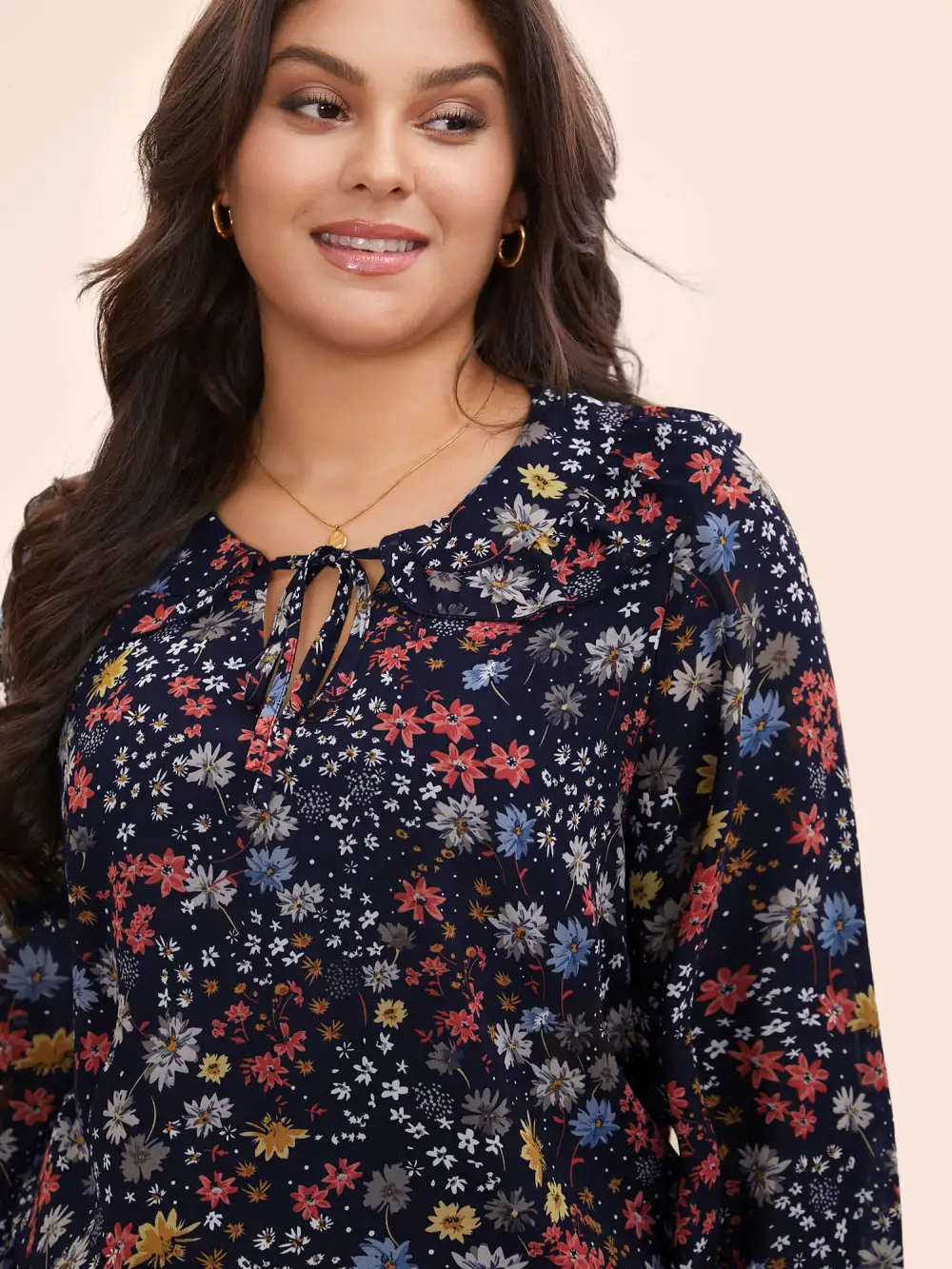 Chiffon Floral Tie Knot Ruffle Trim Blouse