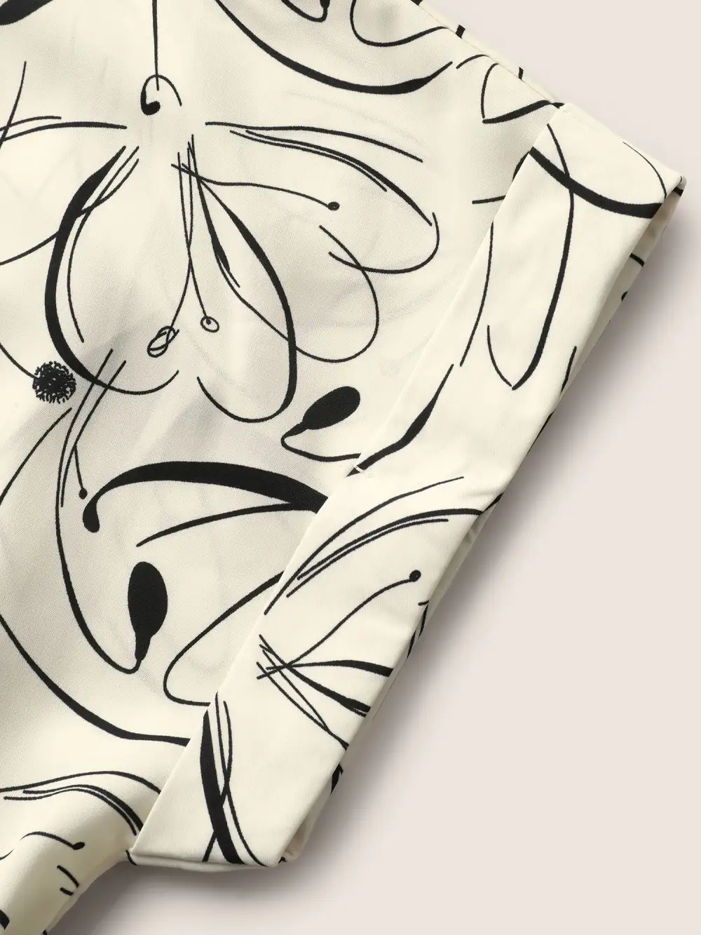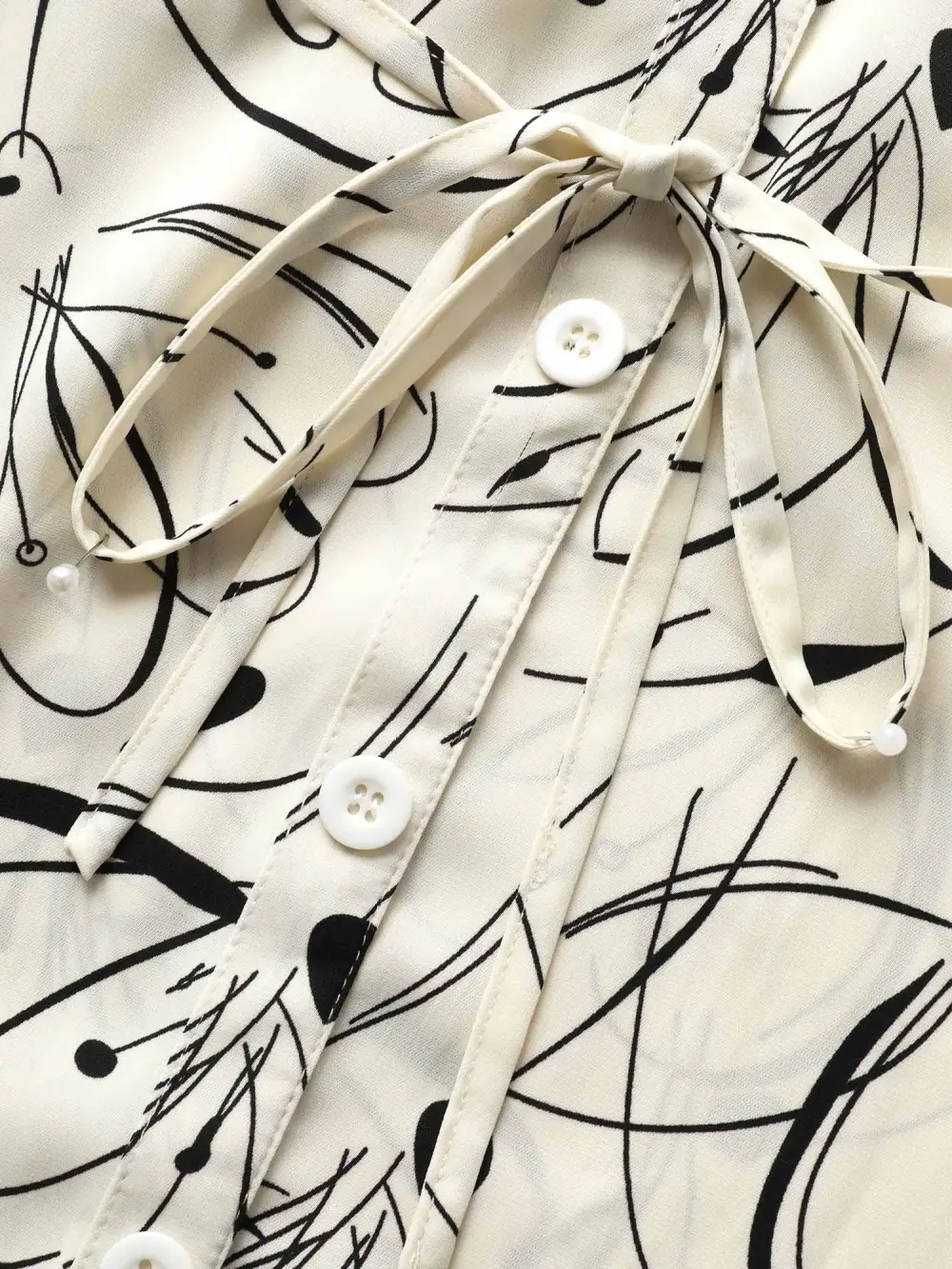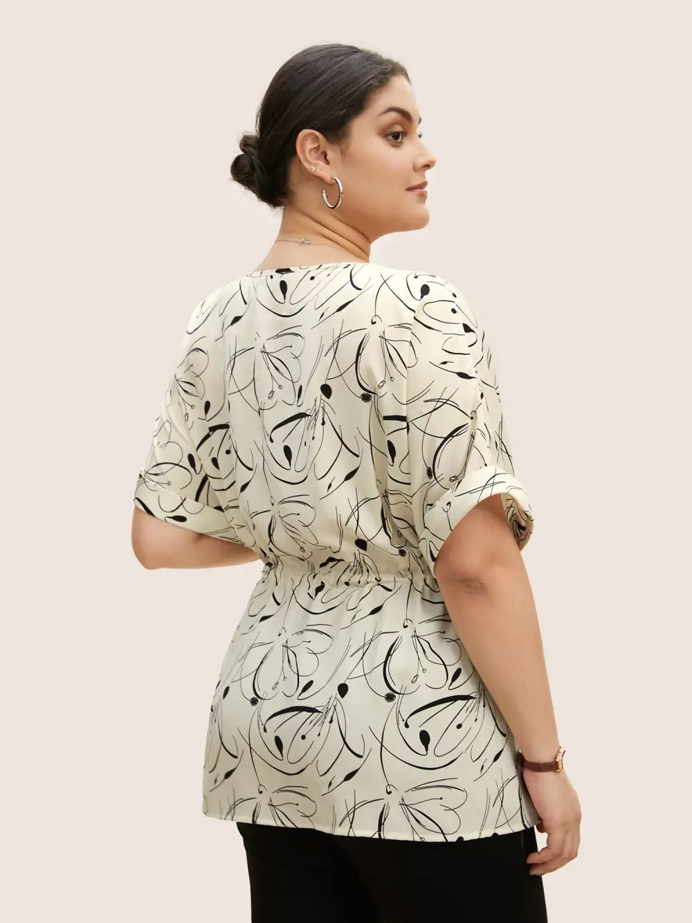 Geometric Print Drawstring Cuffed Sleeve Blouse