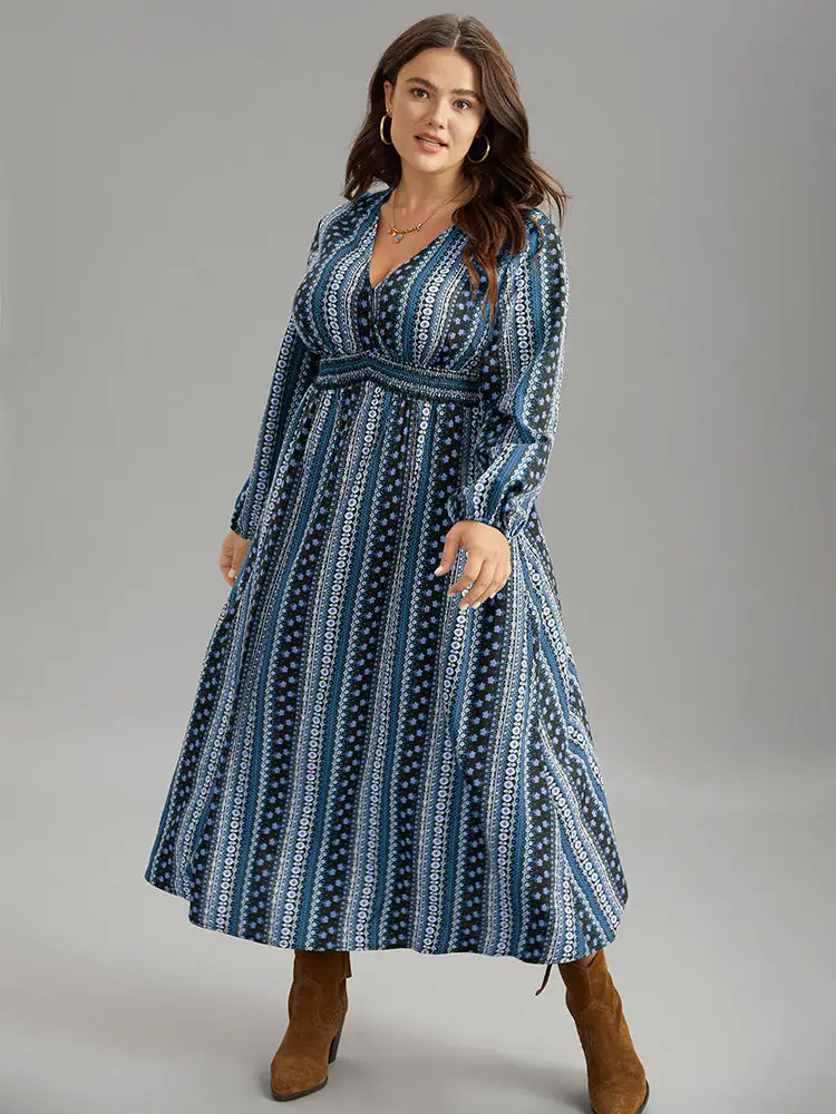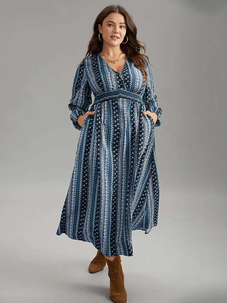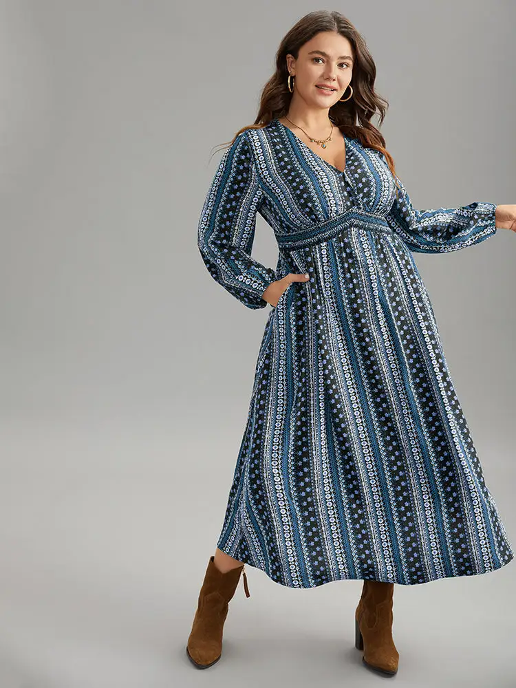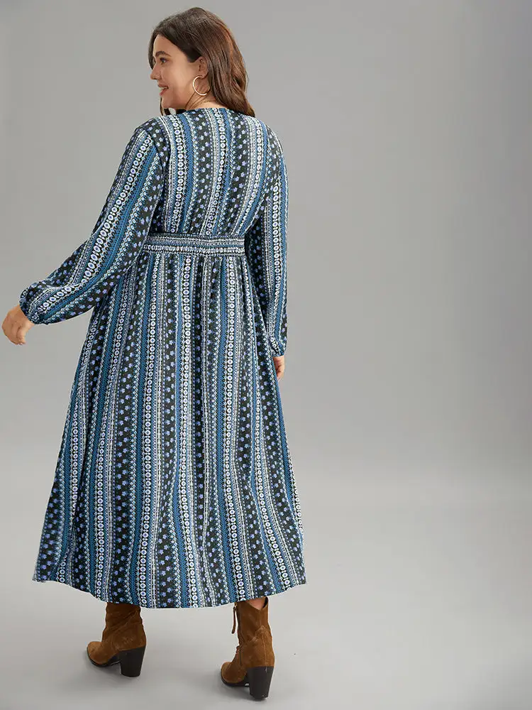 Geometric Print Drawstring Cuffed Sleeve Blouse