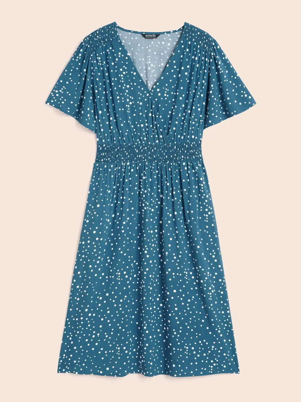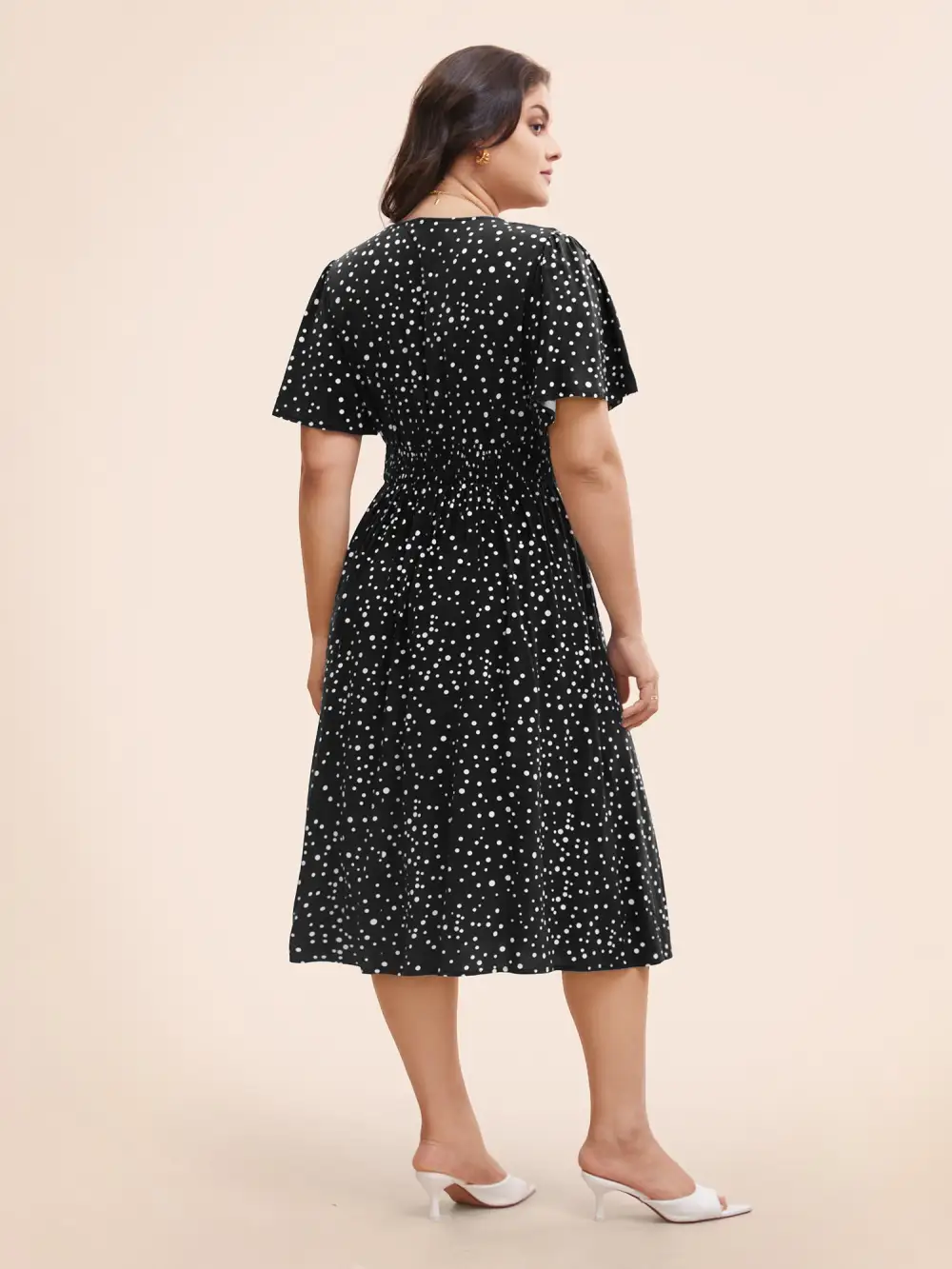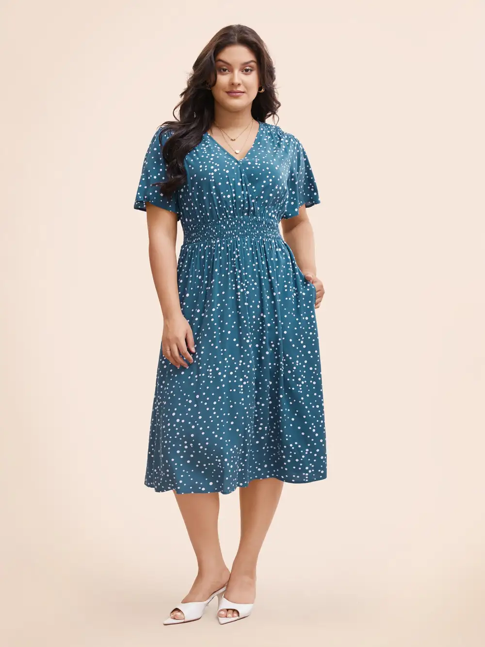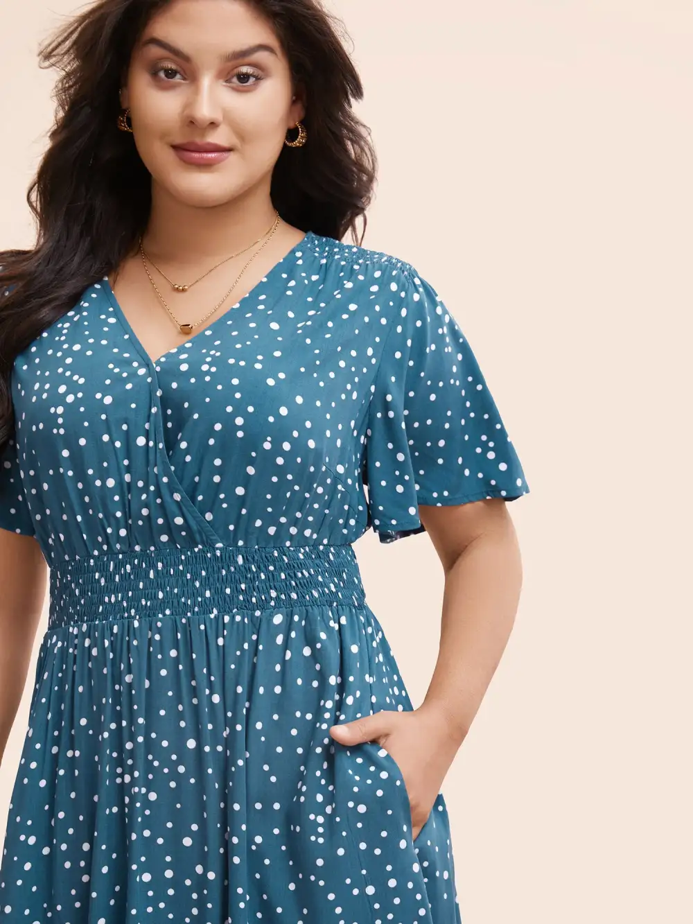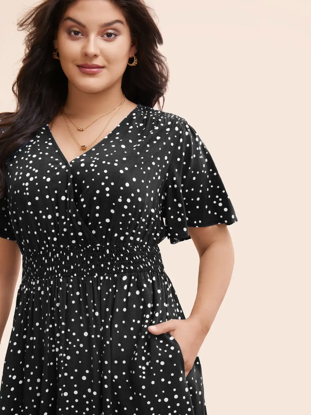 Polka Dot Wrap Pocket Shirred Ruffle Sleeve Dress