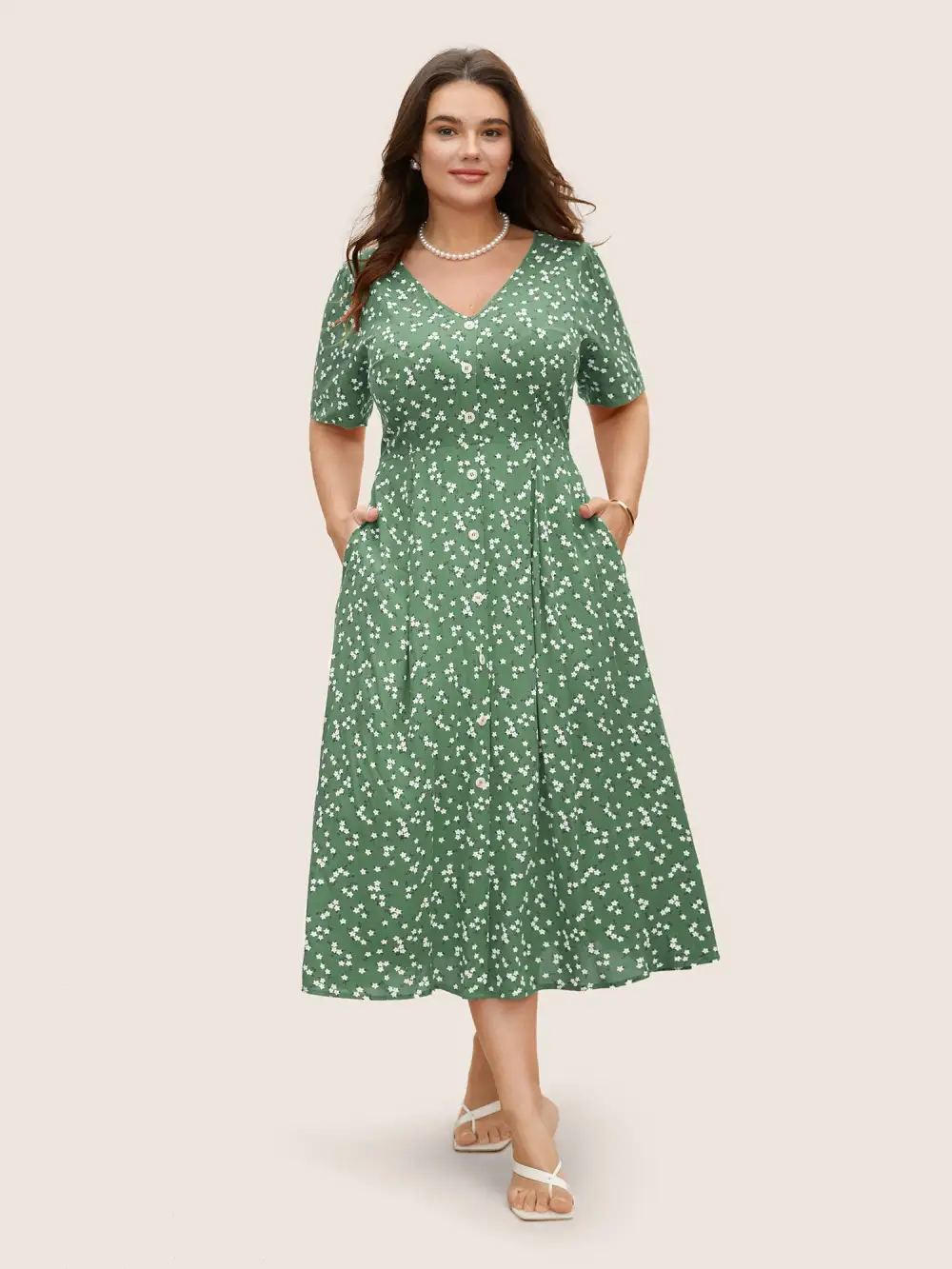 Ditsy Floral Button Detail Elastic Waist Midi Dress