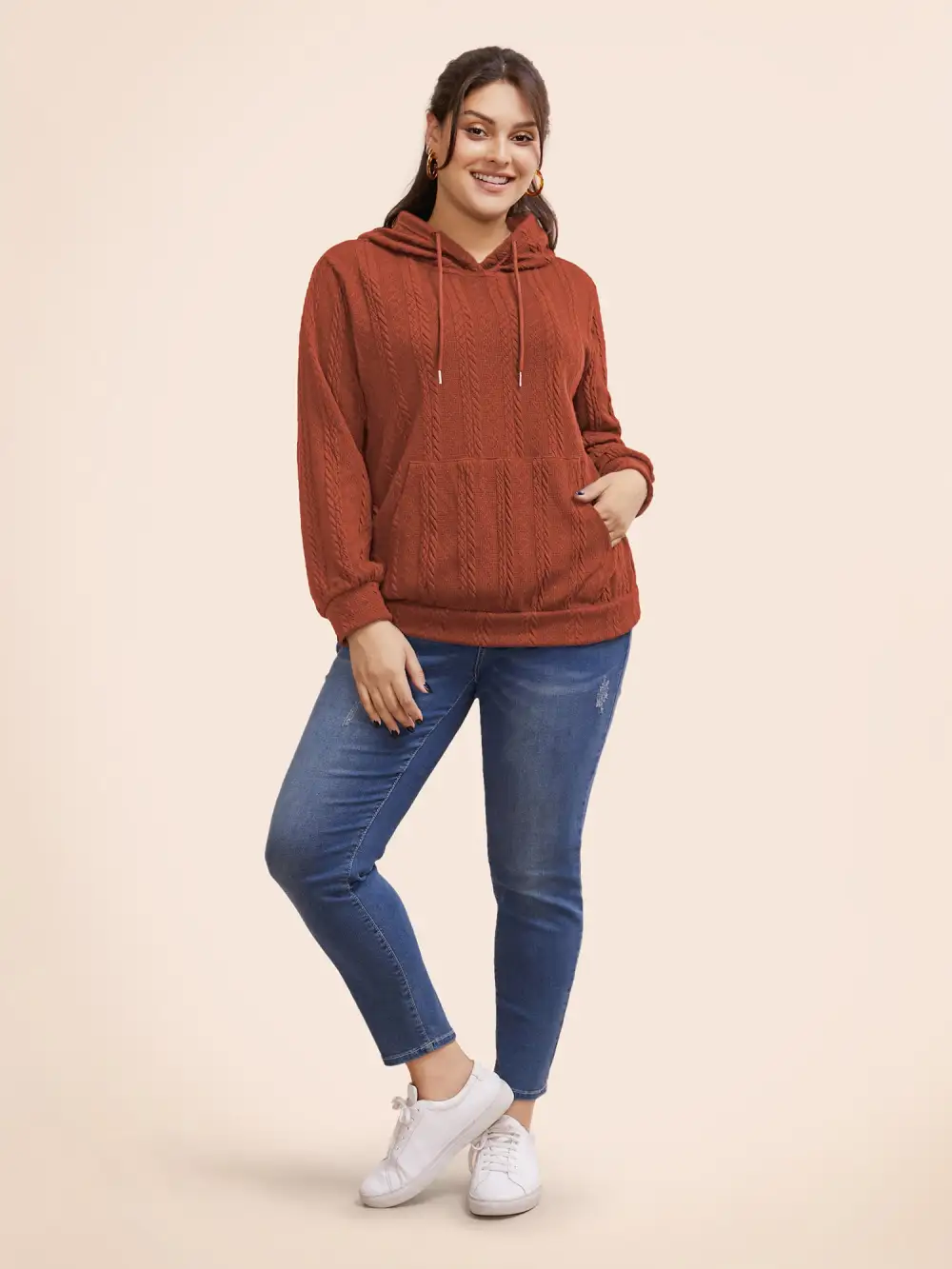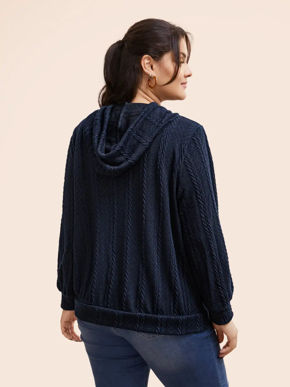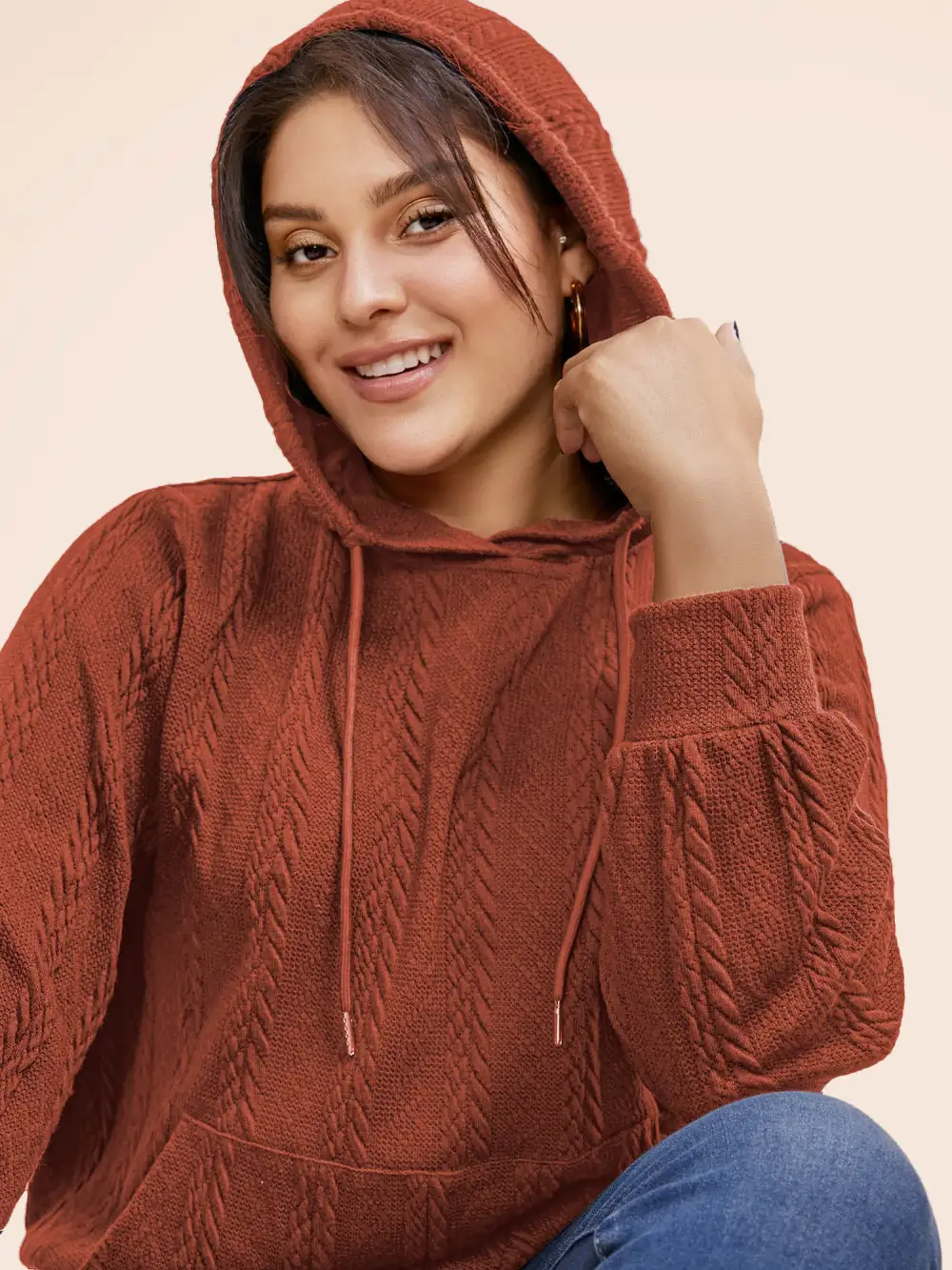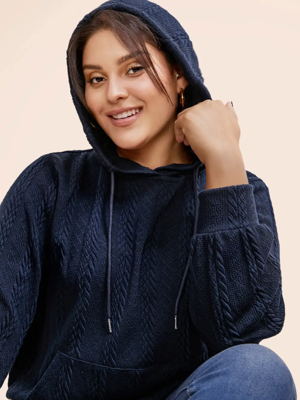 Solid Cable Knit Hooded Drawstring Sweatshirt