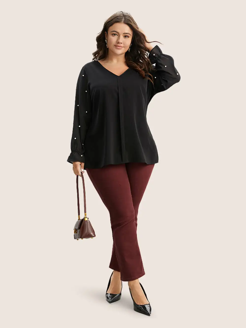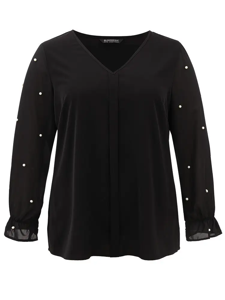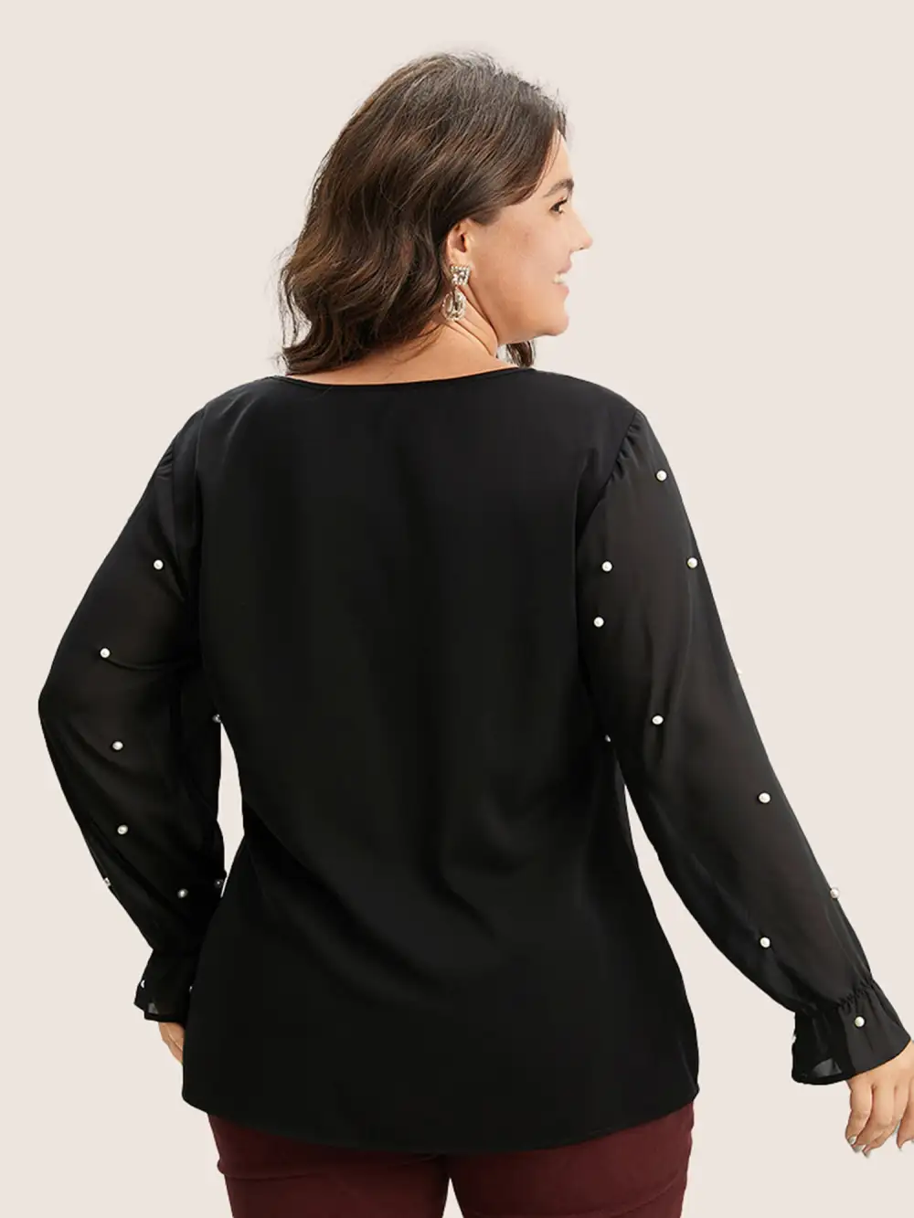 Pearl Beaded Mesh Patchwork Ruffles Blouse