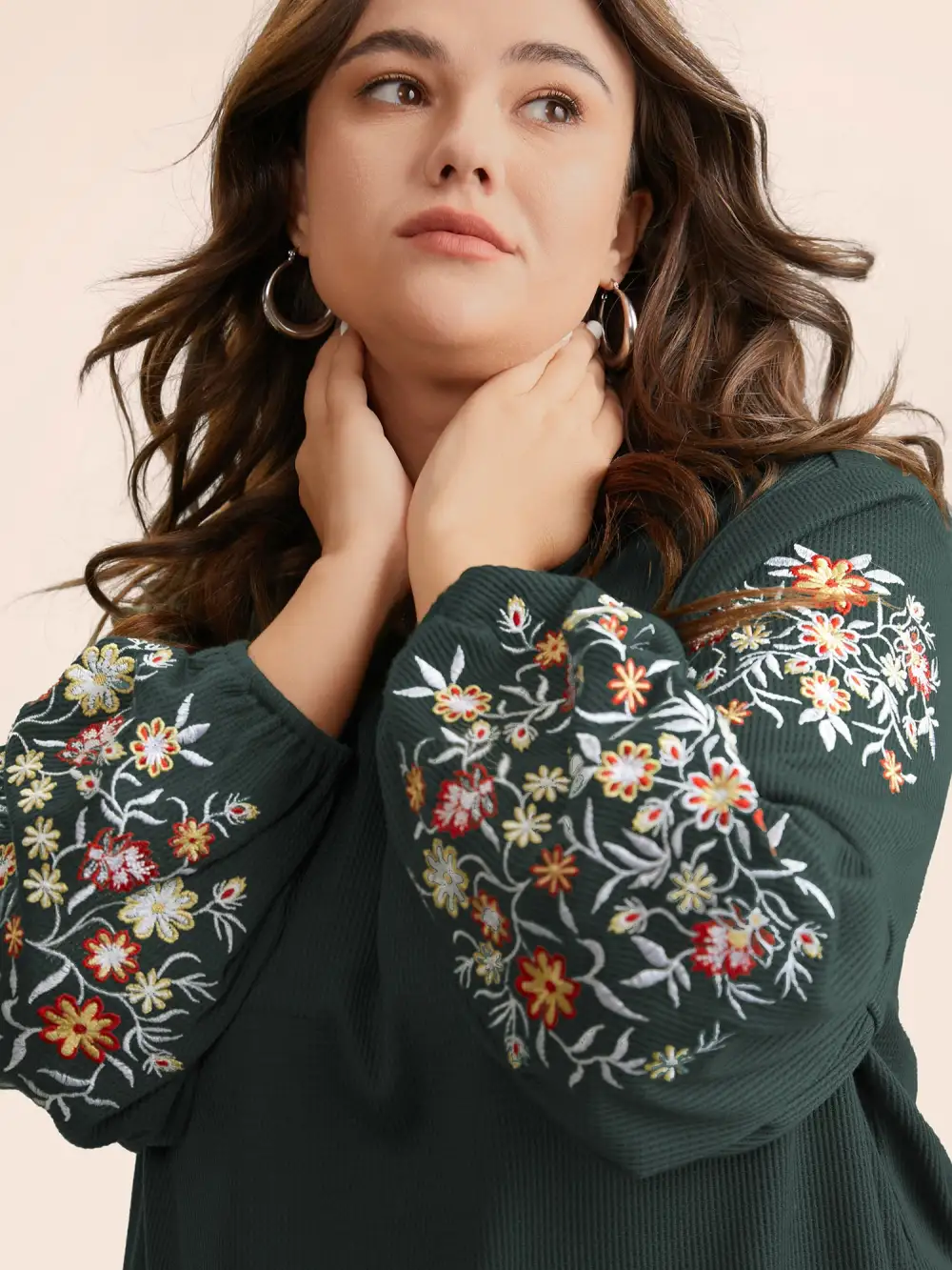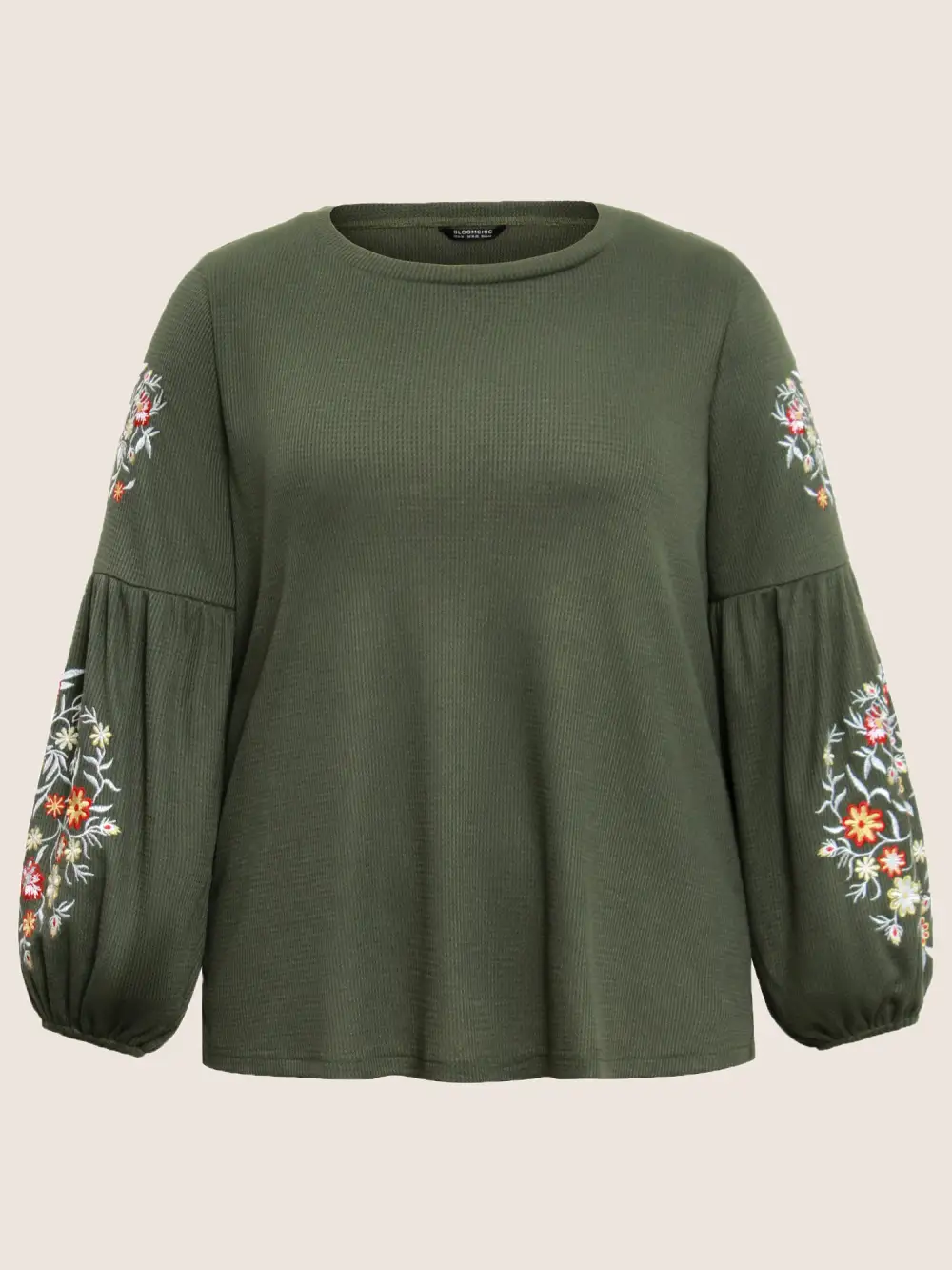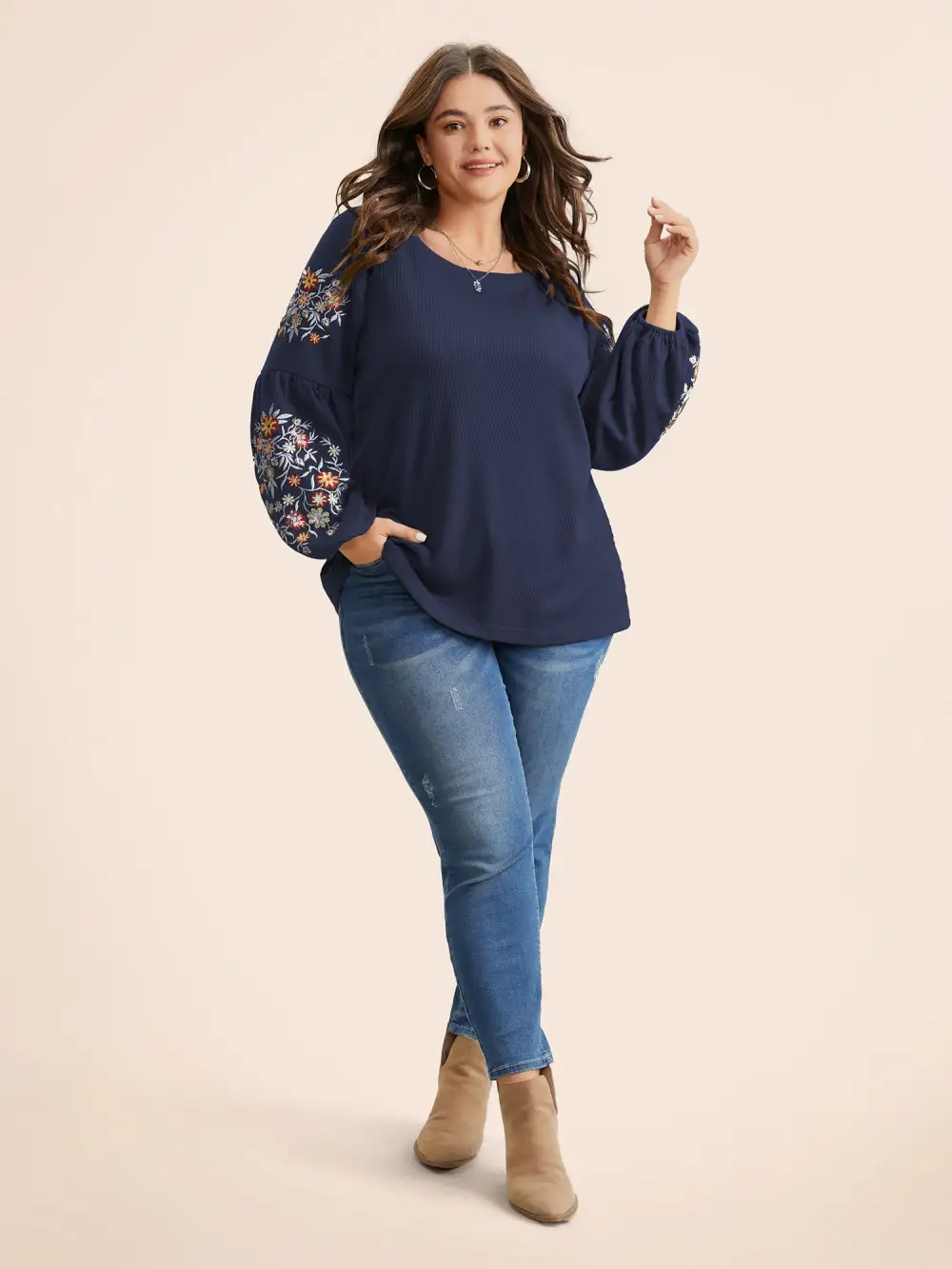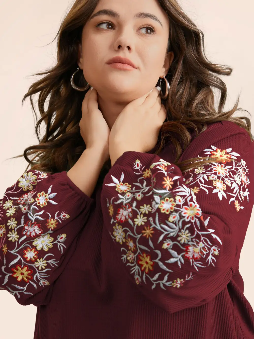Waffle Knit Floral Embroidered Lantern Sleeve T-Shirt
