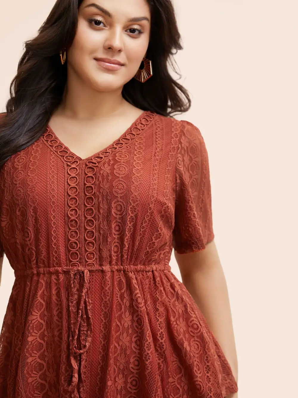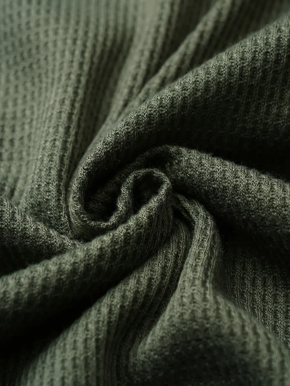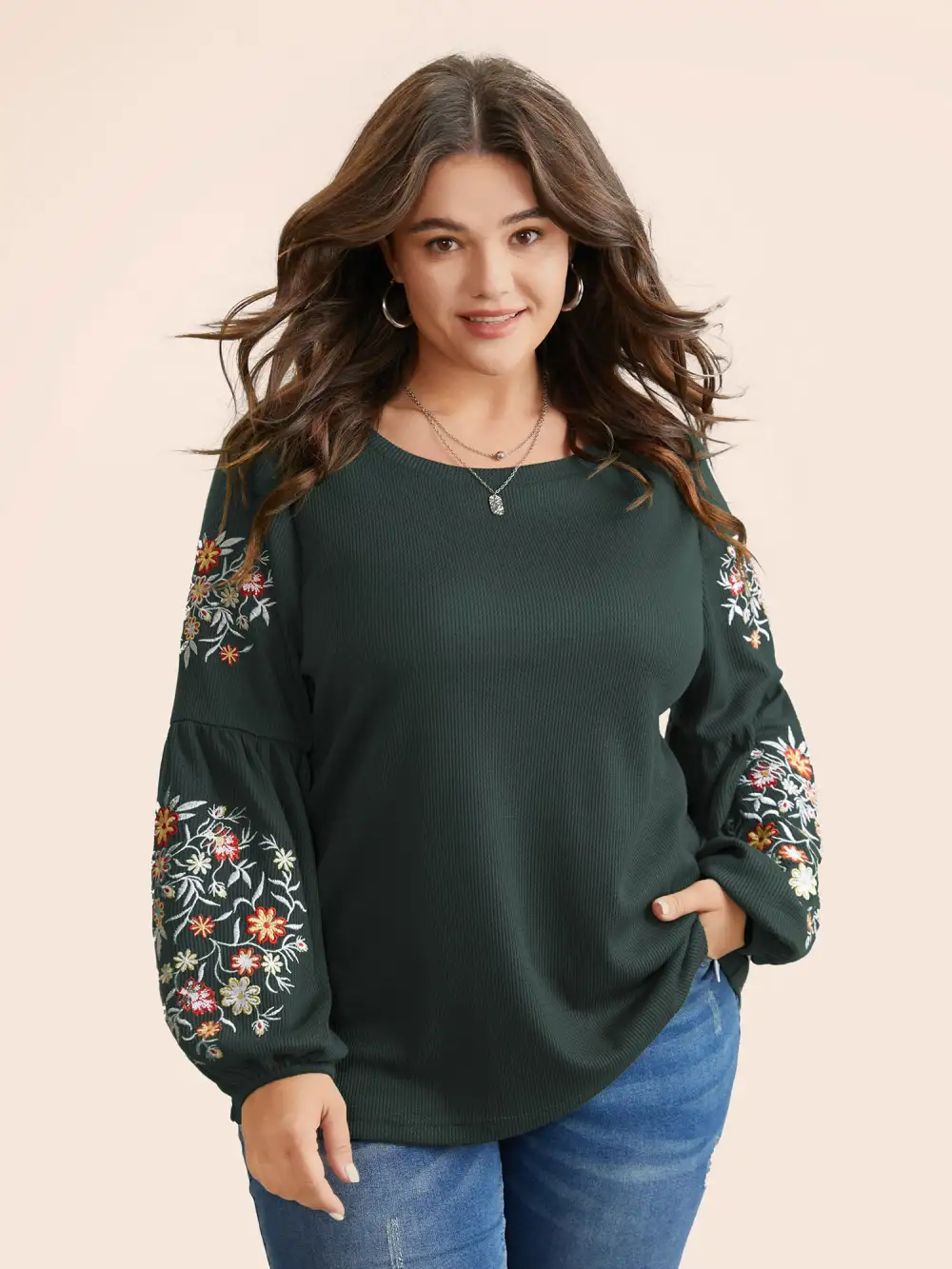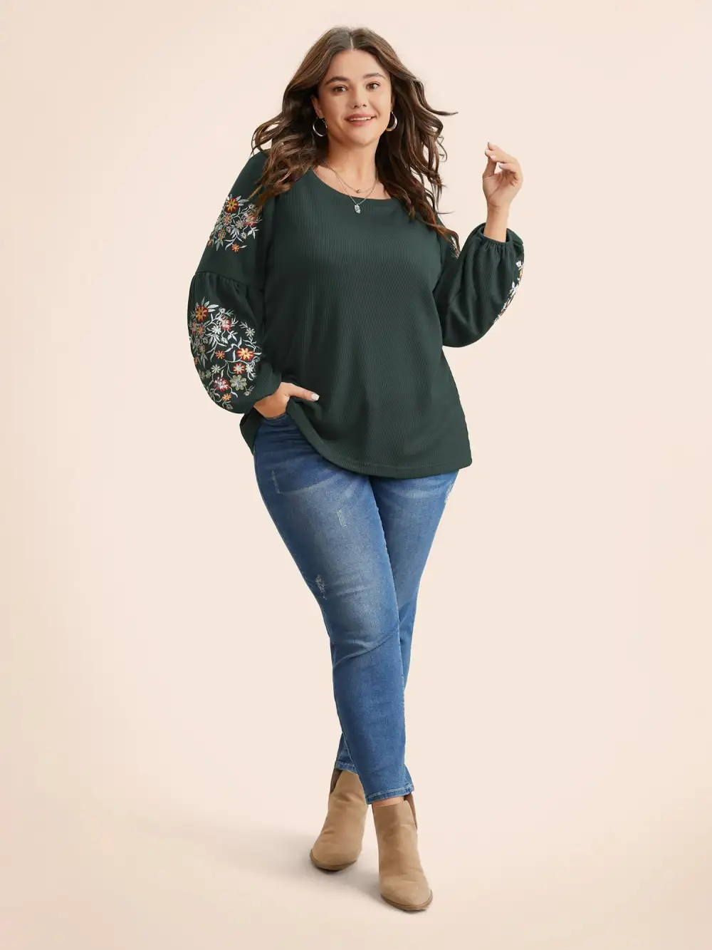 Waffle Knit Floral Embroidered Lantern Sleeve T-Shirt