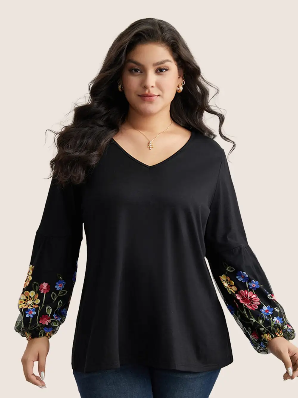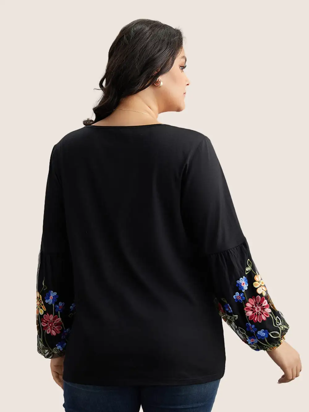 Floral Embroidered Lantern Sleeve T-Shirt