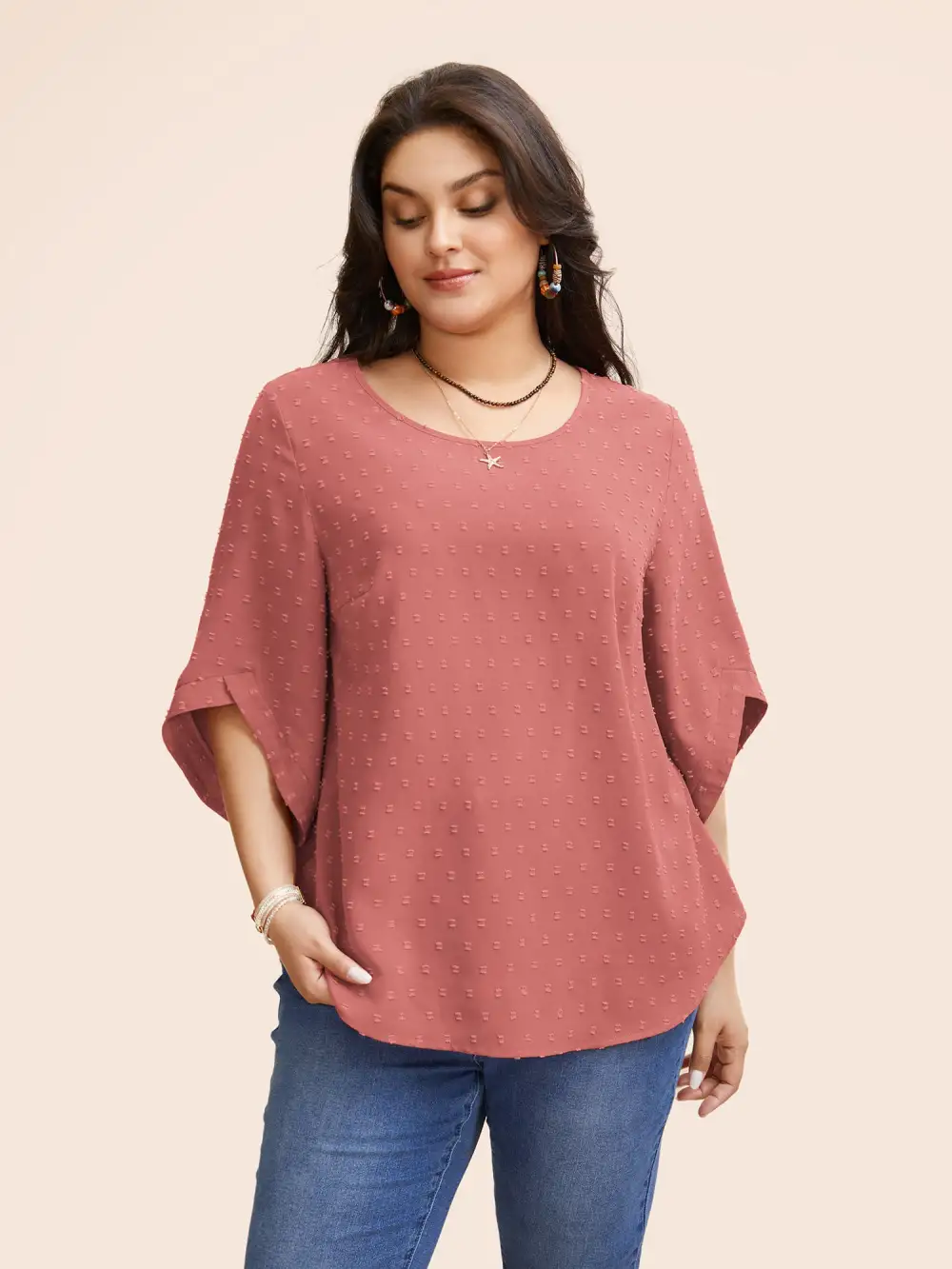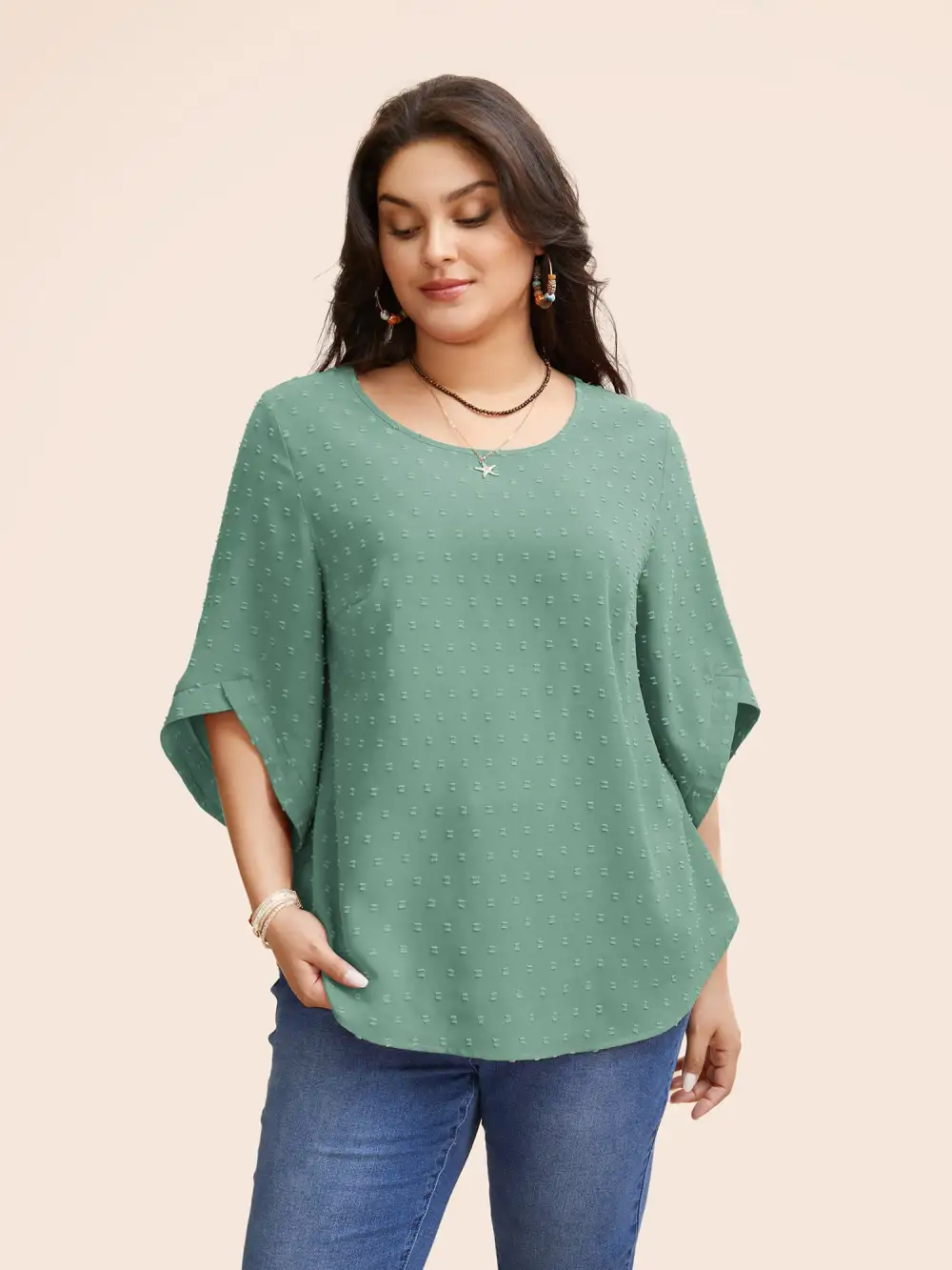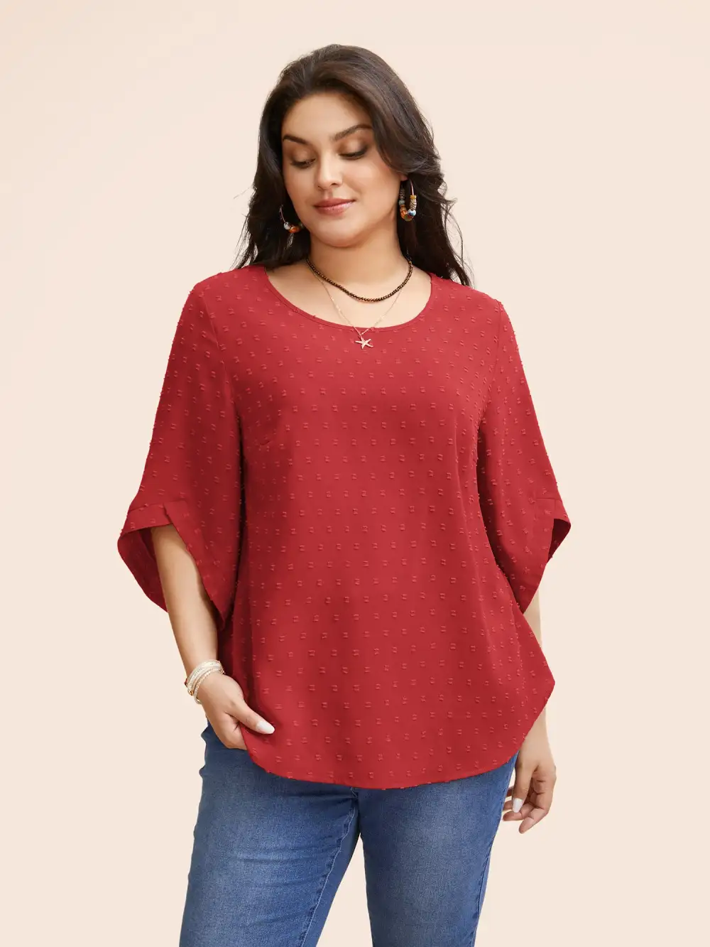 Textured Round Neck Bell Sleeve Blouse