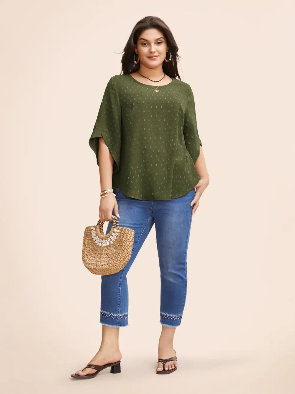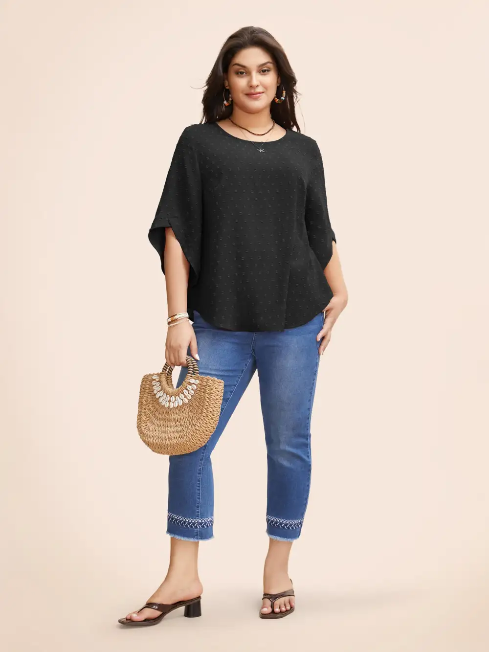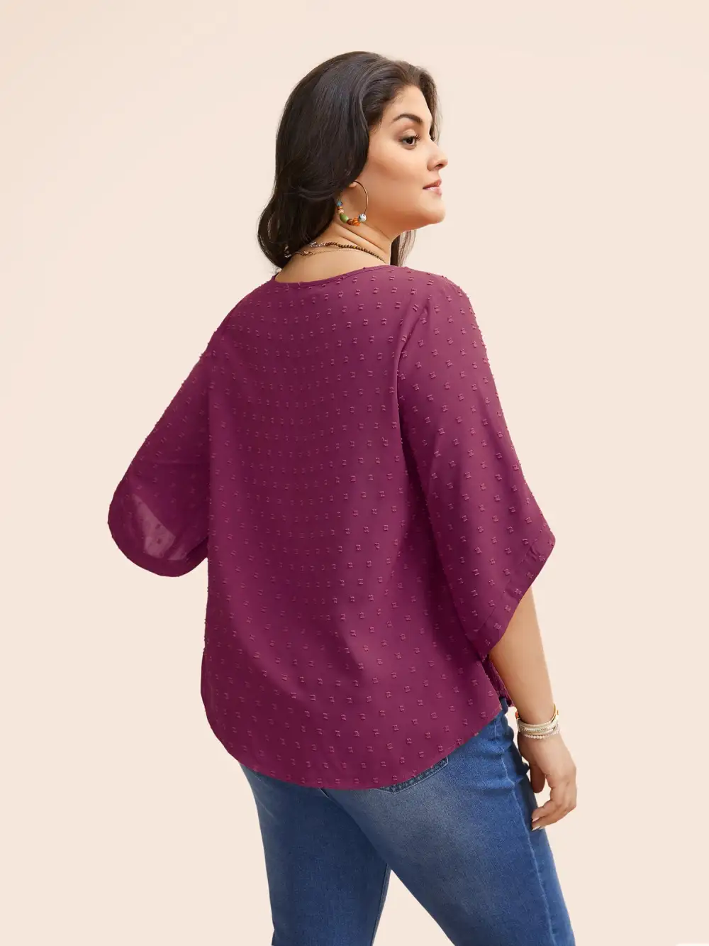 Textured Round Neck Bell Sleeve Blouse