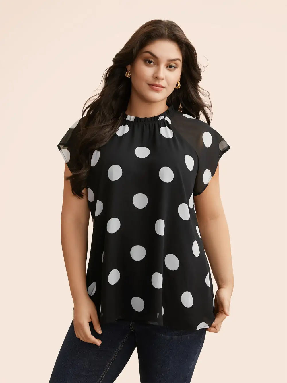 Polka Dot Mock Neck Mesh Patchwork Blouse