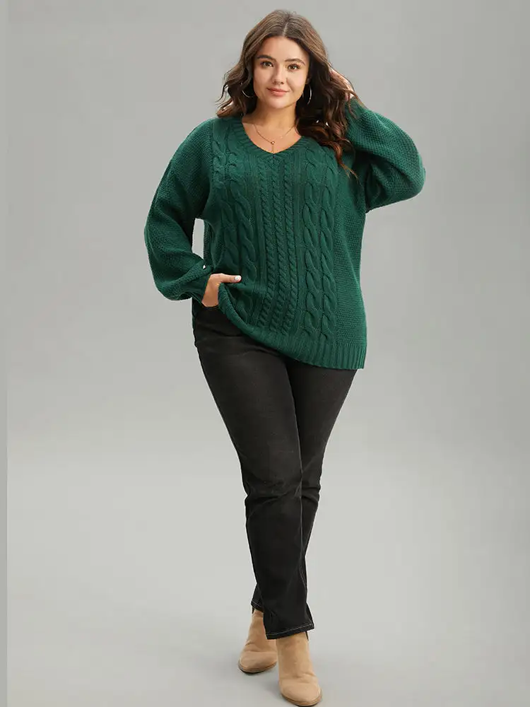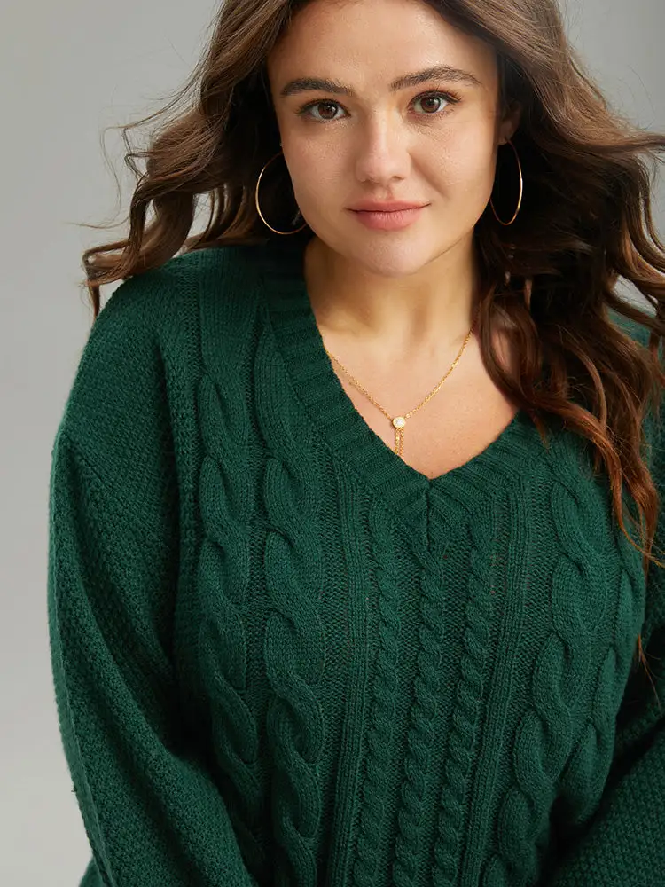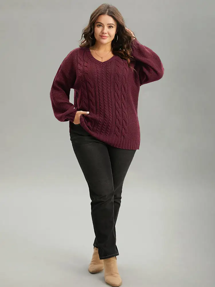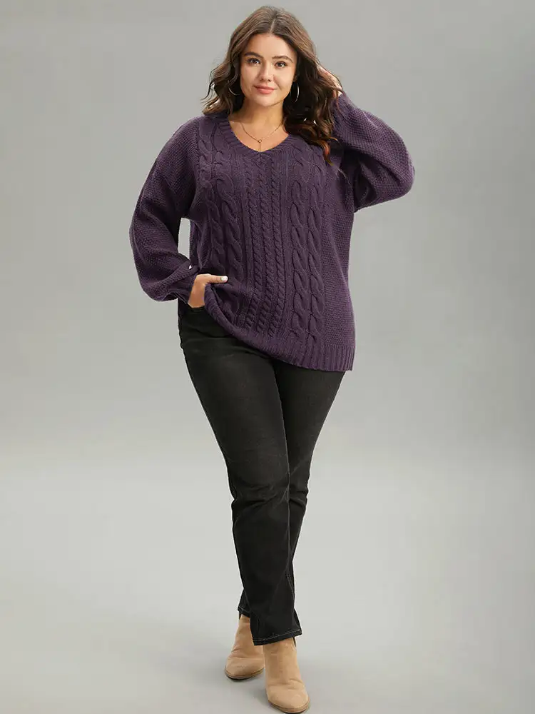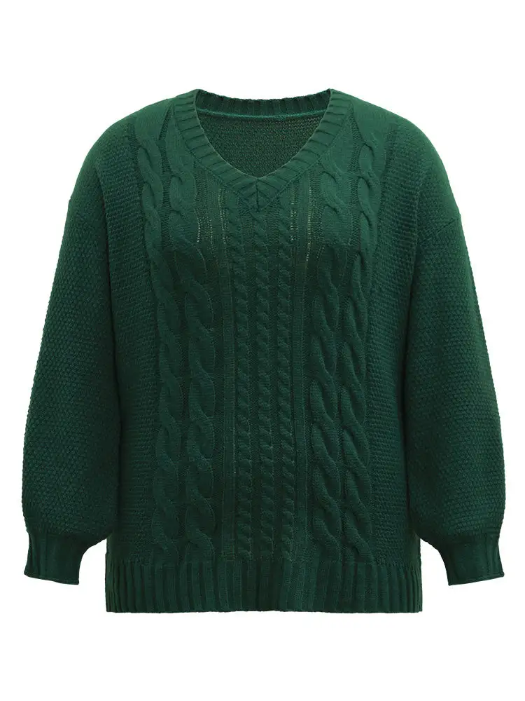 Solid Cable Knit V Neck Elastic Cuffs Pullover
