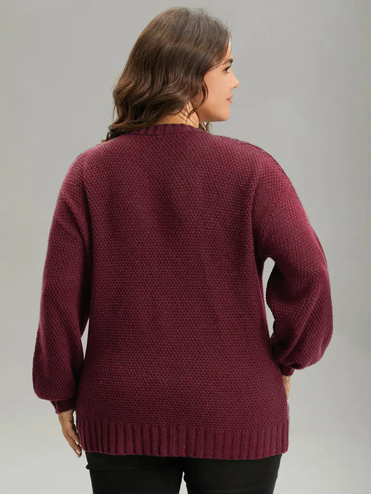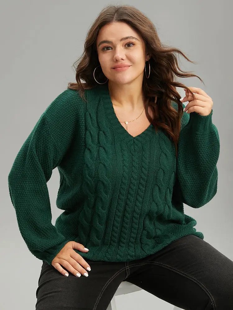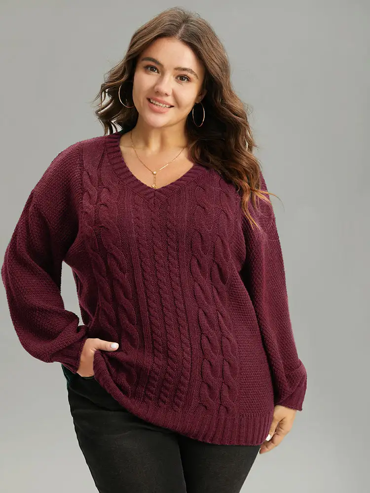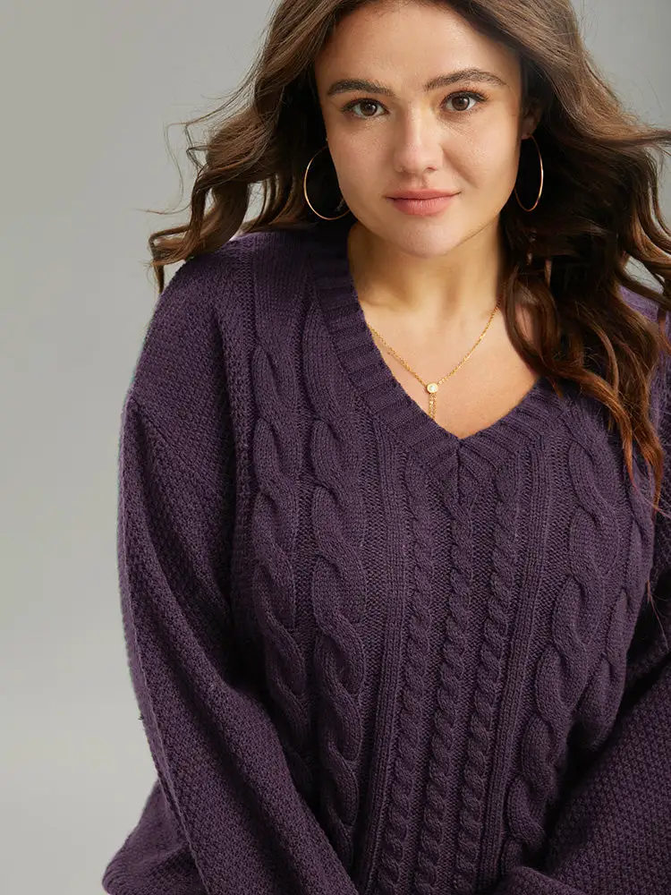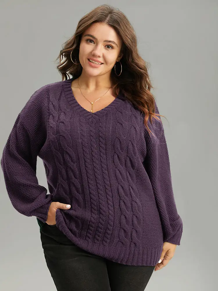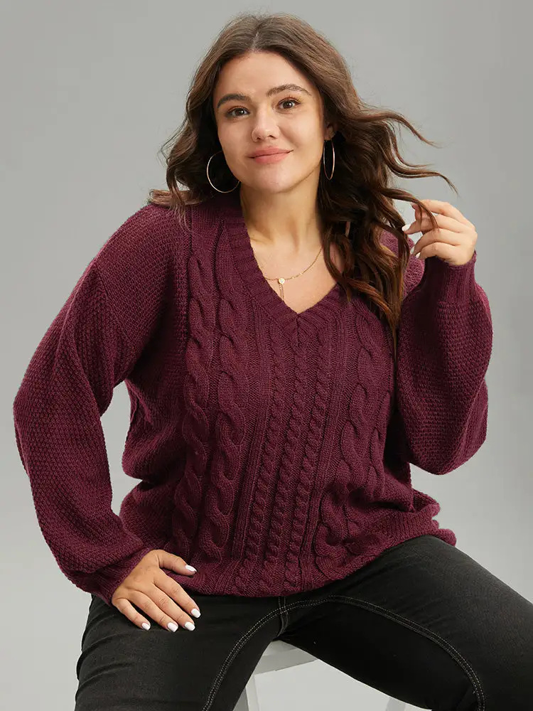 Solid Cable Knit V Neck Elastic Cuffs Pullover