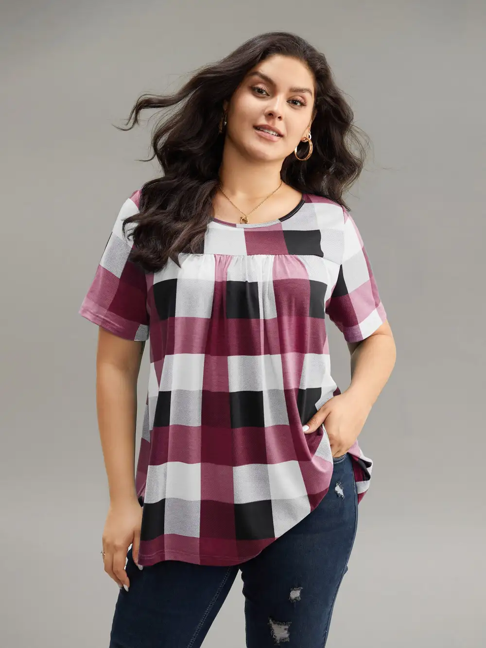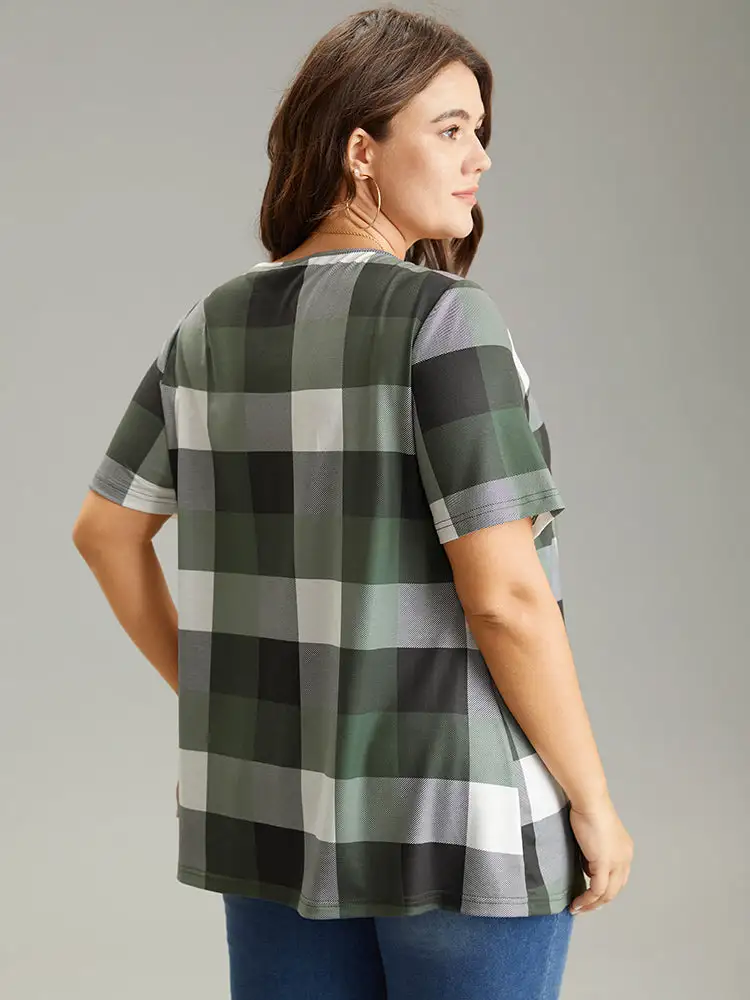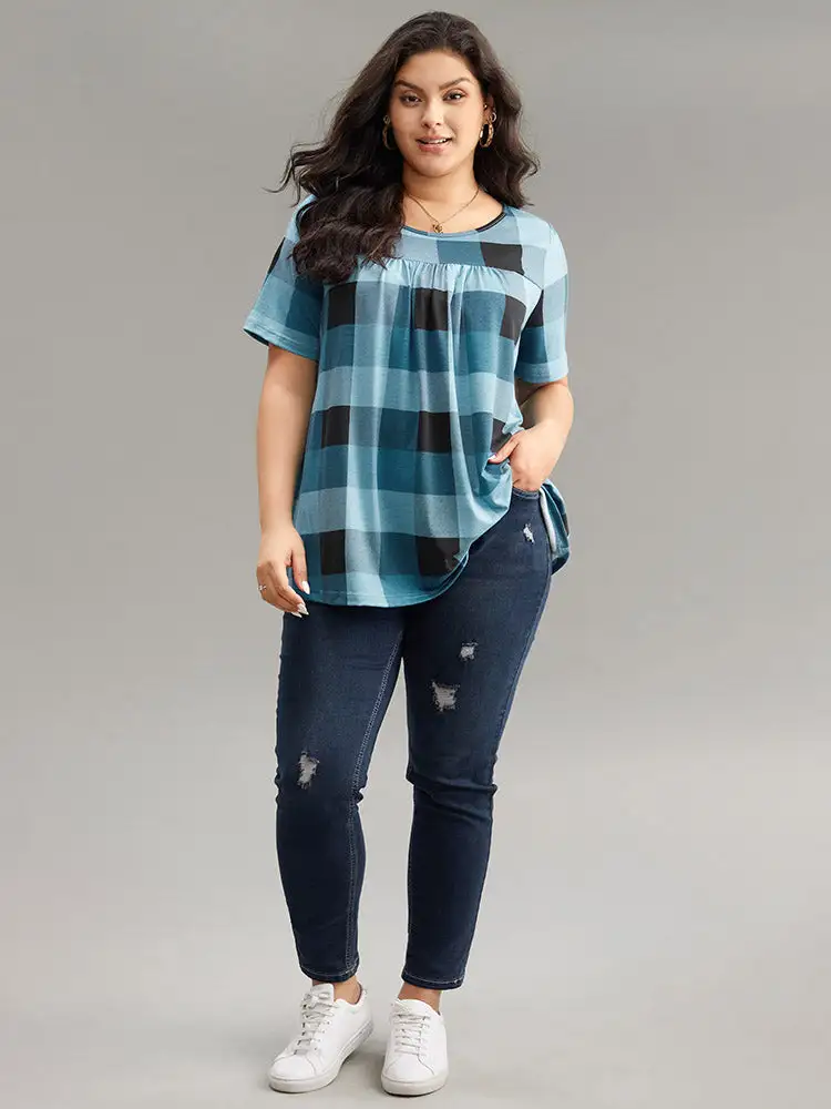 Plaid Round Neck Gathered T-Shirt
