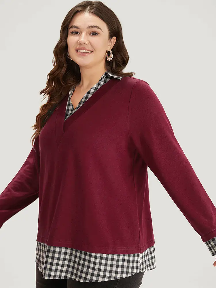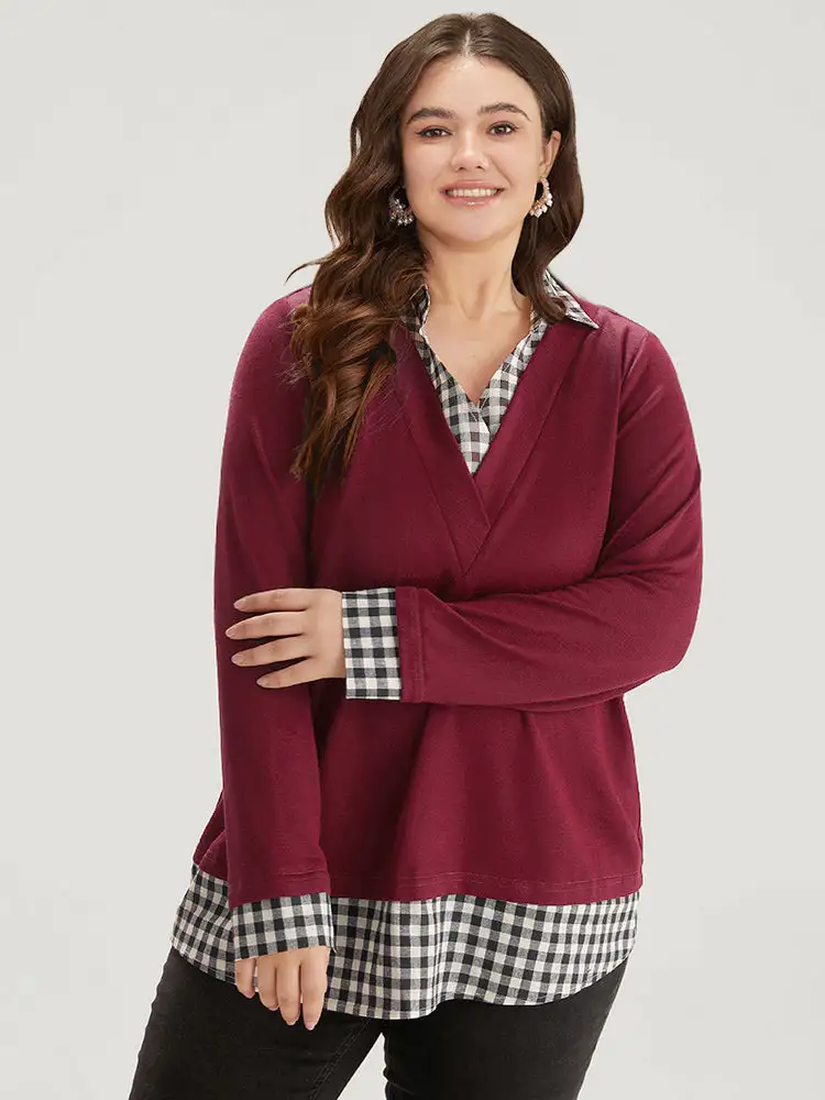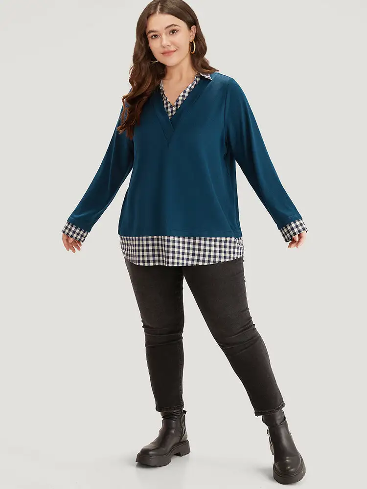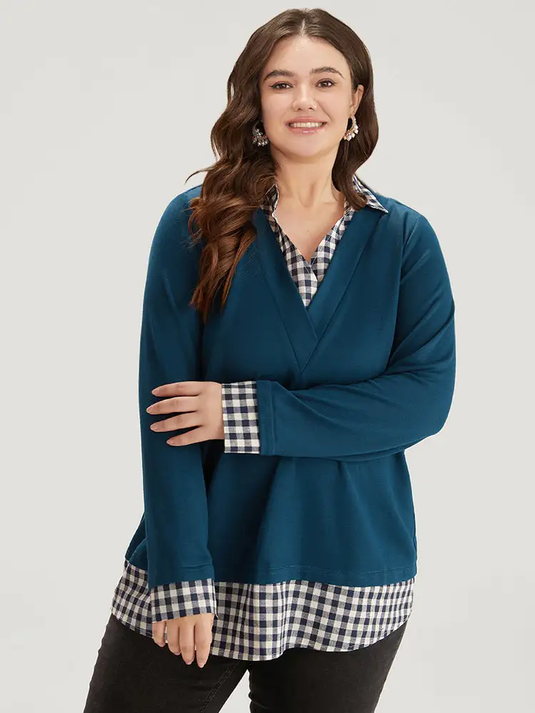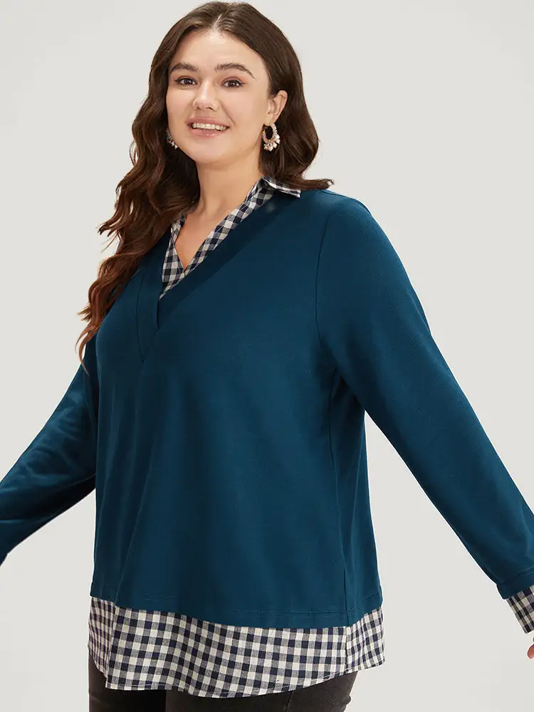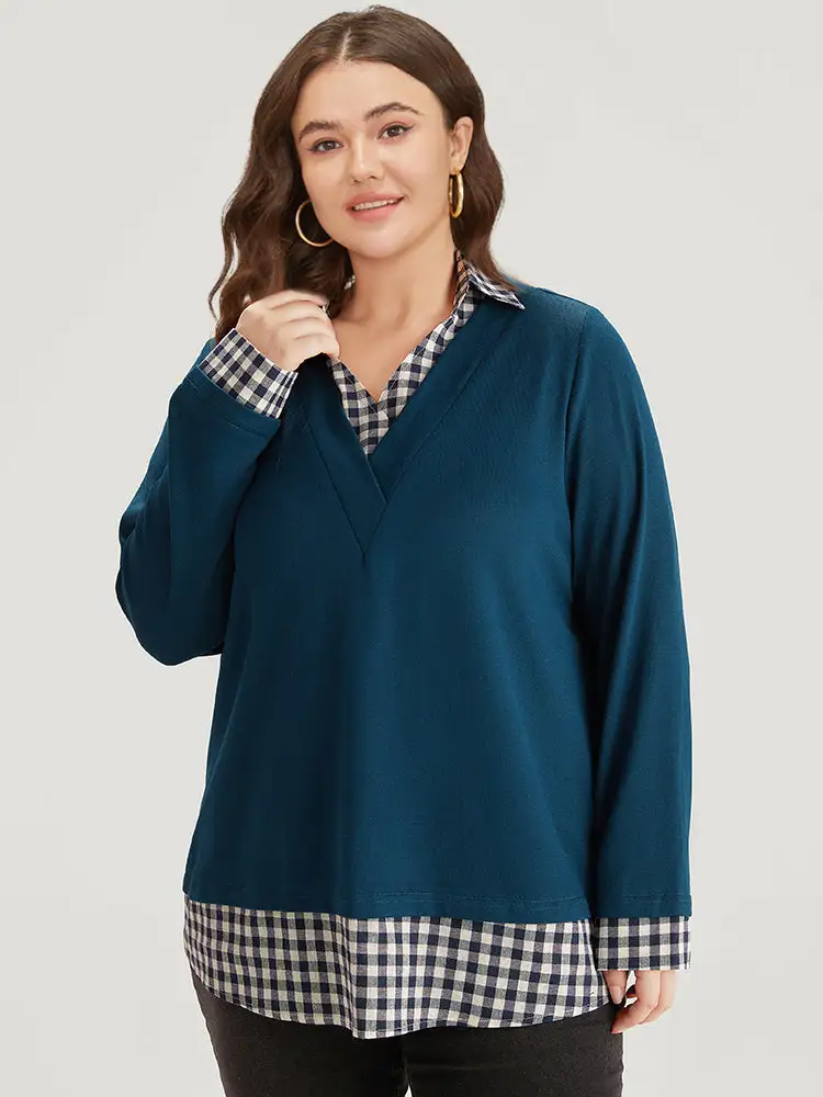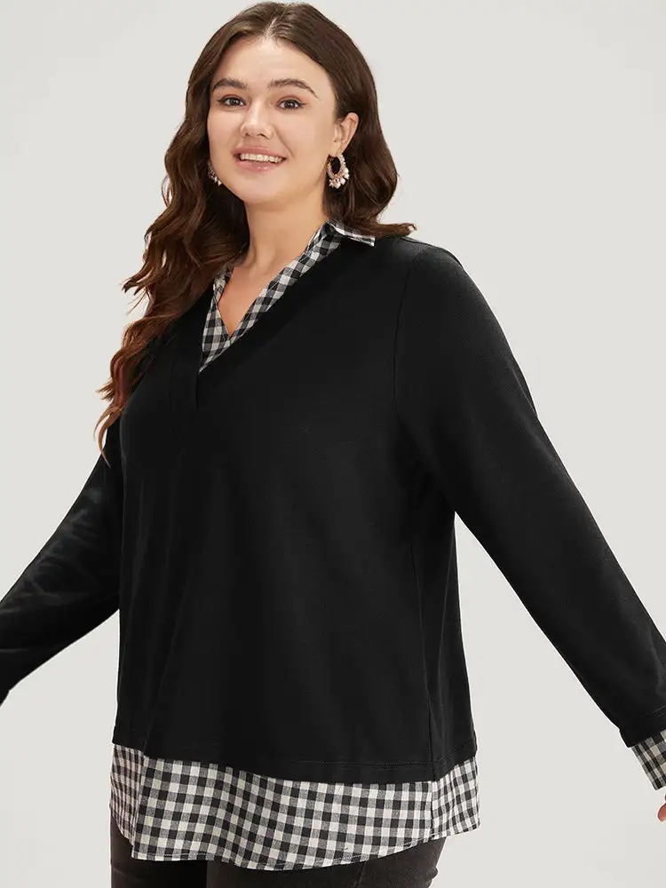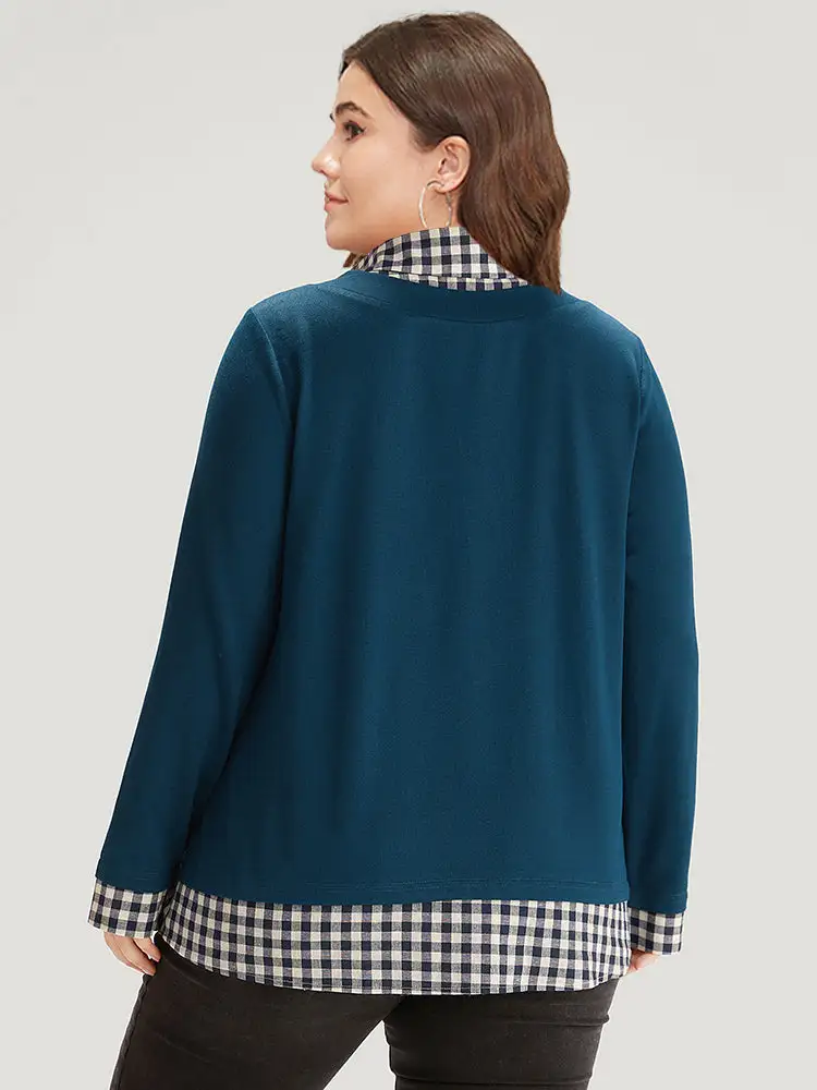 Gingham Patchwork Shirt Collar Arc Hem Sweatshirt