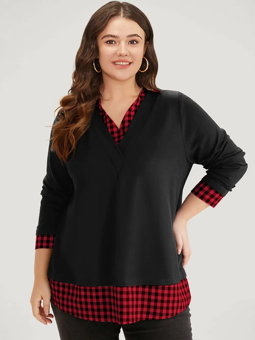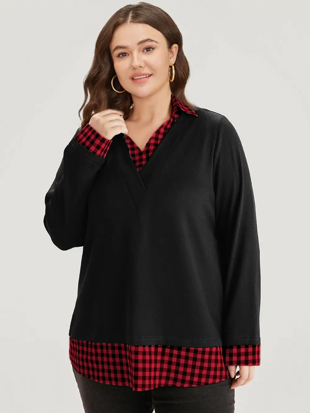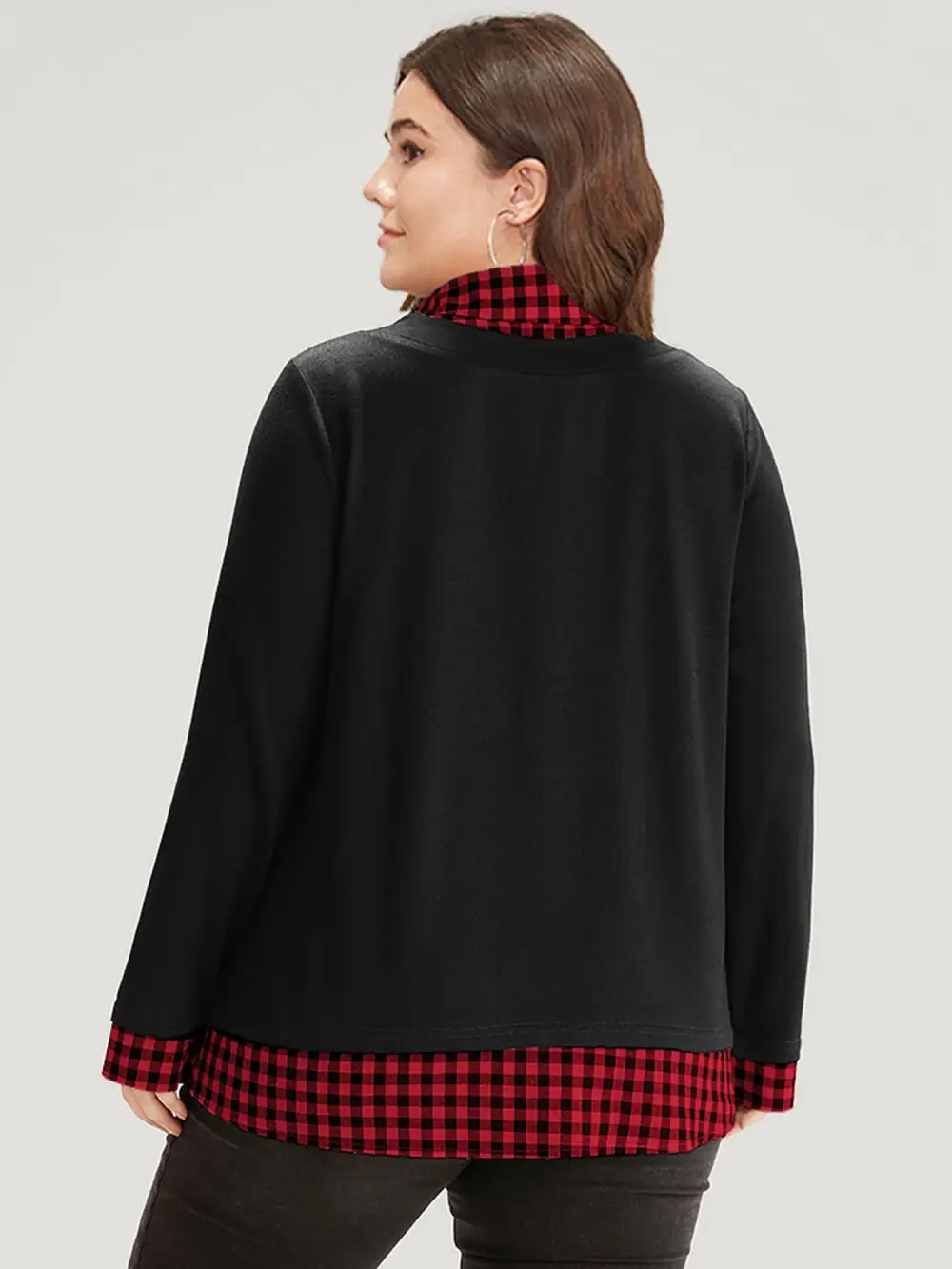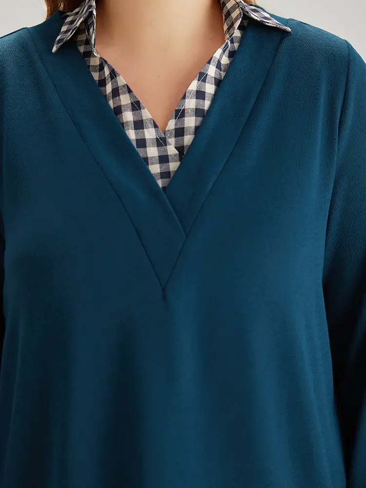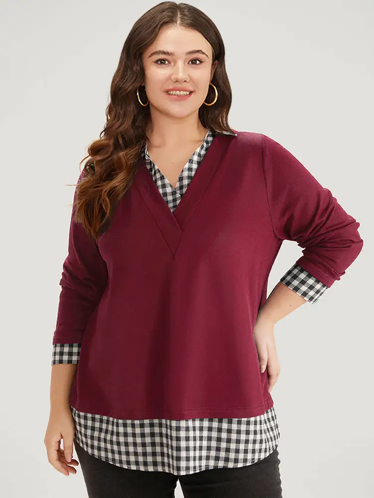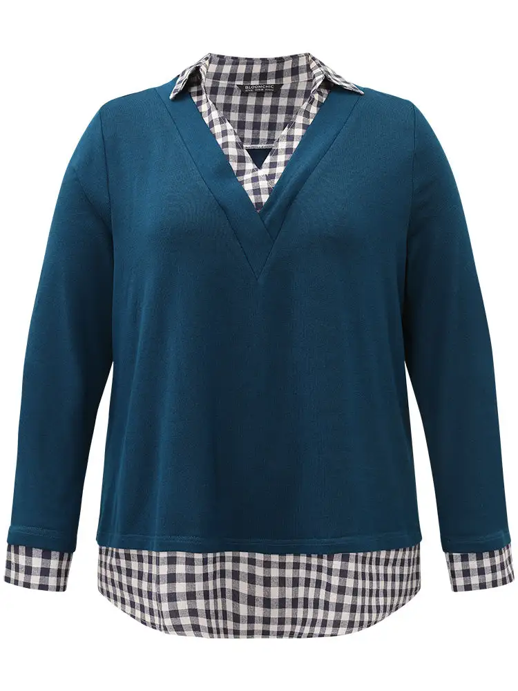 Gingham Patchwork Shirt Collar Arc Hem Sweatshirt