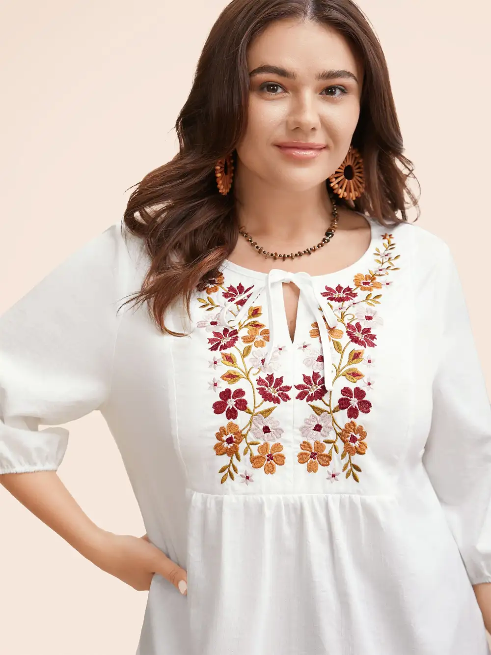 Floral Embroidered Tie Knot Lantern Sleeve Blouse