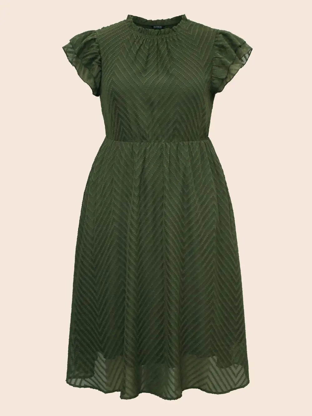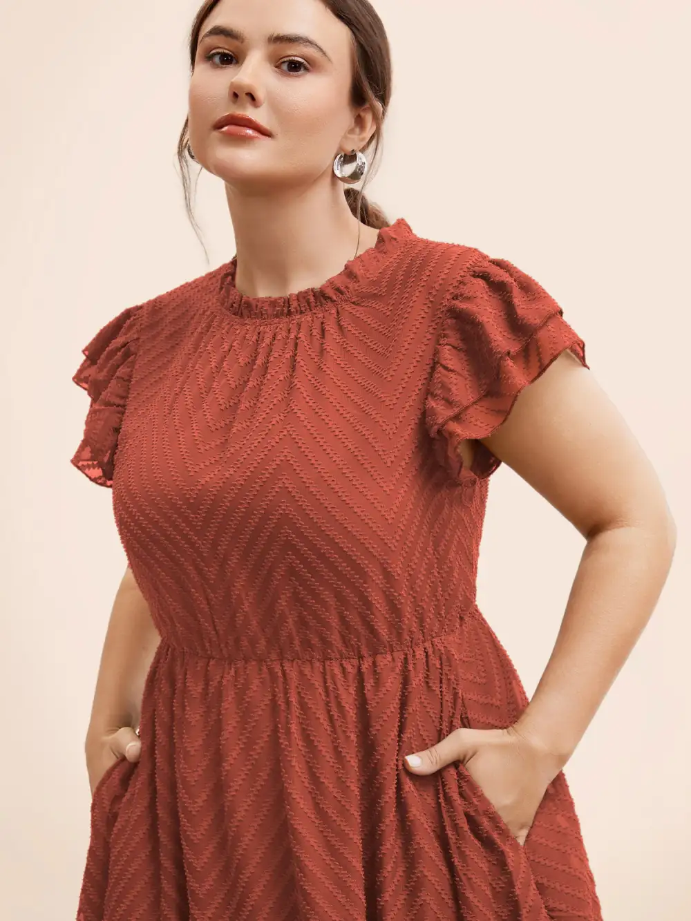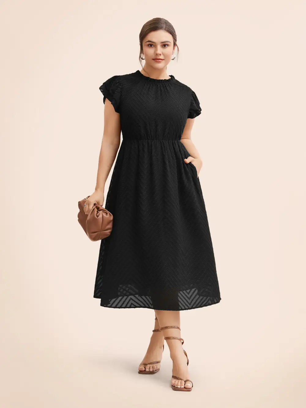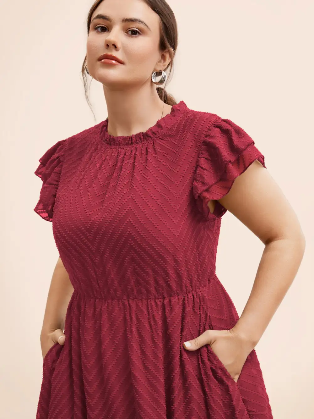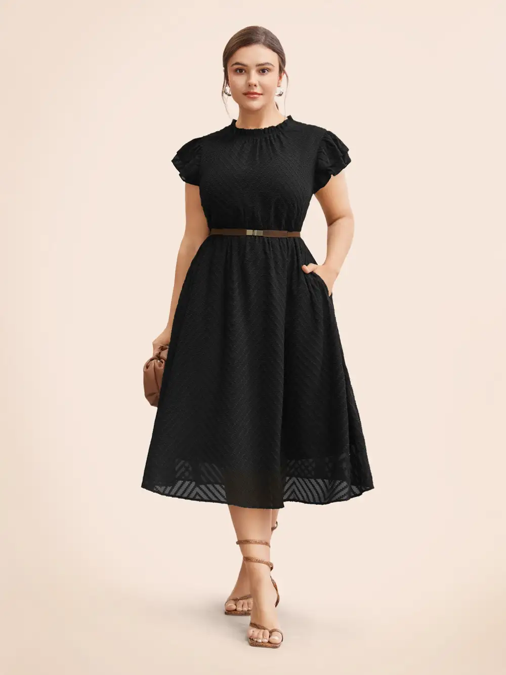 Plain Geometric Layered Sleeve Pocket Ruffle Mock Neck Dress