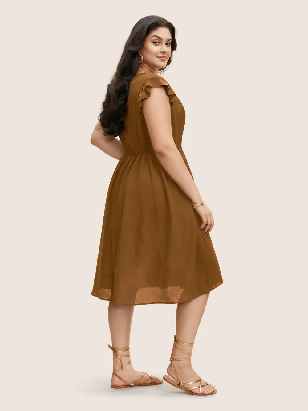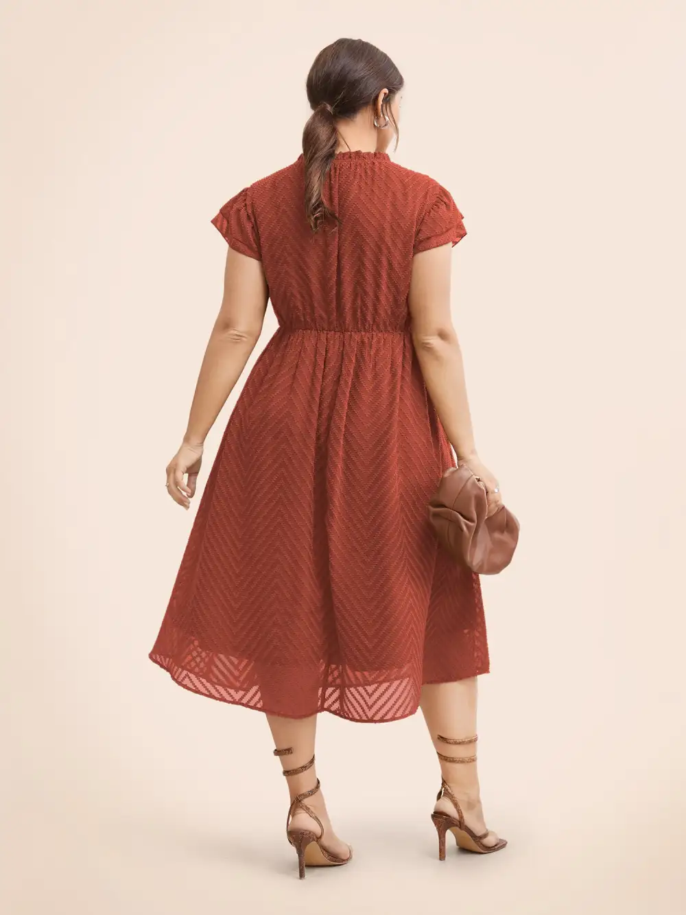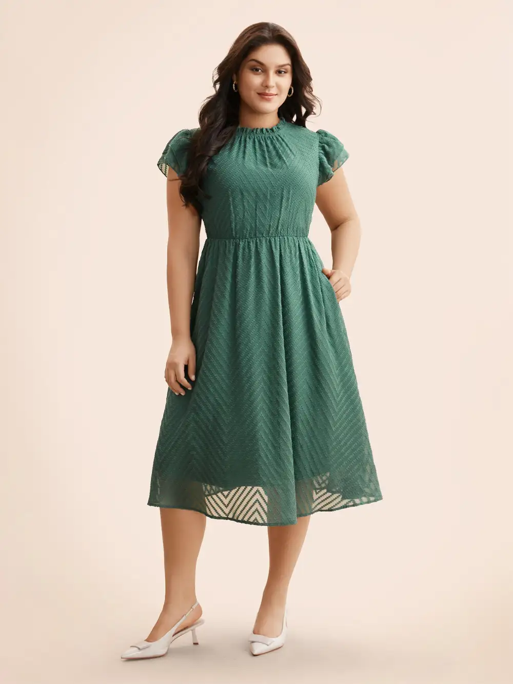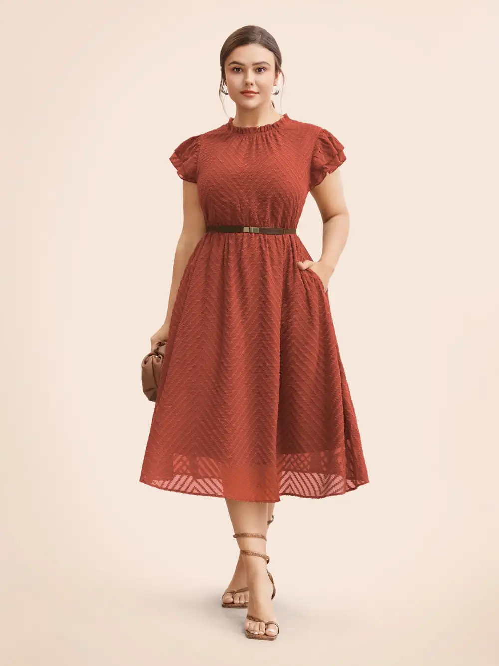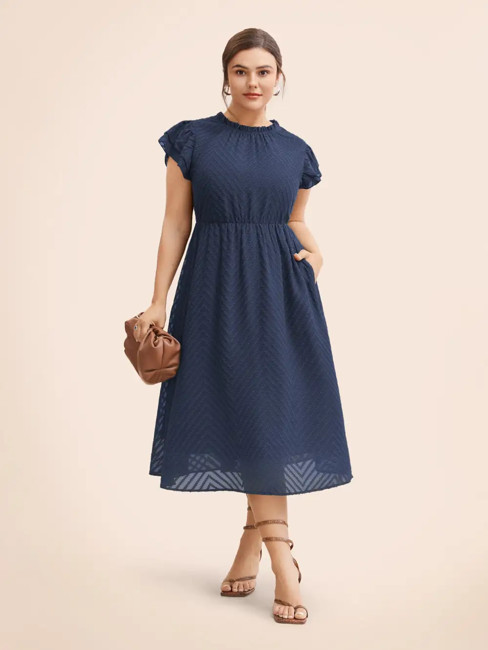 Plain Geometric Layered Sleeve Pocket Ruffle Mock Neck Dress