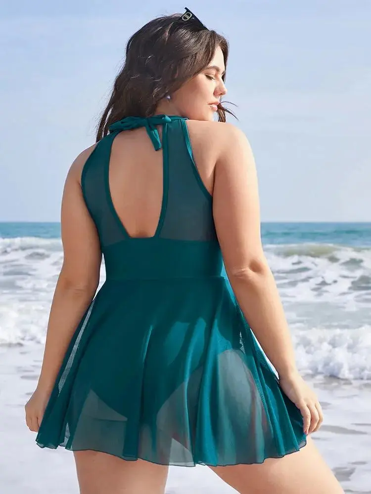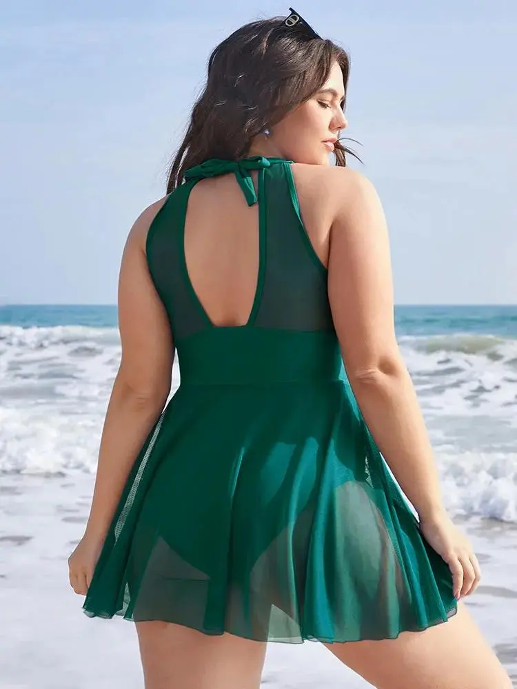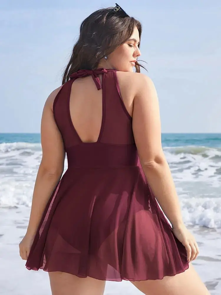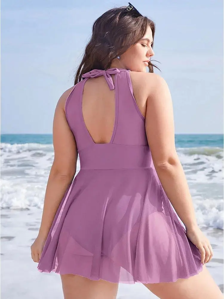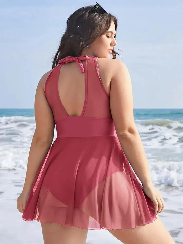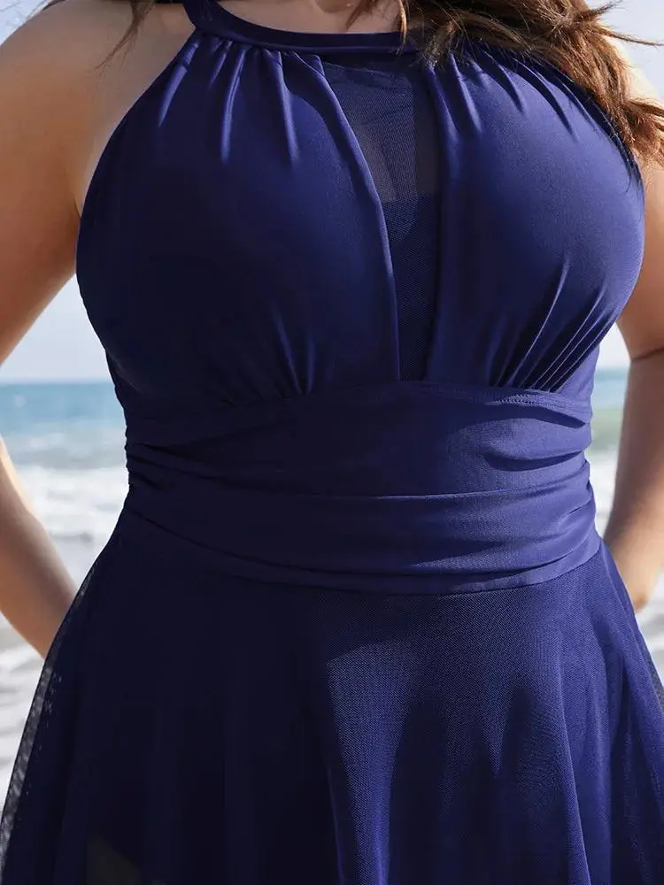 Knotted Back Mesh Insert Halter Swim Dress
