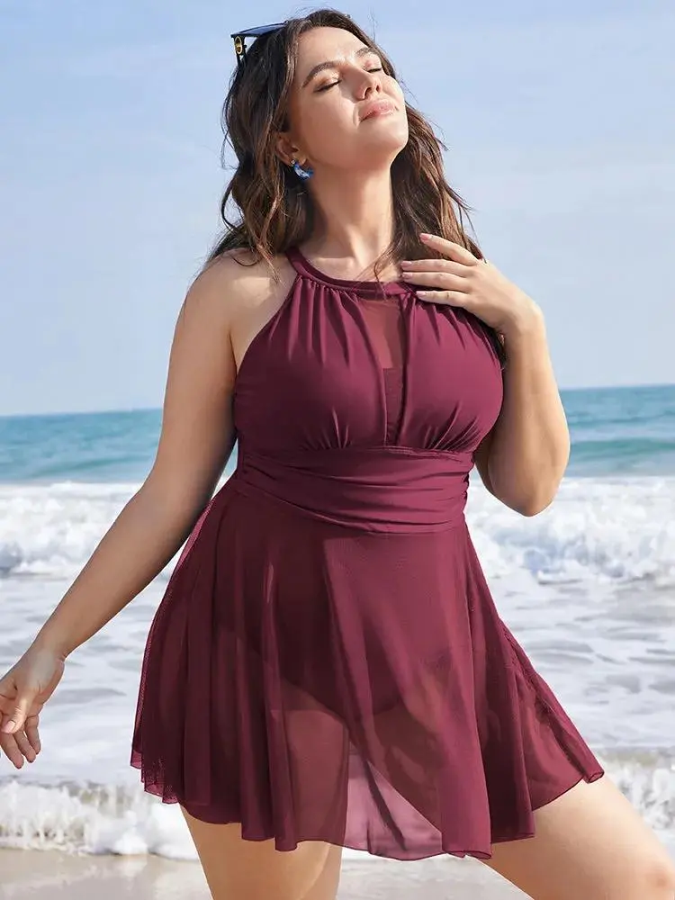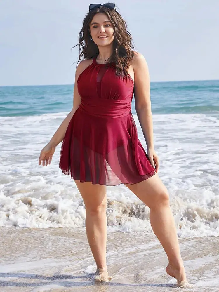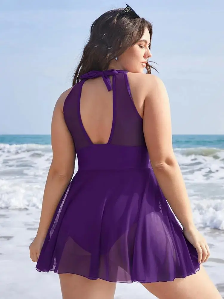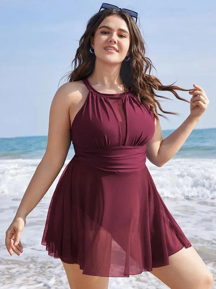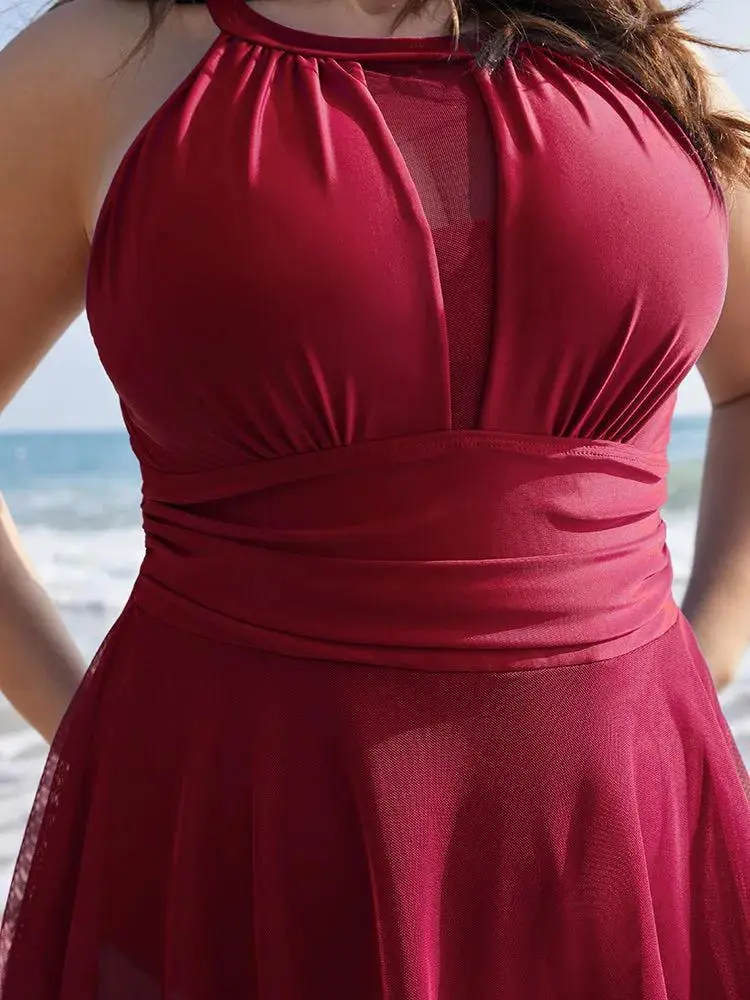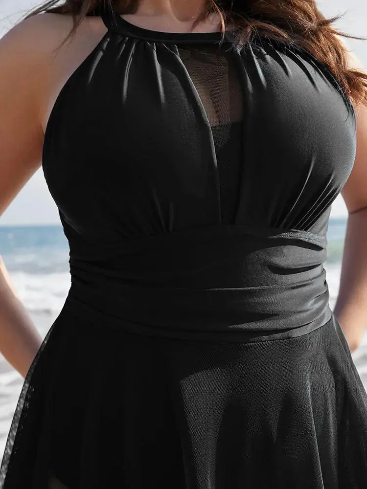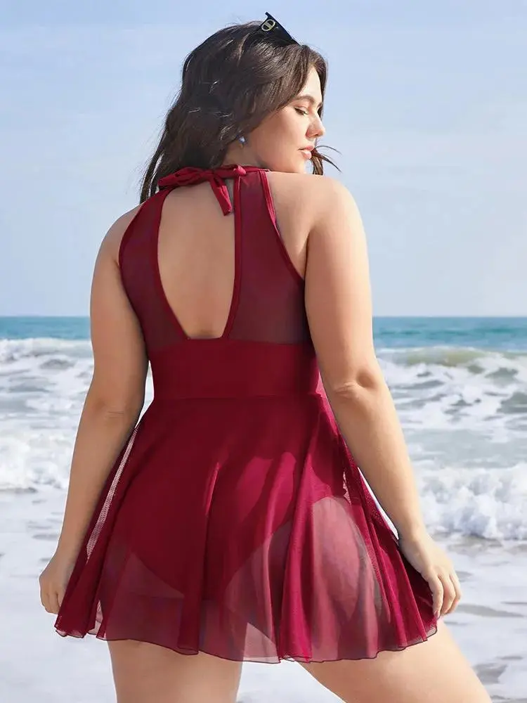 Knotted Back Mesh Insert Halter Swim Dress