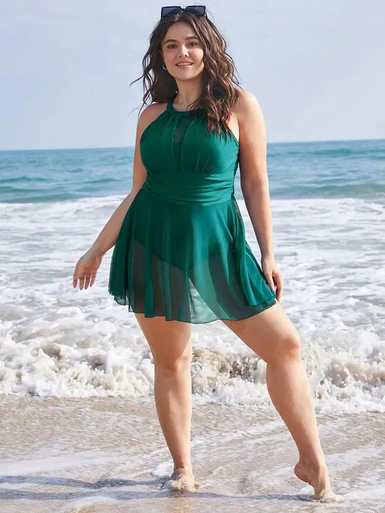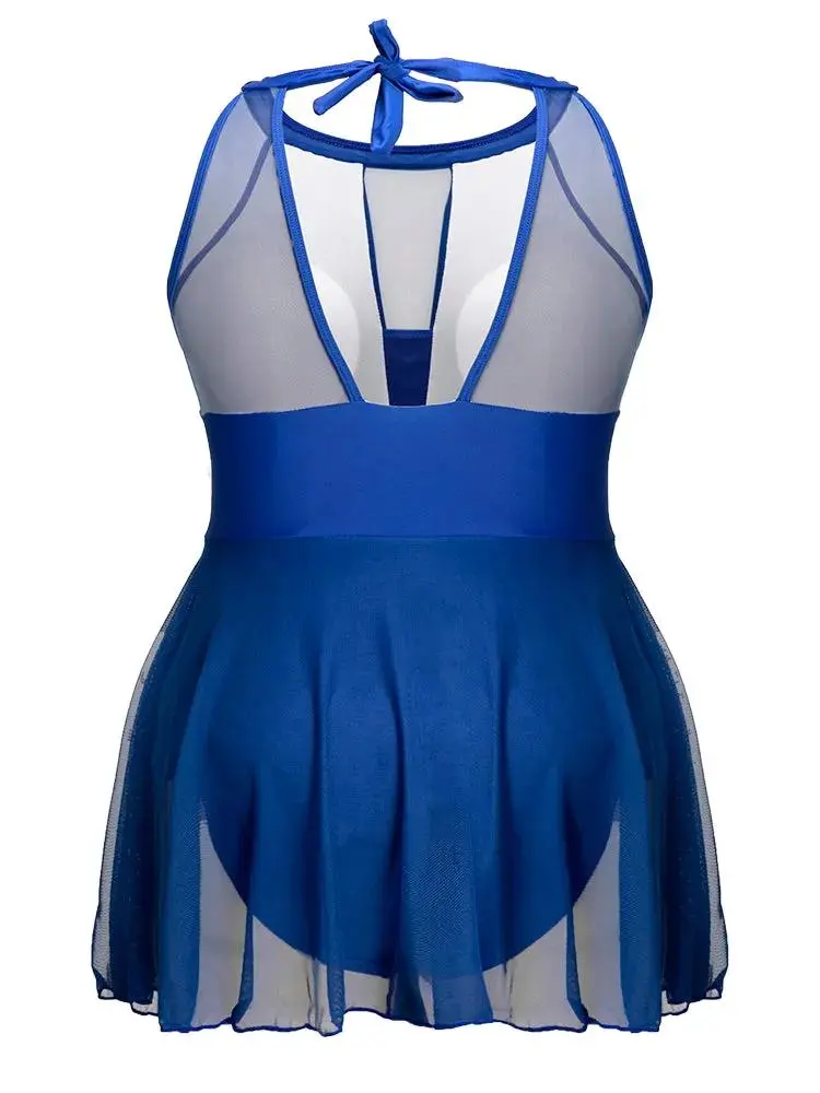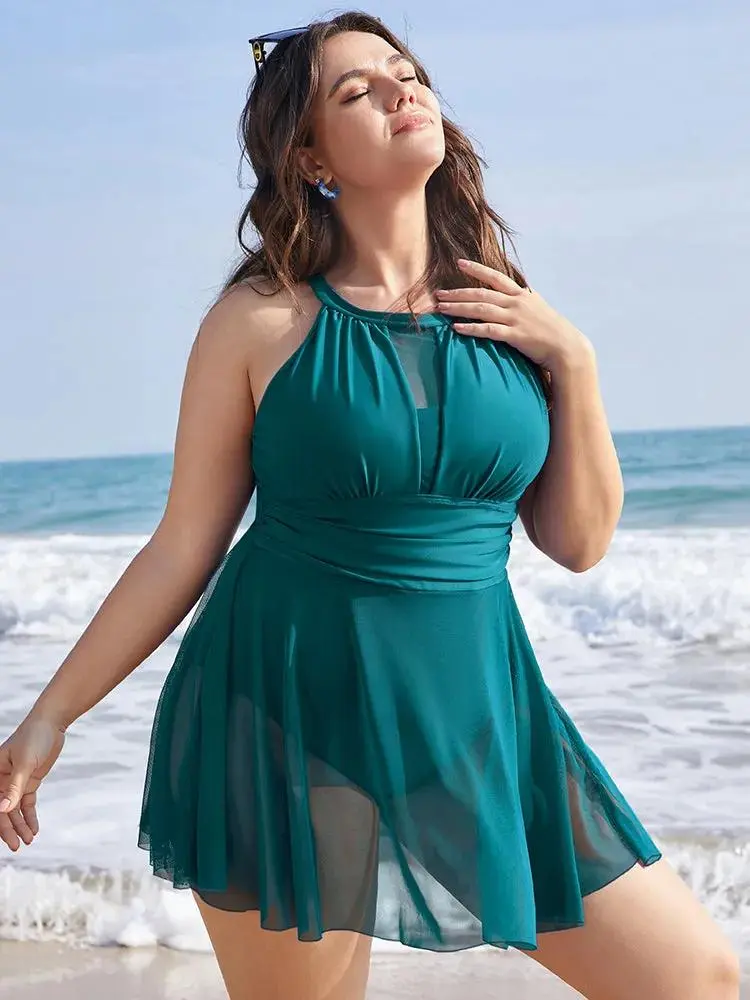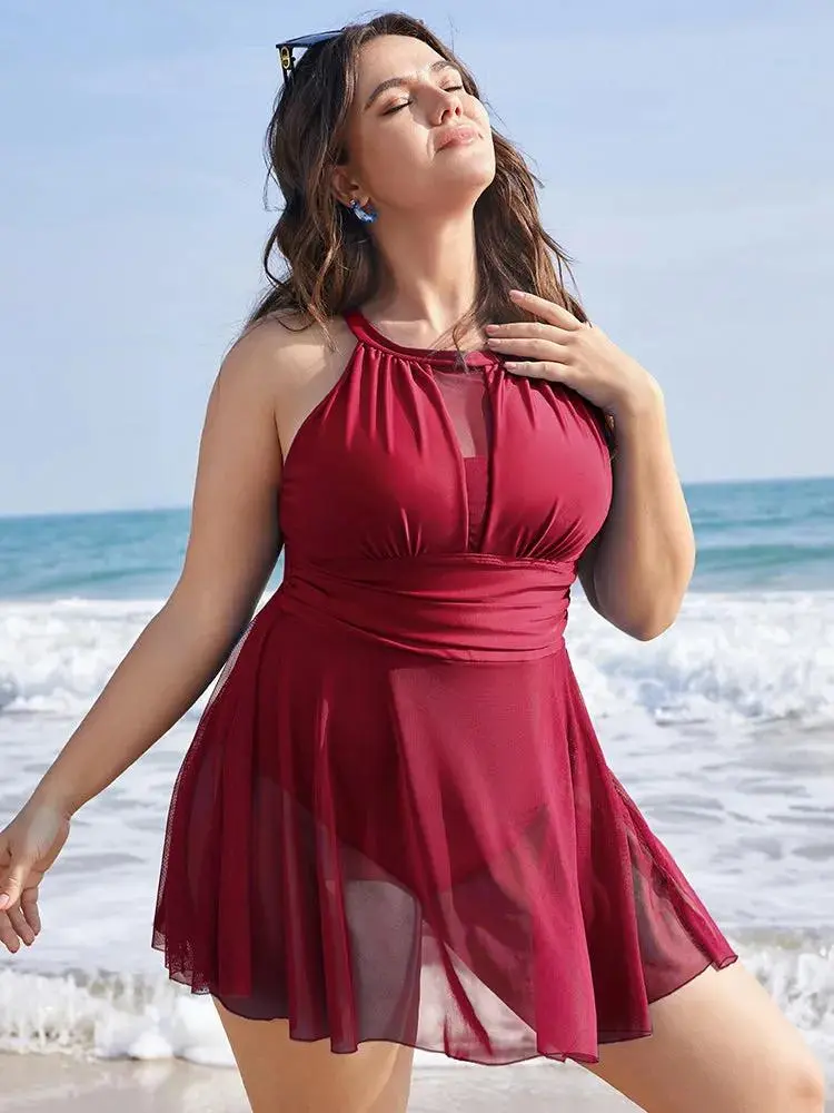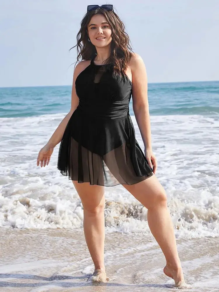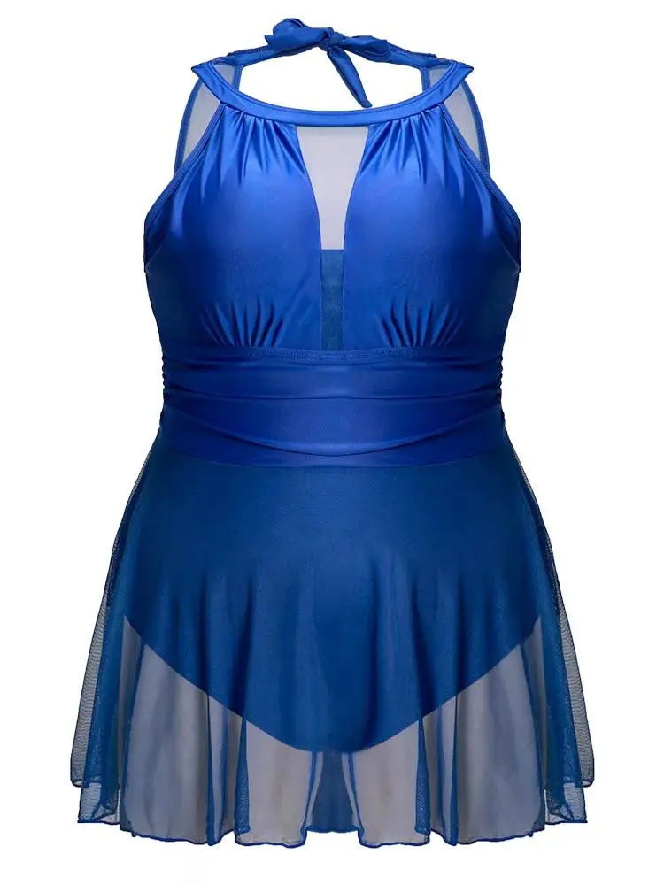 Knotted Back Mesh Insert Halter Swim Dress