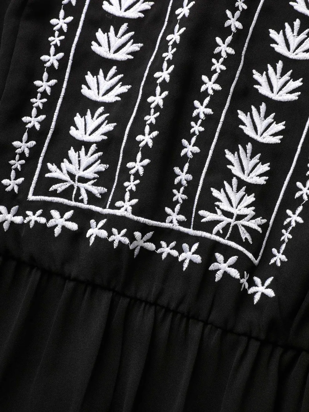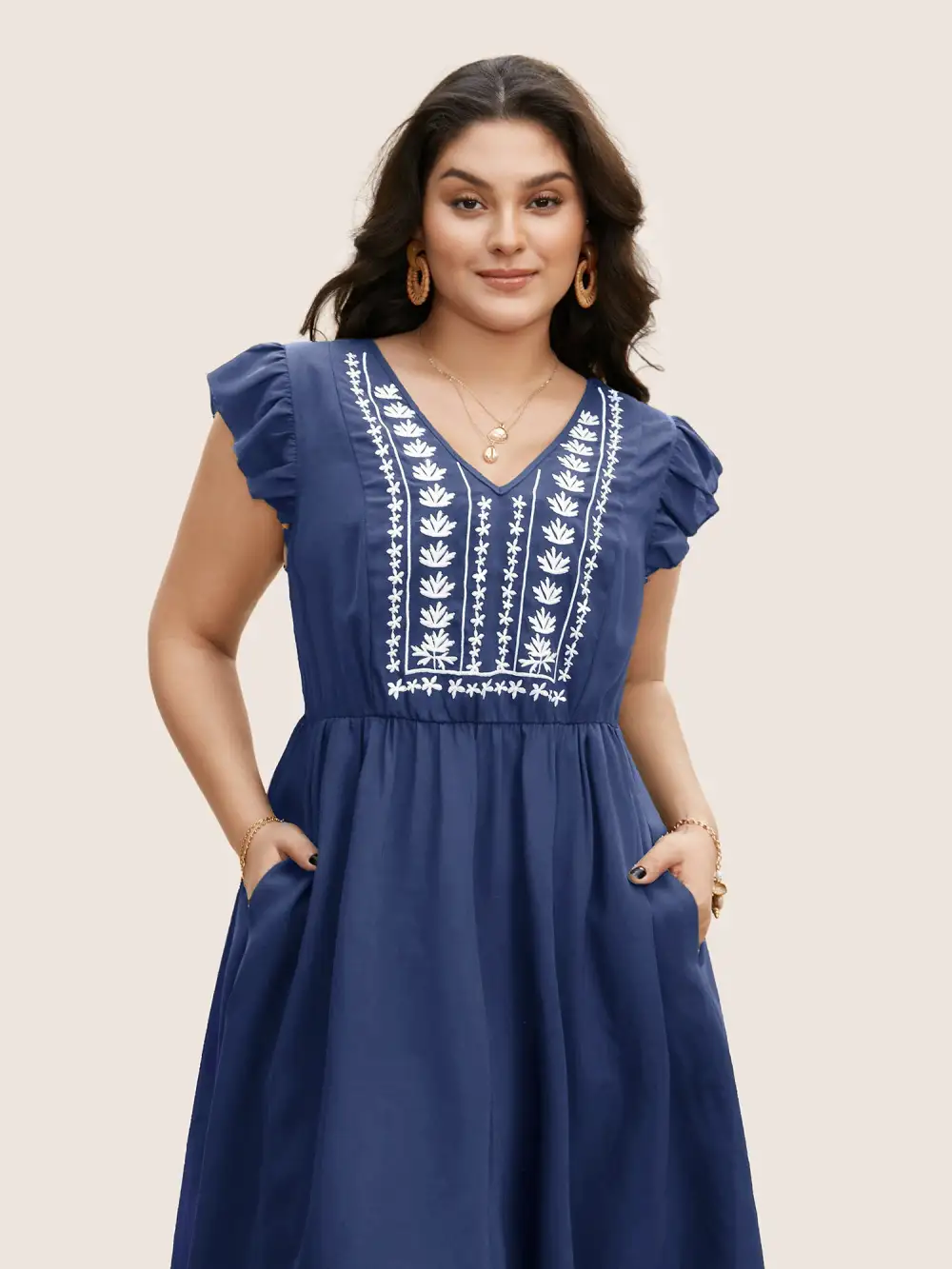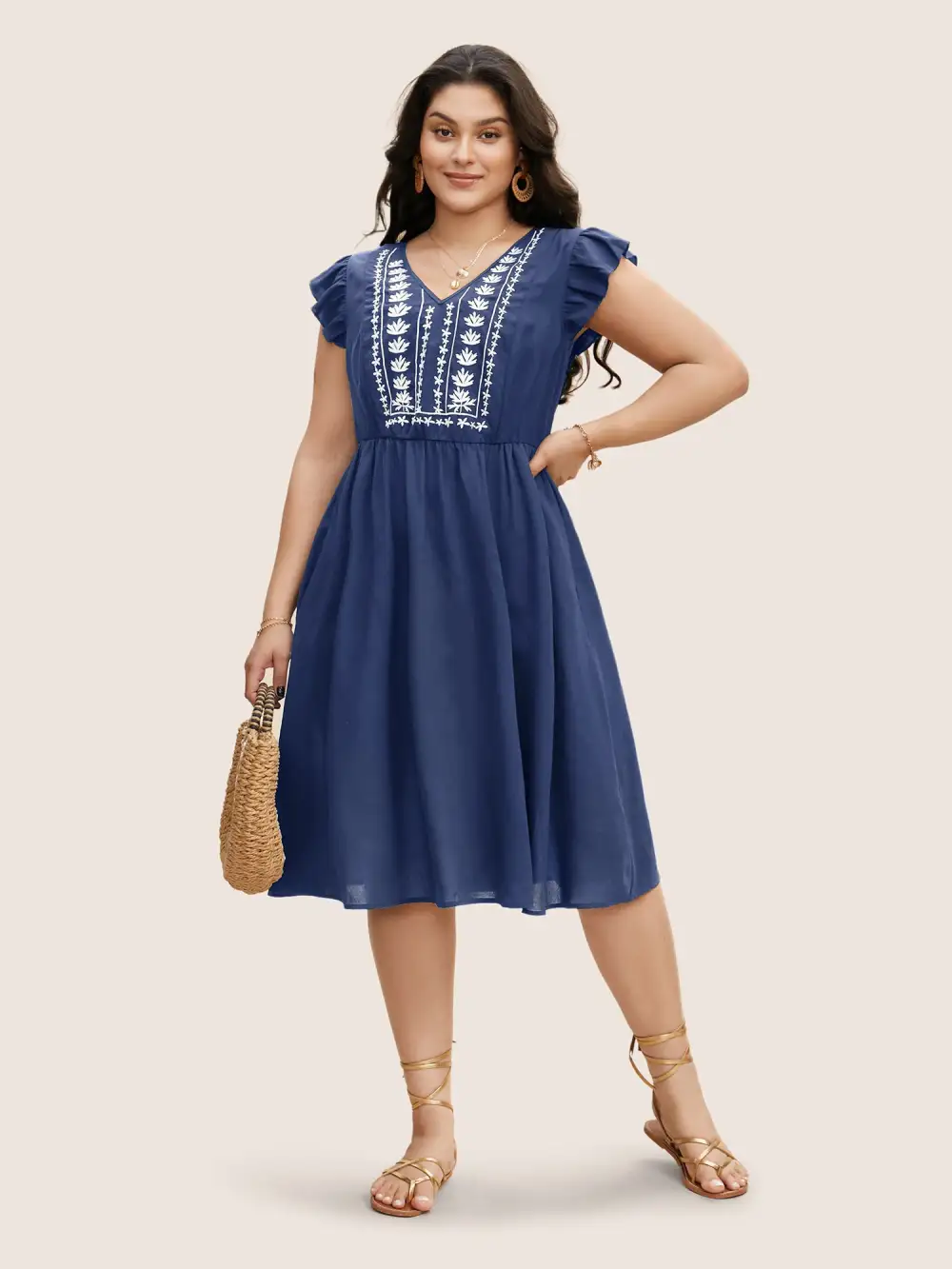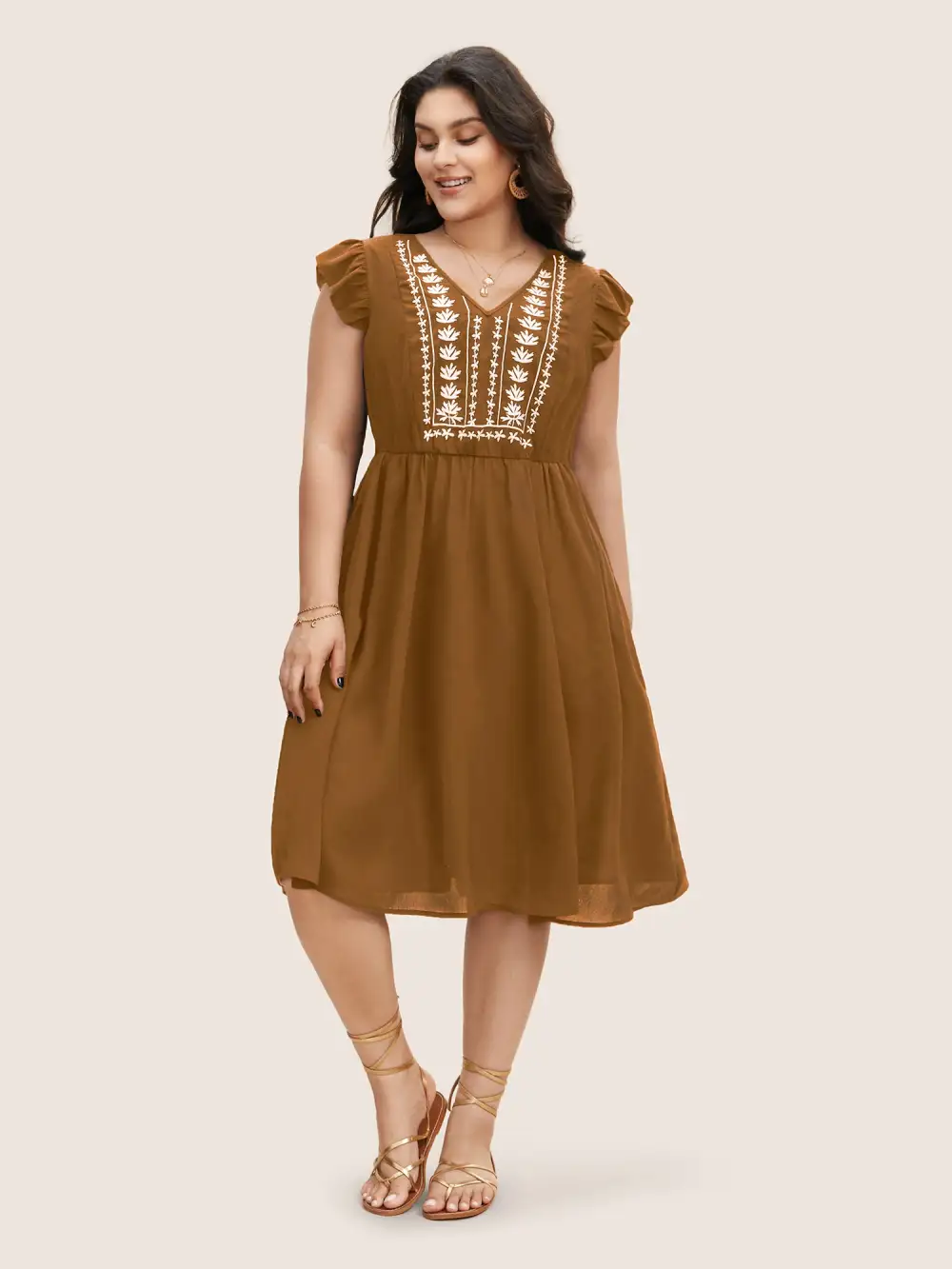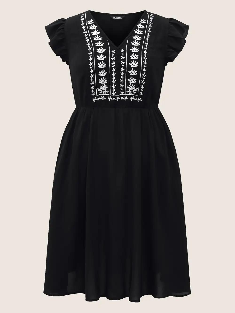 Floral Embroidered V Neck Ruffle Cap Sleeve Dress