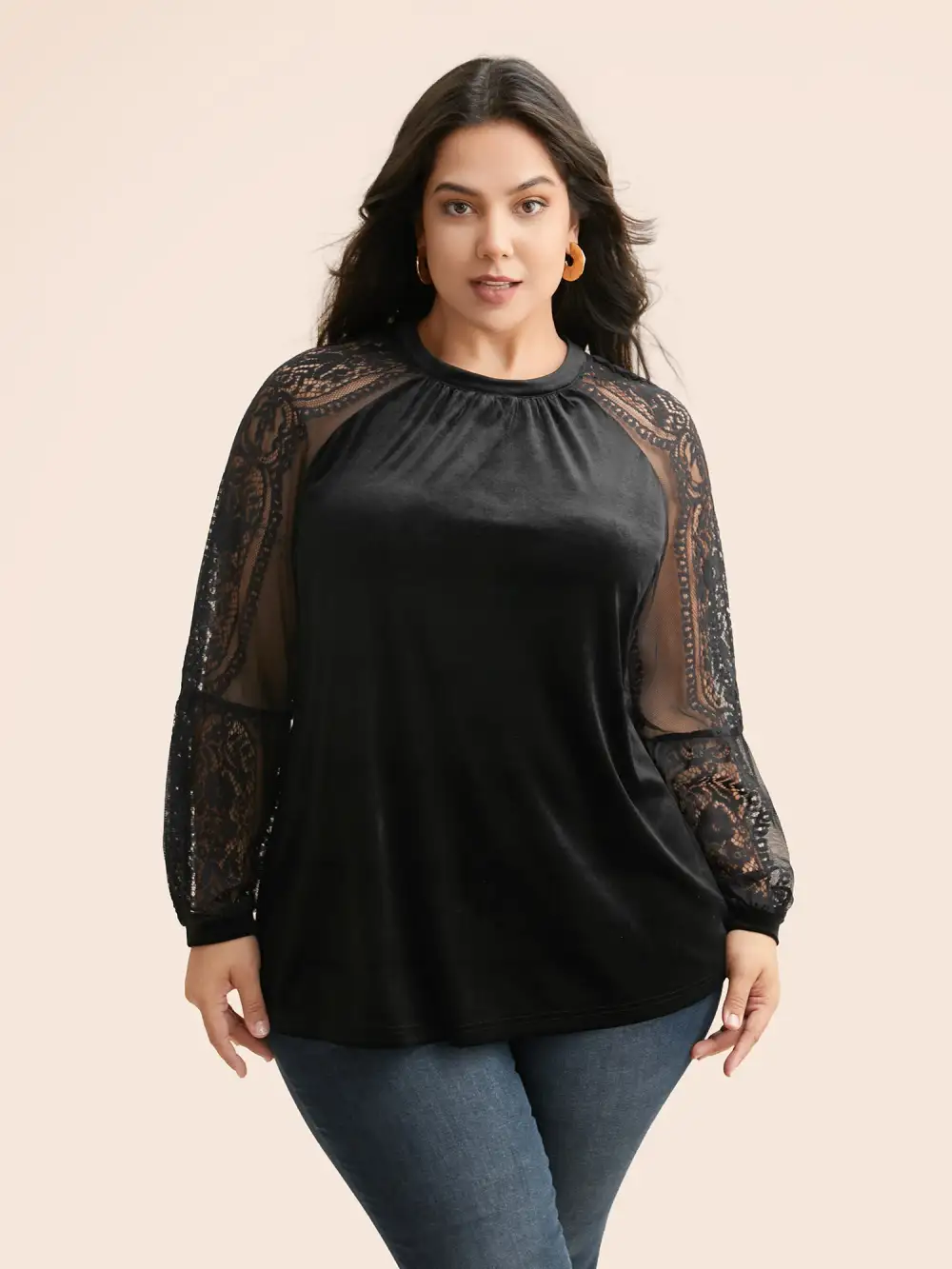 Lace Patchwork Velvet Raglan Sleeve Blouse