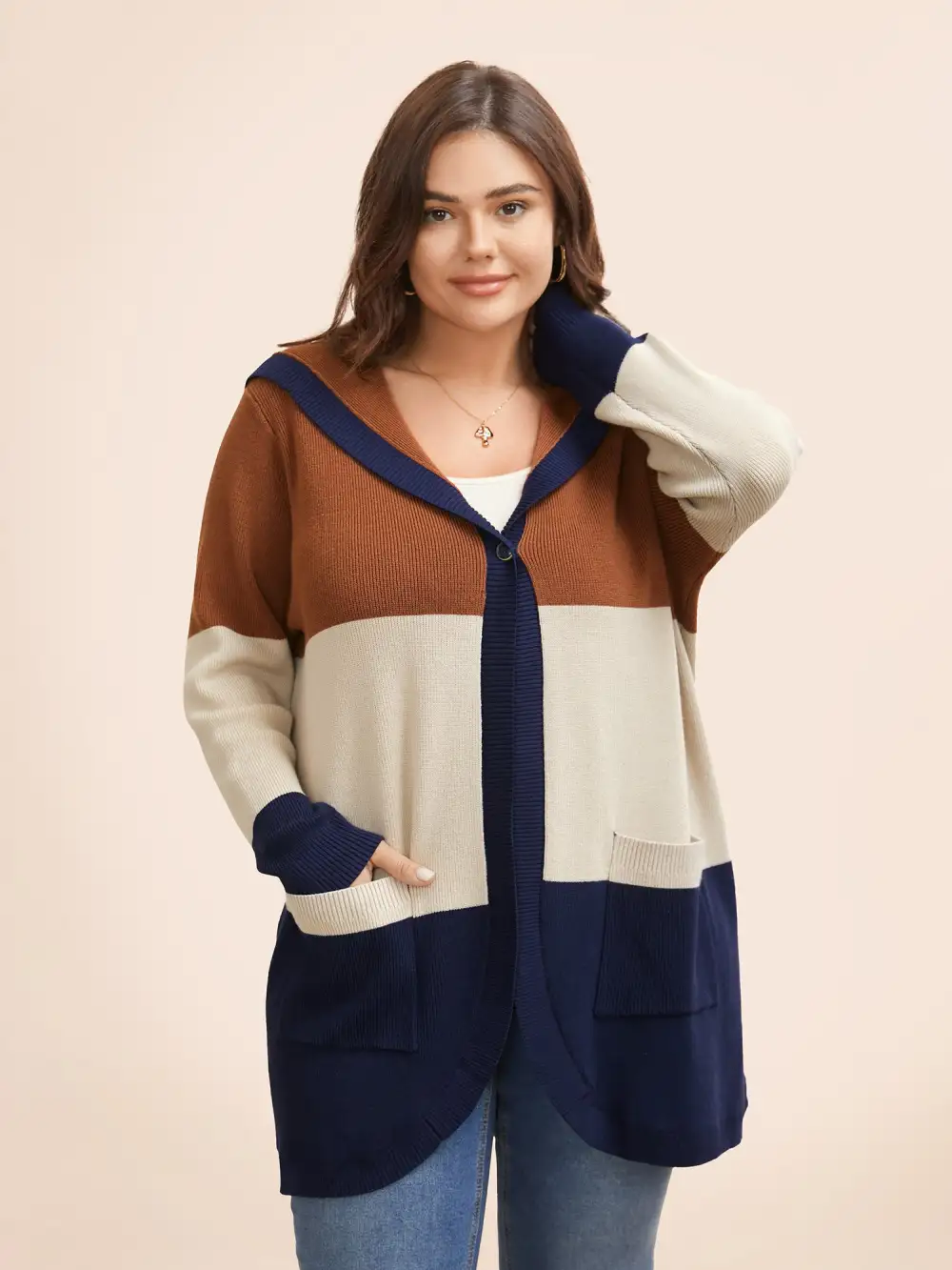 Colorblock Contrast Patched Pocket Hooded Cardigan