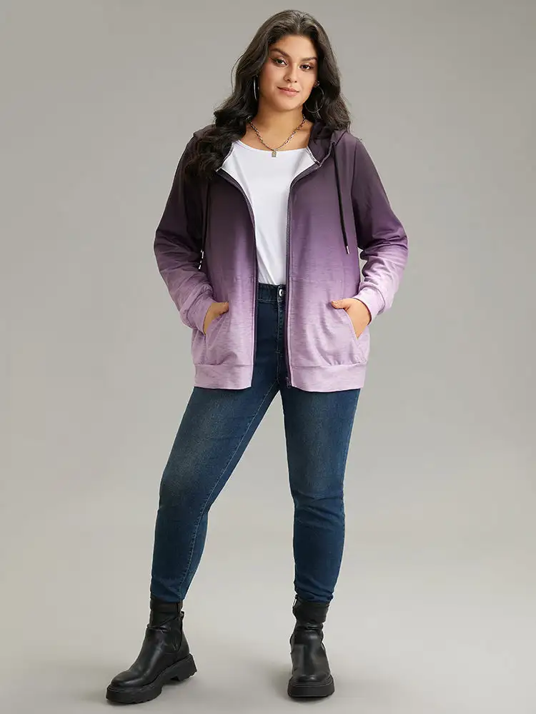 Ombre Hooded Zipper Drawstring Sweatshirt