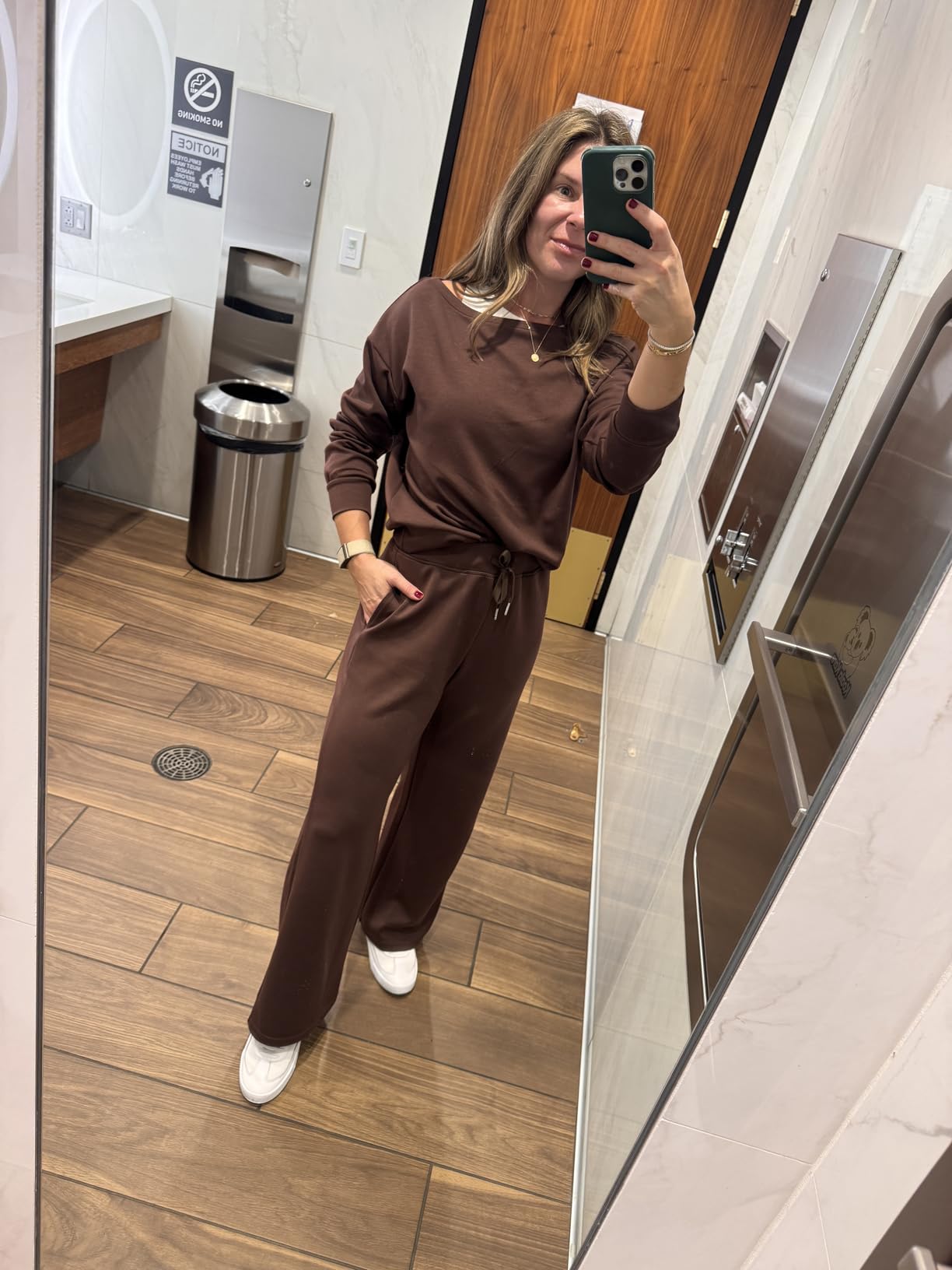 I absolutely love this outfit! The fabric is soft and thick, perfect for travel. I bought a small size because the top is quite loose, while the pants fit perfectly. The elastic waistband at the back is a bit tighter than I expected, but what I like is that the pants don't slip down even when I put my phone in my pocket! A medium size top would probably be too big. The color is a classic dark brown, very true to life. --Alexandra Strauss ⭐️⭐️⭐️⭐️⭐️