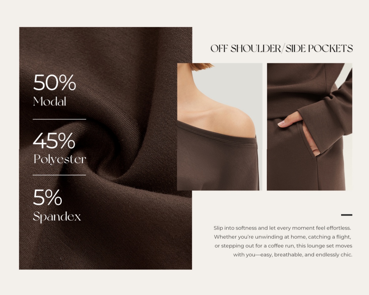 This set is super cozy and stylish at the same time. The fabric is soft, lightweight, and drapes nicely without looking sloppy. I love the off-shoulder design for lounging but still feeling put together. Runs just a touch long in the pants for me (I’m 5’2”), but nothing a quick hem or wearing with platform uggs won’t fix. --Joanna ⭐️⭐️⭐️⭐️⭐️