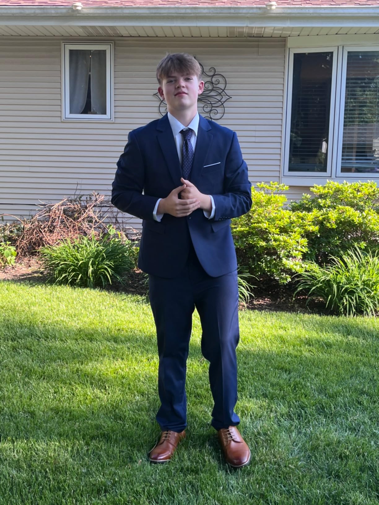 It's hard to find a slim-fit suit that suits a man like me who's on the slimmer side. We bought an XS, I think that's the size. The suit is very comfortable, the color is nice, and it's very lightweight. My son looks very handsome in it, and you can tell he's very happy with it.--Jeff Painter ⭐️⭐️⭐️⭐️⭐️